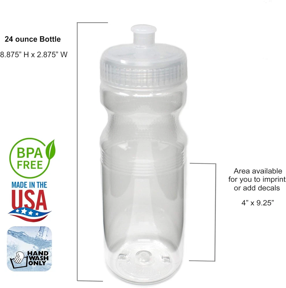 Store New Arrivals Add to Favorite View Feedback Contact Bpa-Free 24 Ounce Water Bottles, Bulk 30 Pack, Made in USA Description Age Range Description Adults and Kids Bottle Type Wide-Neck Capacity 24 Fluid Ounces Number of Items 30 Material Type Polyethylene Terephthalate Theme Sport Item Dimensions W x H 2.87"W x 8.87"H Finish Types Translucent Item Shape Round Unit Count 30.0 Count Material Polyethylene Terephthalate Container Type Bottle Additional Features Wide Mouth Opening Material Type Free Bisphenol A (BPA) Free Reusability Reusable Sport Type Soccer, Running, Gym, Basketball Color Clear Product Care Instructions Hand Wash Only Recommended Uses For Product Travelling Style Name Minimalist VALUE PACK : Bulk set of 30 semi-rigid lightweight 24 oz reusable drink bottles. MADE IN USA with BPA-Free PET plastic, Hand Wash Only INDOOR OR OUTDOOR: Great choice for bulk water bottles for team sports, parties and corporate events LOGO-FREE BLANK BOTTLES : These blank bottles have no logos so you can add your own design TRUSTED BRAND 100% SATISFACTION GUARANTY: We hope you love our products as much as we do but if for any reason you are not satisfied with your purchase, simply let us know and we’ll make it right Product Description With so much concern over cheap plastic drinking bottles that contain BPA (Bisphenol A), these bottles offer a safe alternative. These 24-ounce fitness drink bottles are BPA-free, lead-free, recyclable, and Made in USA. We believe you should taste your drink, NOT the plastic bottle. Lab-tested, these bottles have proven to be a safe choice for kids and adults. It offers a textured, indented section to allow for easy gripping and carrying. They are lightweight. The screw-on lid is made with a push-pull top. The lid is top-shelf dishwasher safe, but the bottle is hand wash only; not dishwasher safe as the heat can deform the plastic. Measures 8 7/8" tall x 2 7/8" diameter (with lid on) Large mouth opening is 2 1/8" wide Logo Free; Imprintable area measures 4" high x 9 1/4" circumference Lightweight BPA-Free Water Bottles for Exercise, Teams, or Everyday Use Translucent Look The translucent look of these BPA-Free water bottles is functional as well as attractive. Since they are see-through, you are able to track how much water you've drank and when a refill is necessary. Wide Mouth Opening Featuring a wide mouth opening, so you can easily add full-size iced cubes and the wide opening makes cleaning a breeze compared to narrow opening bottles. Fits Most Cup Holders These bottles easily fit car cup holders and bike cages, so they are easy to take with you where ever you go. Lightweight Bottles Want to keep your load light? These bottles weigh in at just 2 ounces. They fit comfortably in most bottle holders as well as in your hand. So where ever you go outside, and by whatever means you travel, they won't weigh you down. A Favorite for Birthday Party Favors Stuff these see-through bottles with goodies for your child's next birthday party and they'll make a great part of your birthday party favor. Don't use throw-away bags or containers, use something they can use again and again. Customize with your party theme or each guest's name to really personalize their goodies. Personalize for Your Sport Teams These blank bottles are easy to customize for your favorite local sport teams - child or adult. Add players names, team logo, motivational sayings, whatever! Be a winner when you give these personalized bottles as a gift. Promote Your Yoga Studio or Fitness Club Water bottles are a great marketing promotion for your yoga studio or fitness center. Send a positive message and keep your customers hydrated. Add your logo or design to these affordable bottles and use to attract or retain clients. Add Your Logo or Design for Company Giveaways Since these bottles are blank, it allows you to customize for your next corporate event. Add your logo, add a tag line, add a design for a special company promotion or special event. They are affordable to use as a giveaway for your next event whether it's big or small. Birthday Party Favors Team Gifts Promote Your Studio Corporate Giveaways 24-ounce Water Bottles Available in a variety of colors! ~ Choose your favorite color for the day ~ Identify whose bottle is whose ~ Choose a color to coordinate for your special event or sport team Add your Logo, Design, Name or Whatever Makes you Happy! Stay Fit, Stay Hydrated We are a small, family-owned and operated company in the United States. Established in 2009, our company proudly focuses on offering products made in the USA. The affordable plastic drinkware that we provide is also tested to meet safety guidelines. Our goal is to provide safe, affordable drinkware to keep you and your children hydrated during sports, workouts, parties, around the house, or while enjoying outdoor fun. Customize Your New Water Bottles These Logo-Free Bottles are a Blank Slate for You to Personalize These 24-ounce water bottles arrive without any logos on them, so that you can personalize them if you wish. Add your customization simply with permanent markers, waterproof dishwasher-safe labels, or have them imprinted. Decorate for fun or for a special occasion. Party Favors Sport Teams Special Events Classrooms and More! ABOUT US We offer the best prices around on high quality products. Our E-store includes media such as books, movies, music and games while offering electronics, toys, sporting apparel, clothing, tools, general home, garden items and more. SHIPPING We are always working hard to ensure your package arrives as soon as possible. Please understand that some factors like weather, high postal traffic, and the performance of shipping companies are outside of our control. We offer free shipping to the lower 48 states and ship within 2 business days of payment, usually sooner. We do not accept P.O. Boxes. Please provide a physical address. For shipping outside of the continental USA, we only use eBay's Glo