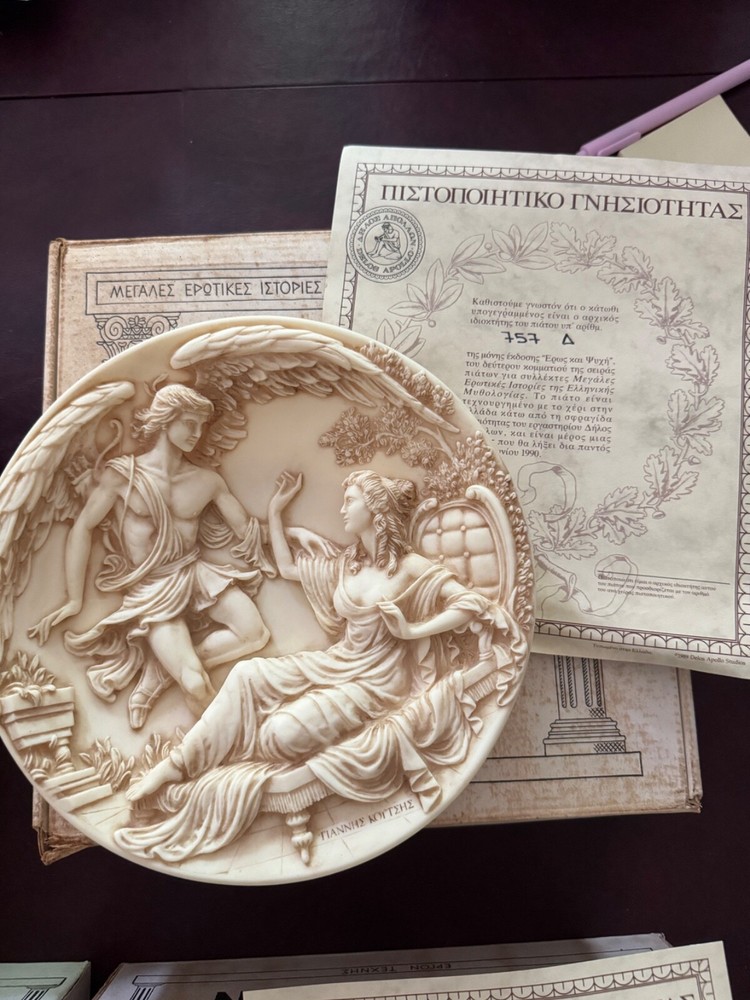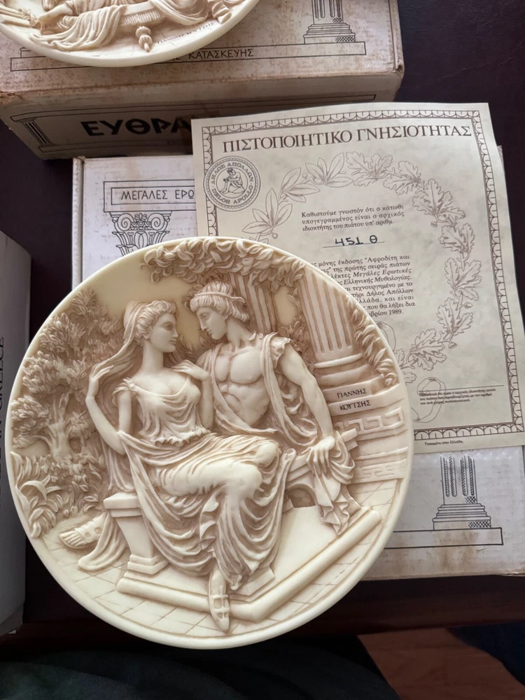 Absolutely stunning set of collector plates! The intricate Greek-inspired designs and elegant beige tones make them a perfect display piece. The marble-like material adds a touch of classic sophistication, and the 1980s art pottery vibe gives them a unique charm. A must-have for collectors who appreciate timeless craftsmanship and cultural artistry. Love how they elevate any space!