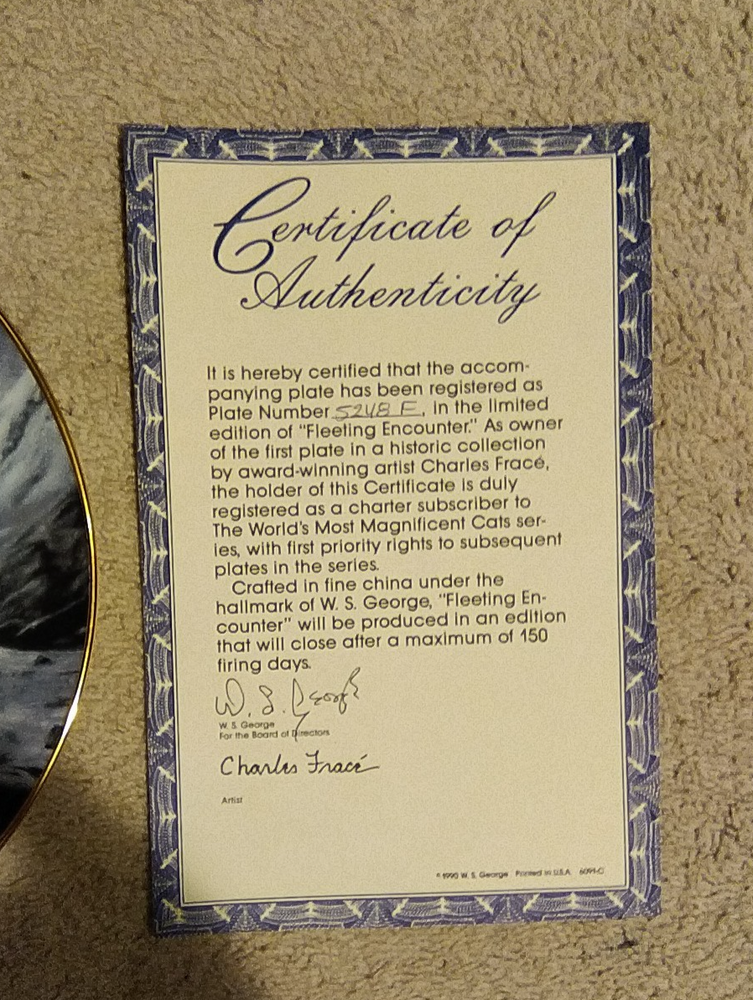 The product is a vintage collector plate from Bradford Exchange featuring a snow leopard design from the "World's Most Magnificent Cats" series. Made of ceramic, the round plate has a diameter of 8.5 inches and comes with a stand. With a decorative style and themes of cats, this collector plate is part of an art pottery production style and was manufactured in the late 20th century, specifically in the 1990s. This multicolored plate is perfect for all occasions and adds a touch of American culture to any collection of decorative collectibles. You Will Receive The Item(s) Pictured. We Do COMBINE SHIPPING So Take A Look At Our Other Items. If You Would Like To Take Advantage Of The COMBINED SHIPPING Please Wait For Invoice Before Payment. If You Have Any Questions We Will Be Happy To Answer Them.
