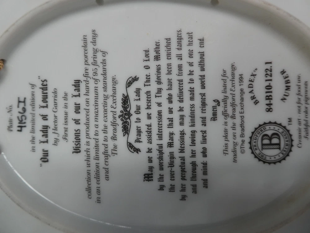 BRADFORD EXCHANGE PORCELAIN OVAL WALL PLATE MARY OUR LADY OF LOURDES GOOD CONDITION STAMPED TO BACK 21.5 CM x 16.5 CM SEE PHOTOS FOR BEST GUIDE TO CONDITION I AM LISTING SOME OTHER ESTATE PIECES I can combine for postage. CHECK MY OTHER LISTINGS FOR MORE