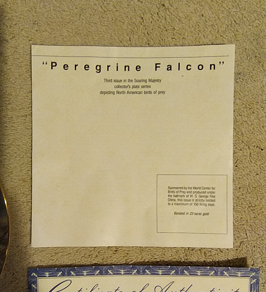 The Bradford Exchange Peregrine Falcon Soaring Majesty Charles Frace Plate from 1991 is a round ceramic collector plate featuring a bird theme. This decorative piece measures 8.5 inches in diameter and comes with a stand. The multicolor plate showcases a wild animal design typical of American culture, making it a unique addition to any collector's set from the late 20th century. The art pottery production style adds a touch of craftsmanship to this vintage collector's item. You Will Receive The Item(s) Pictured. We Do COMBINE SHIPPING So Take A Look At Our Other Items. If You Would Like To Take Advantage Of The COMBINED SHIPPING Please Wait For Invoice Before Payment. If You Have Any Questions We Will Be Happy To Answer Them.