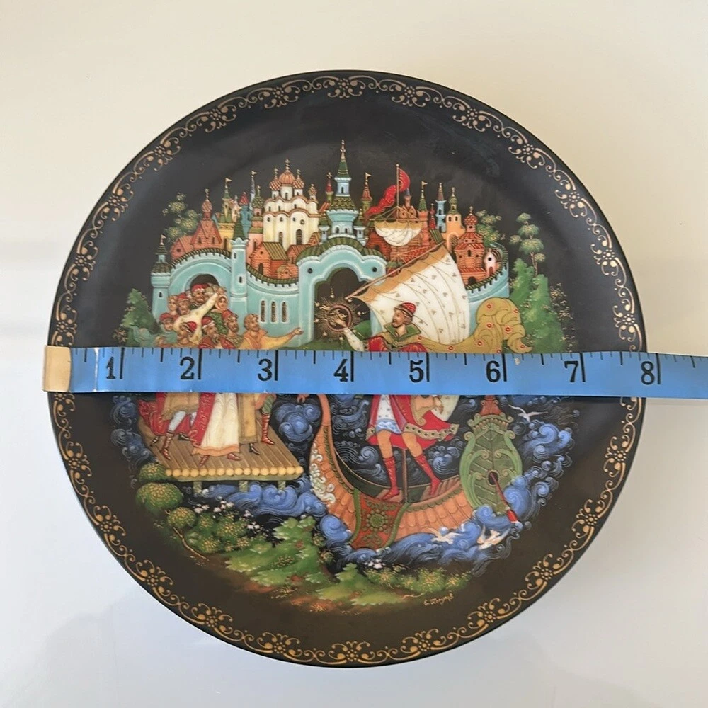 Vintage Porcelain Plate “Sadko" from the Russian Legends Collection, Plate # 9 Ninth plate in the Series from the Russian Legends Collection of limited edition plates by Artisan Evgeniy Polupov. Year / Name: 1990 Sadko Artist: Evgeniy Polupov Maker/ Manufacturer: Palekh Medium: Porcelain Signed The plate is 8 inches in diameter. Excellent preowned condition: no cracks, no chips. The plate will come as-is. Stand, box or booklet is not included.