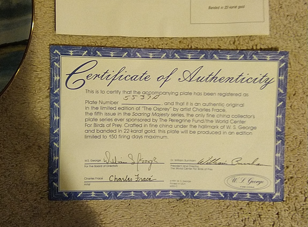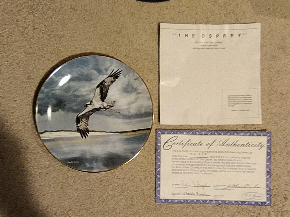 Elevate your collection with the Bradford Exchange Soaring Majesty decorative plate, featuring the exquisite artwork of Charles Frace. This round ceramic collector's item, measuring 8.5 inches in diameter, showcases a vibrant multicolor palette that brings the majestic allure of an osprey in flight to your display. Crafted in the 1990s, this piece embodies the artistry and quality synonymous with the Bradford Exchange brand. The plate is a testament to the decorative style of the late 20th century, with a design that celebrates American culture and the beauty of wild animals. Complete with a stand for easy display, it's an ideal keepsake for all occasions that will resonate with enthusiasts of art pottery and vintage collectibles alike. You Will Receive The Item(s) Pictured. We Do COMBINE SHIPPING So Take A Look At Our Other Items. If You Would Like To Take Advantage Of The COMBINED SHIPPING Please Wait For Invoice Before Payment. If You Have Any Questions We Will Be Happy To Answer Them.