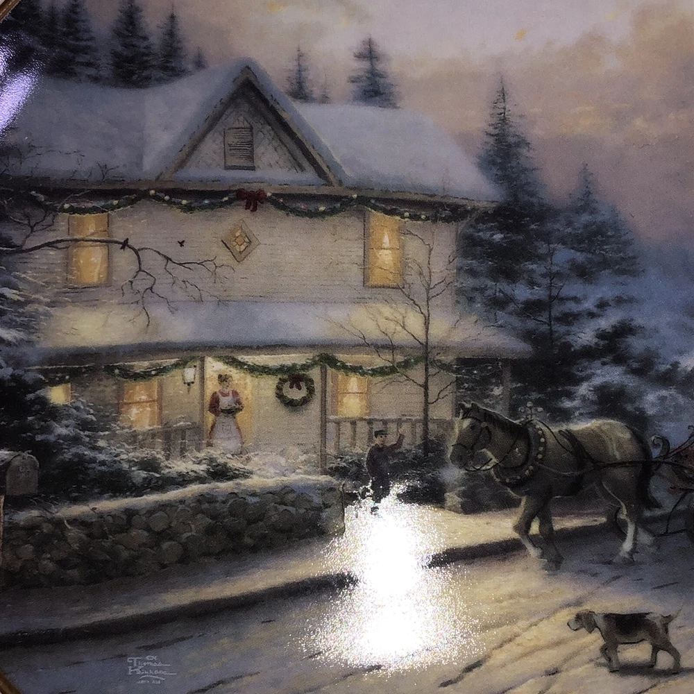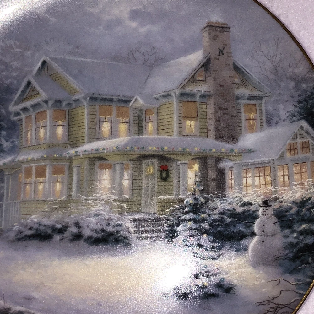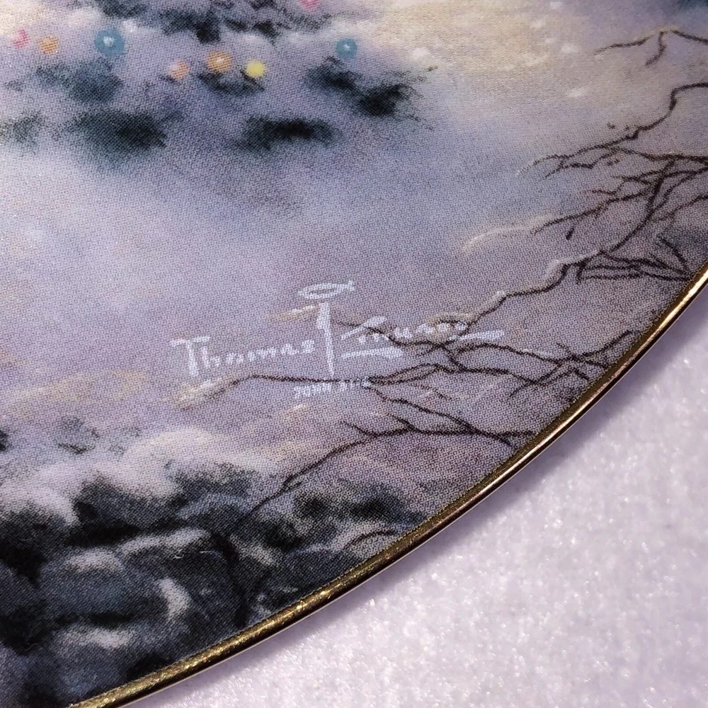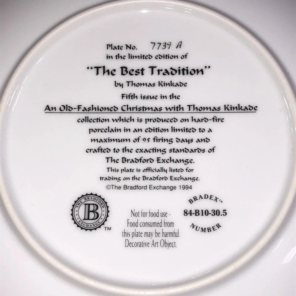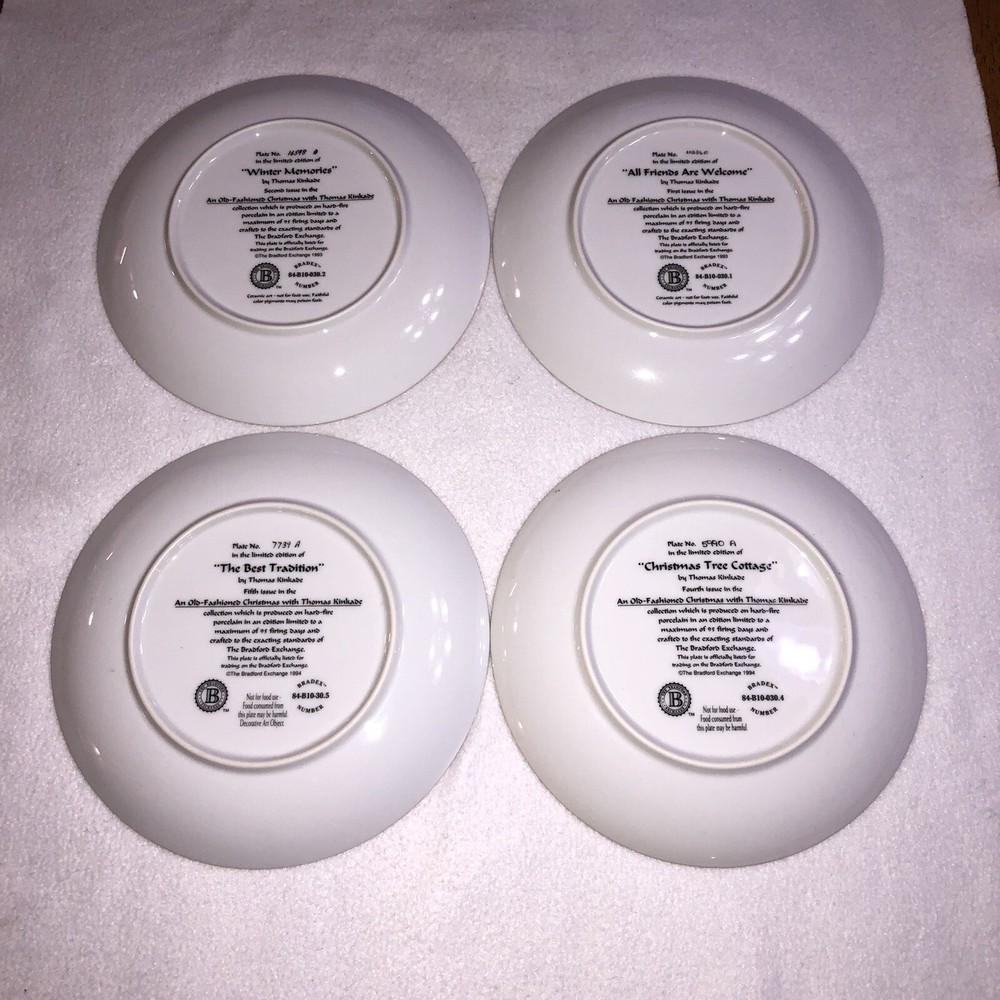 This is a stunning lot of 4 Bradford Exchange decorative plates by Thomas Kinkade. These plates are from his "An Old Fashioned Christmas" series. They date from 1993 and 1994. Included in the lot are: -1993 All Friends Are Welcome, the first issue in the series. The plate is numbered 10236E and has a BRADEX NUMBER of 84-B10-030.1 - 1993 Winter Memories, the second issue in the series. The plate is numbered 16598A and has a BRADEX NUMBER of 84-B10-030.2 -1994 Christmas Tree Cottage, the fourth issue in the series. The plate is numbered 5990A and has a BRADEX NUMBER of 84-B10-030.4 - 1994 The Best Tradition, the fifth issue in the series. The plate is numbered 7739A and has a BRADEX NUMBER of 84-B10-030.5 The plates are edged in a gold trim and measure approximately 8 inches. They are in good vintage pre-owned condition. There are no nicks, chips, cracks or repairs. Gold trim shows little to no wear. These no longer include their original boxes or certificates. This is a plates only listing. Please review and enlarge all photos for additional details, views and measurements. Shipped via USPS Ground Advantage.