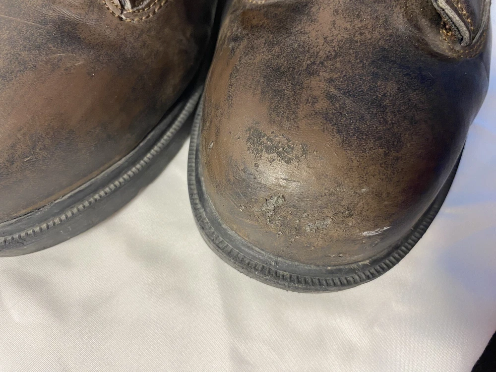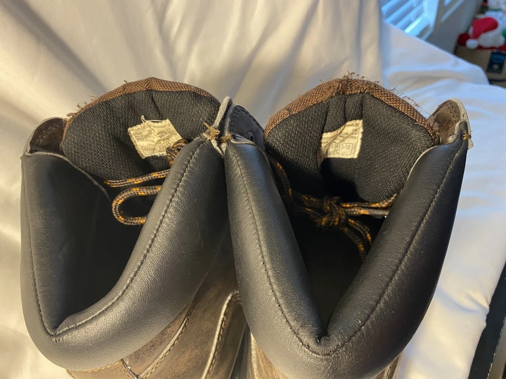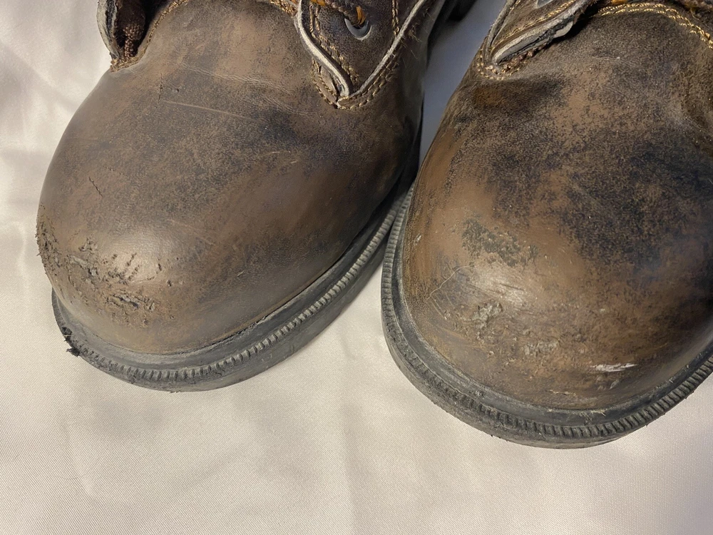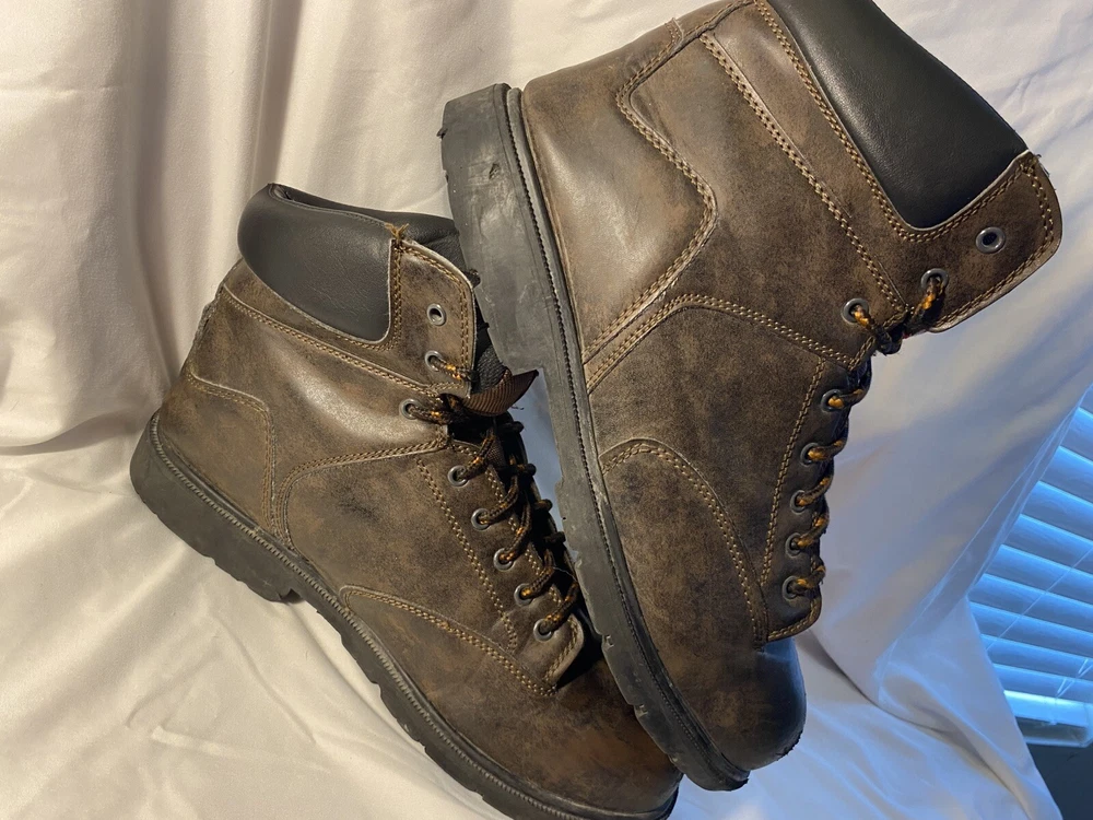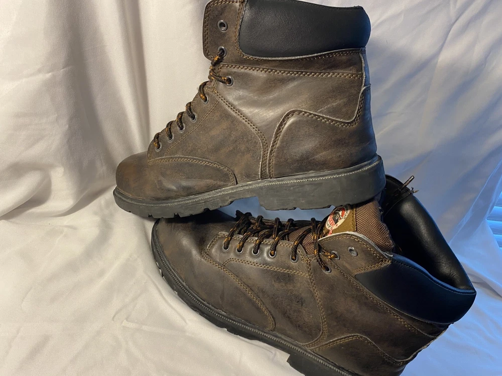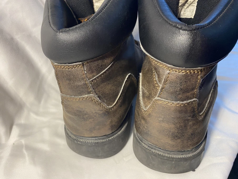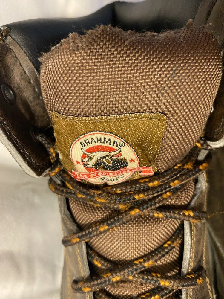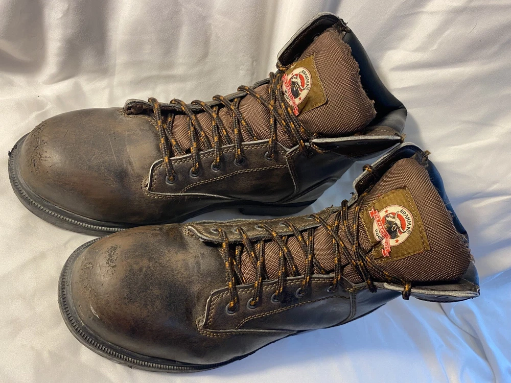 The Brahma Men's Size 14 Steel Toe Work Boots are designed with a round toe shape and lace-up closure for a secure fit. These mid-calf combat-style boots feature a steel toe for added protection in a work environment. The brown boots are suitable for casual or workwear occasions and have accents of laces. Made from man-made materials with a synthetic insole, these boots are sturdy and durable for outdoor activities in all seasons. Some wear on the boots, as seen in pictures.