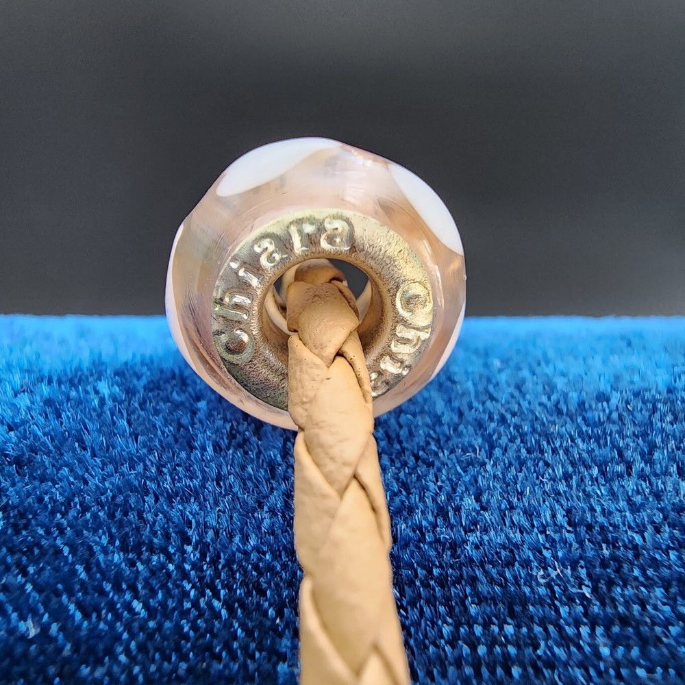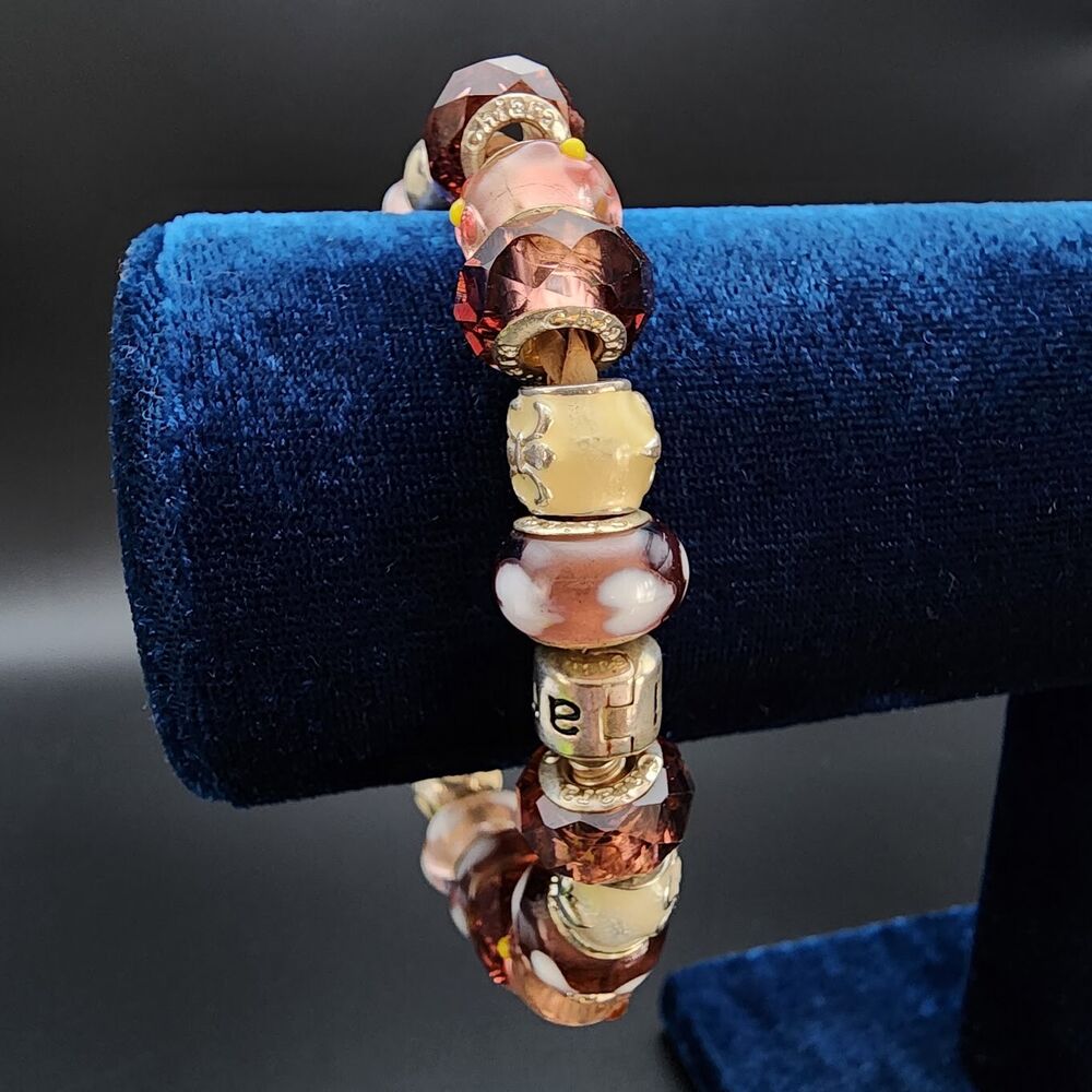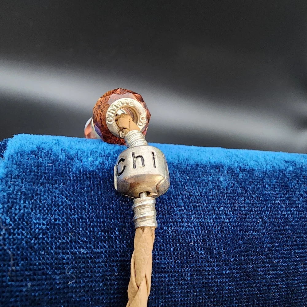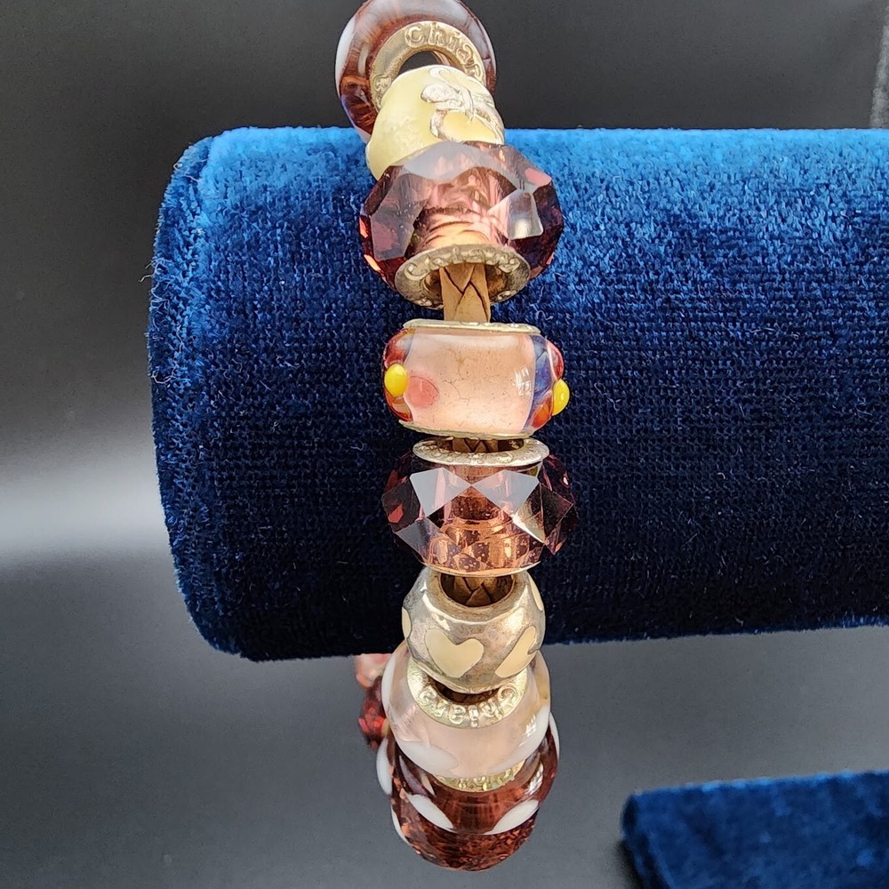 Chiara Tan Braided Leather Pink Heart Lamp Work Glass Crystal Bead Silver Tone Bracelet Pandora Like Barrel and Torpedo Closure Fleur De Lis Beads Enamel 7 1/4" Possible Murano Glass Beads. Not Sterling.