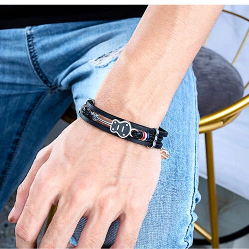 HomeBraided Leather Rope Bracelet for Men with Stainless Steel Guitar Charm for Music Fans