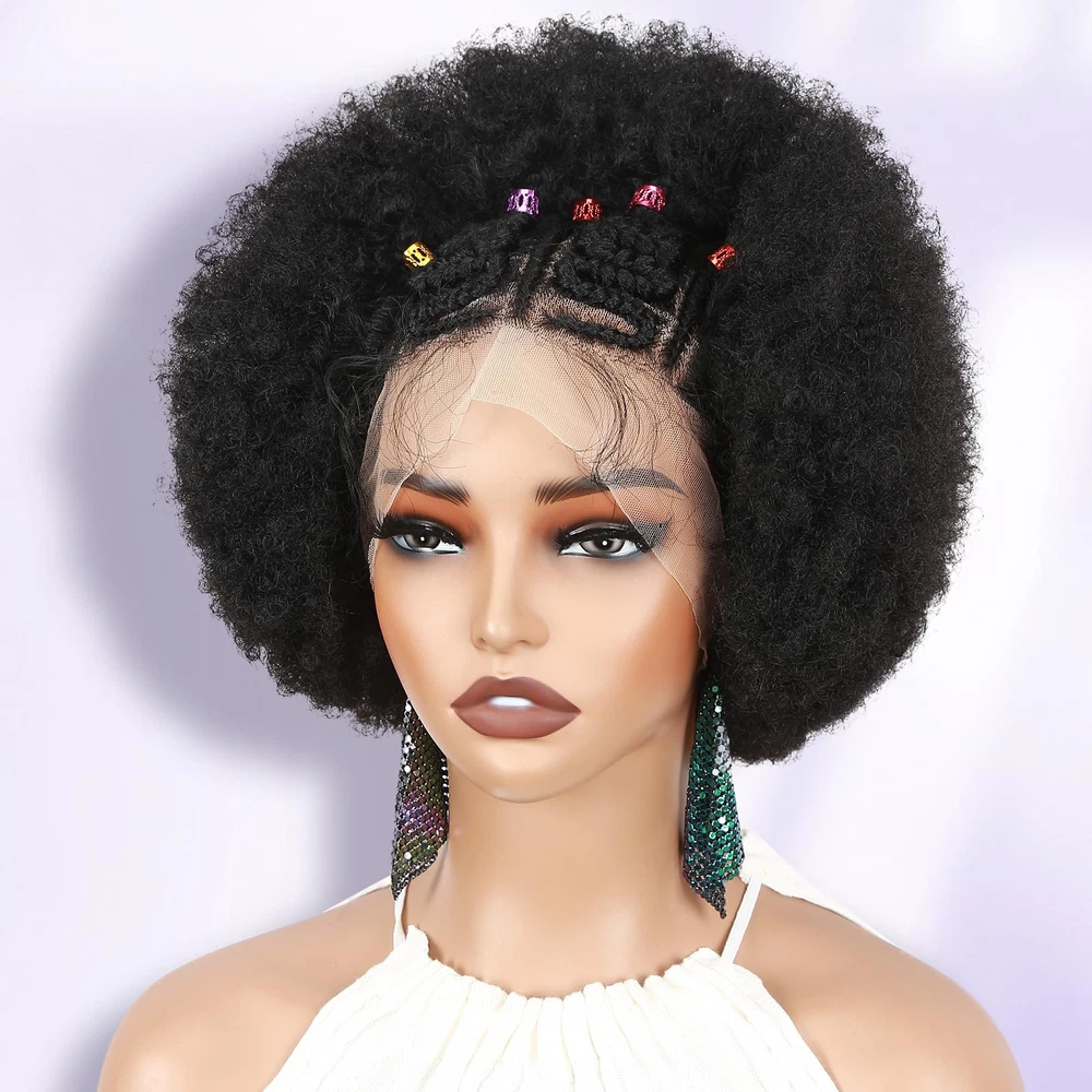 【Unique Lace Front】Achieve a stunning and effortless look with our short braided afro kinky curly wigs. this wig features a 13x6 HD transparent lace frontal, ensuring a natural and seamless hairline, soft and transparent. Suitable for any skin tone. Hand-woven braid, neat and tight. Pre plucked baby hair makes afro puff wig look more natural. 【Hair Material】The material of this afro curly wig is selected from the imported synthetic fiber, soft and light, not easy to break or shed, with natural human hair luster. People who are allergic to wig products can also the wig with confidence. 【Lace Frontal Cap】The kinky curly 13X6 lace frontal hair will be more authentic to wear, as natural as your own hair. In order to fit more women's head circumference, the wig cap adopts a uniform medium size. A hairnet is included in the package and can be used directly. It is the perfect choice for black women facing hair loss and low hair volume. 【Product Specifications】This braidded lace hair is only about 160 grams, super lightweight. There is no any discomfort to attend any occasion with it. Installation and removal are quite simple, easy to operate, saving time and effortless. 【Hair Care Tips】Handmade lace wigs may have a small amount of hair loss, please don't comb hard. When washing, don't rub vigorously, hang naturally to dry, avoid direct sunlight please.
