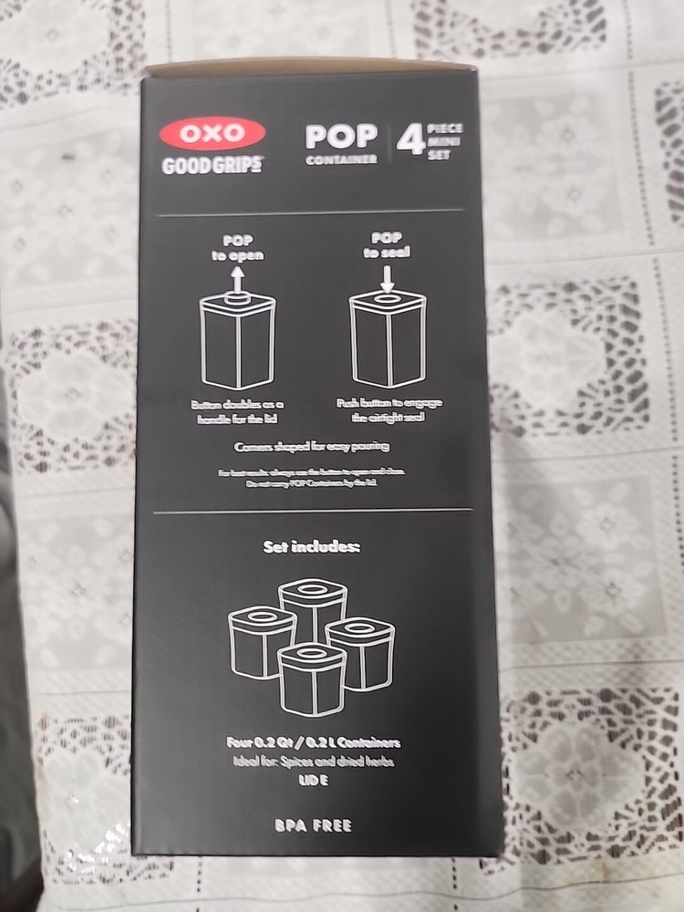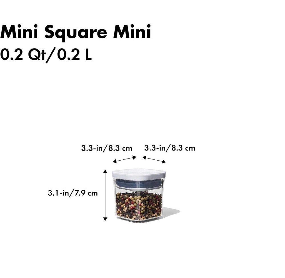 Shape:SquareNumber of Items in Set:4Brand:OXOModel:OXO Good GripsColor:ClearType:Mini Pop Container SetFeatures:Airtight, BPA Free, Dishwasher SafeItem Height:Does Not ApplyItem Length:4 inItem Width:Does Not Apply