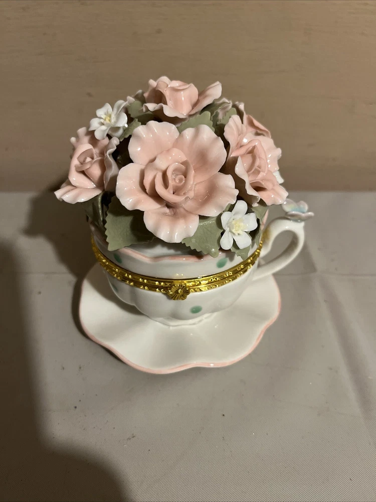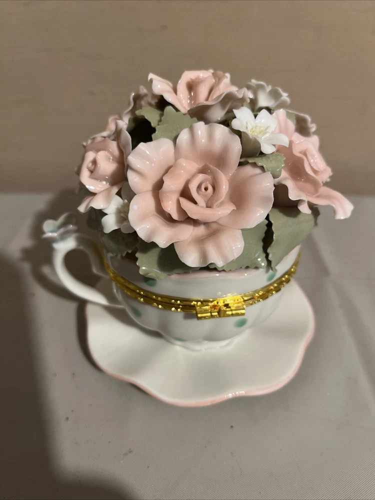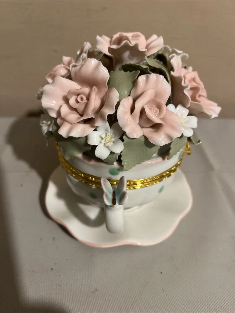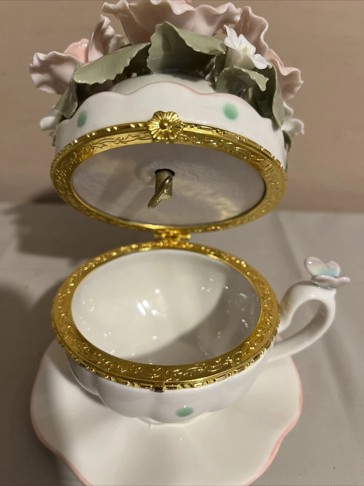 Brand New Porcelain Flowers Cup Hinged Music Box "Everything Is Beautiful"
