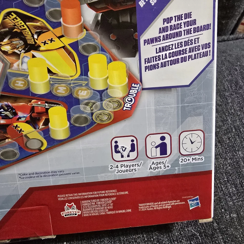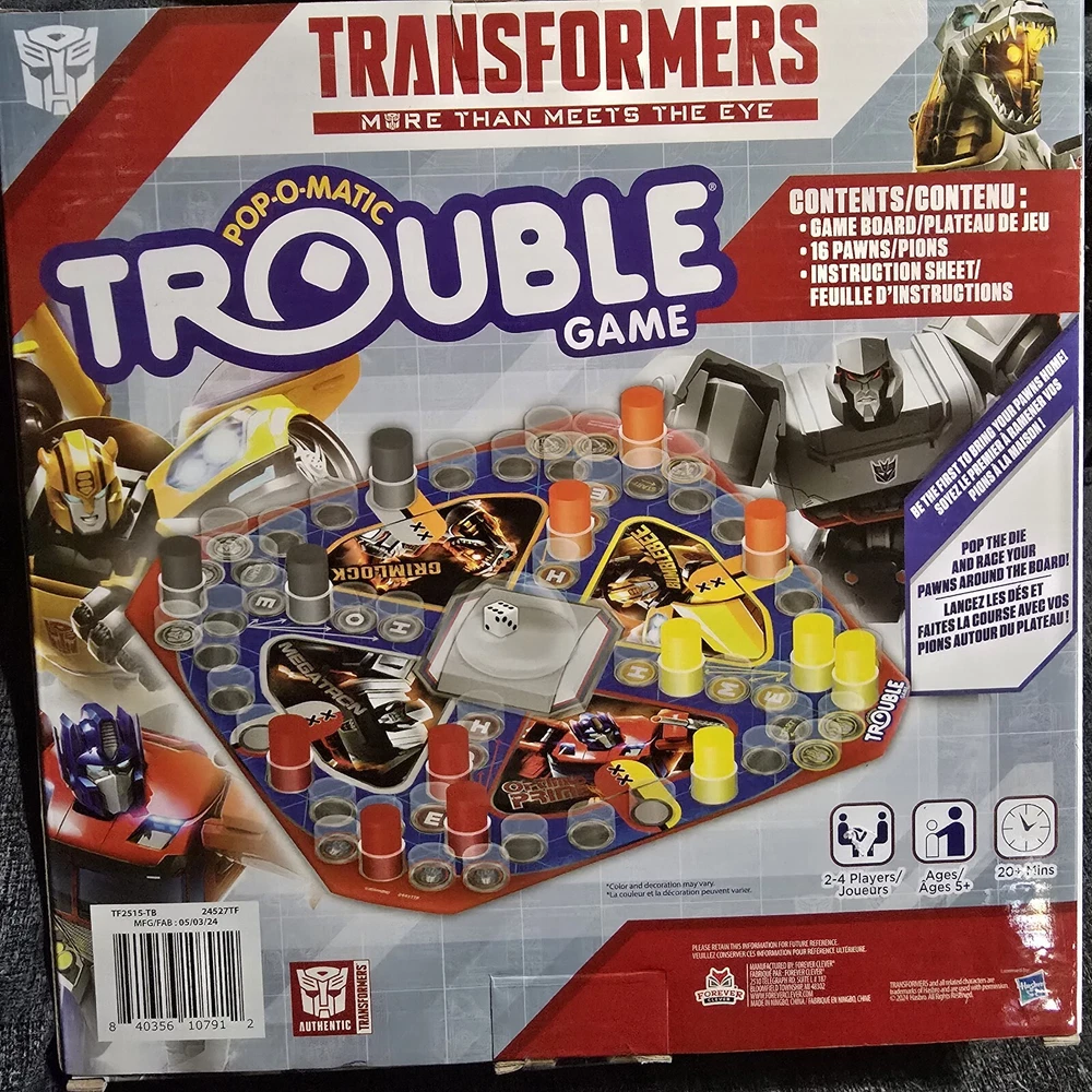 Game Type:Board GameYear:2024Min. Number of Players:2 playersAge Level:4-7, 8-11 Years, 12-16 Years, 17 Years & Upgtin13:840356107912UPC:840356107912Theme:TransformersType:Game BoardBrand:HasbroGame Title:Trouble