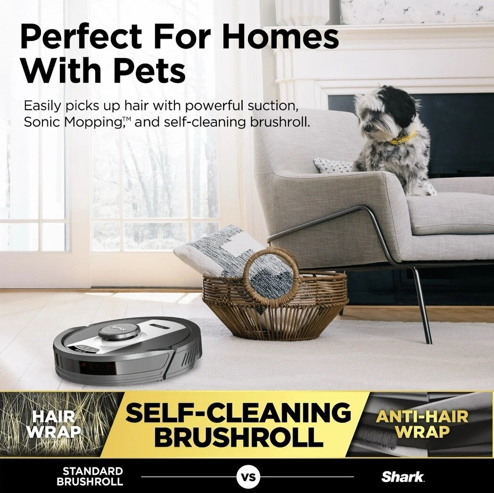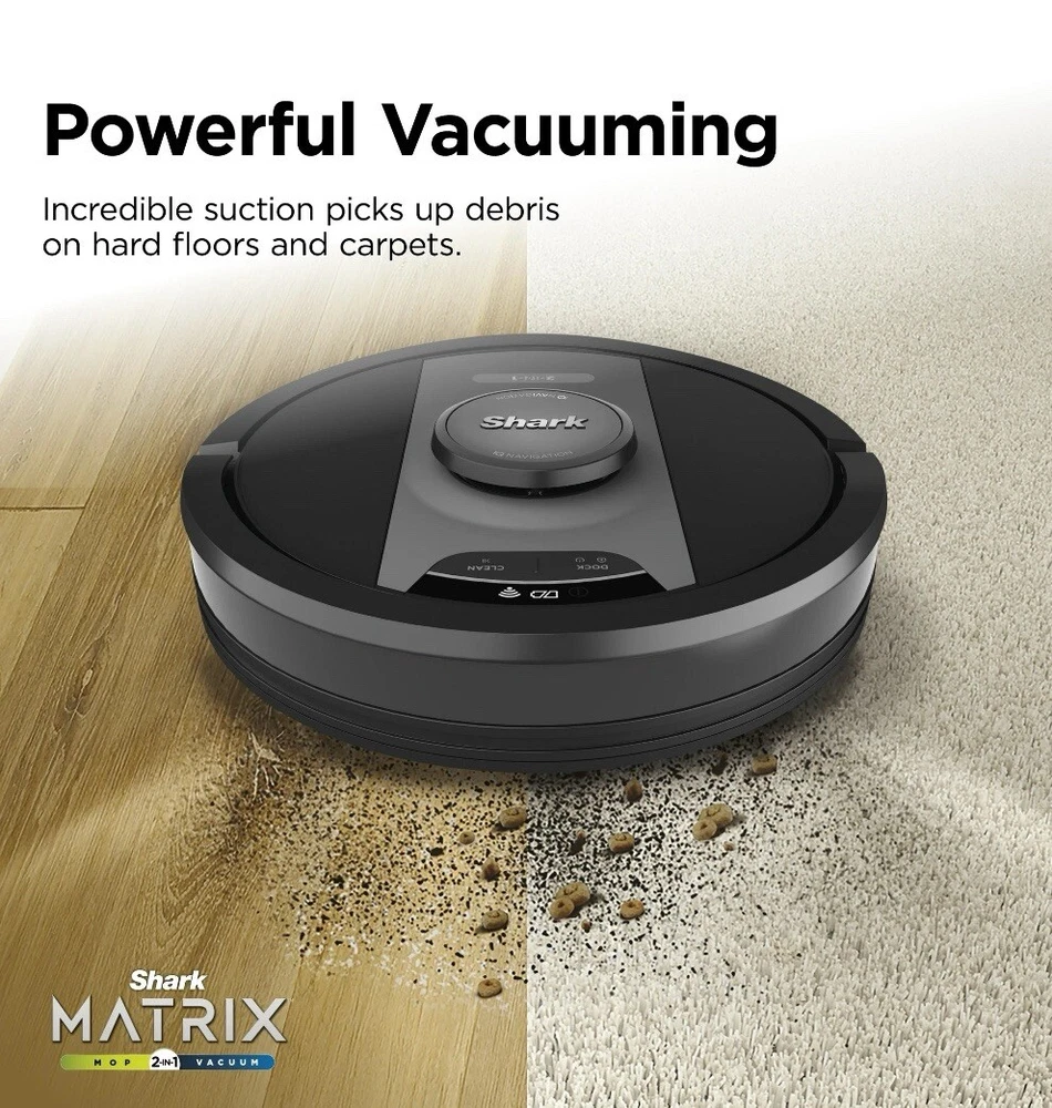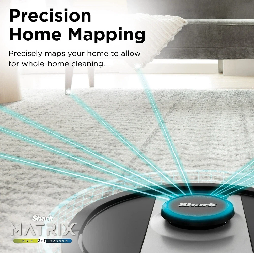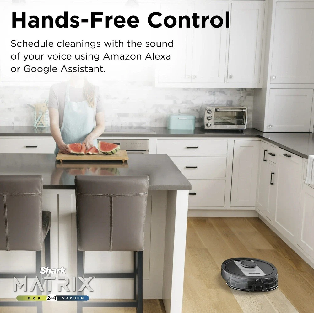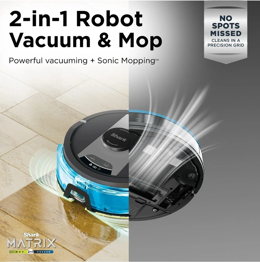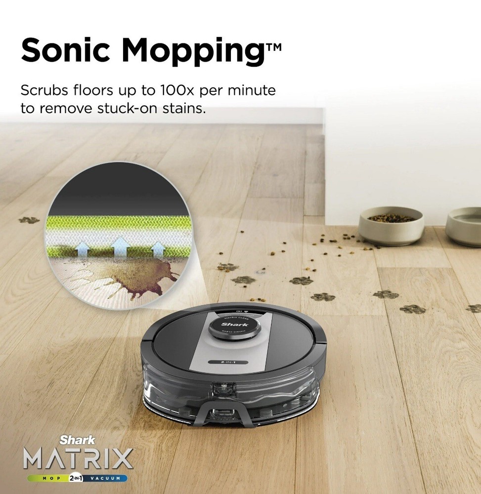 The Shark Matrix 2 in 1 robot, RV2400WD is the complete package. It not only vacuums hard floors and rugs, but it also vacuums & sonic mops hard floors, at the same time. Other features include: Matrix Clean, Home Mapping for customizing your clean; Voice Control; and a self cleaning brushroll for picking up all types of hair. Schedule cleanings with the sound of your voice using Amazon Alexa or Google Assistant POWERFUL SUCTION AND SONIC MOPPING: First, its an ultra powerful whole home vacuum on carpets and floors. Second, its an ultra powerful vacuum that sonic mops hard floors at the same time. NO SPOTS MISSED: With Matrix Clean, the vacuum cleans using a precision grid taking multiple passes over dirt and debris for whole home, deep cleaning coverage. TACKLE STUCK ON STAINS: Sonic Mopping scrubs hard floors 100x per minute and for extra deep cleaning initiate Matrix Mop in the app to get 50% better stain cleaning in targeted zones (vs. RV2001WD, modified IEC 62885-6). PRECISION HOME MAPPING: 360 LiDAR vision quickly and accurately maps your home so your robot can methodically clean detecting and avoiding objects in its path, day or night, adapting to everyday changes in the home. HANDS FREE CONTROL: Set a cleaning schedule, initiate whole home cleanings, or create no-go zones with sound of your voice using Amazon Alexa or Google Assistant. PERFECT FOR HOMES WITH PETS: With powerful suction, Sonic Mopping, and Sharks self cleaning brushroll, the robot picks up pet hair and eliminates stuck on pet messes with ease. BUILT, TESTED, AND PERFECTED: Shark puts their robots through rigorous testing to guarantee reliable, and high quality performance. WHATS INCLUDED: (1) Shark Matrix Robot, (1) Charging Dock, (1) Side Brush, (1) Filter, (2) Microfiber Reusable Mopping Pads, 12oz. Starter VAC MOP Cleaning Solution
