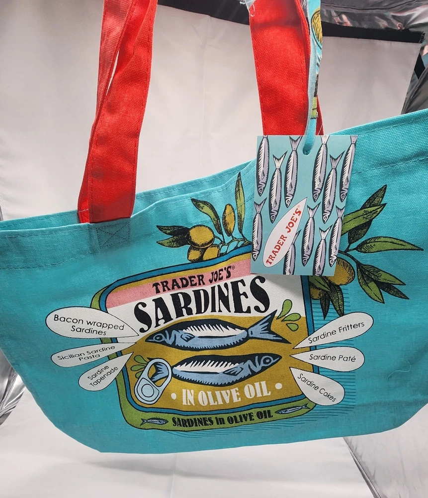 **See my other Trader Joe listings for some special bundles!** Ships same day when ordered before 6pm EST Priced to sell! Brand new, never used. With Tags. This limited edition Trader Joe's canvas tote bag is perfect for your grocery shopping needs. The spacious bag features a beautiful light blue color with a pattern of Sardines in olive oil. It is made of durable material and is 19 inches long, 11 inches high, and 4 inches wide. The bag is also foldable for easy storage when not in use. This reusable shopping bag is perfect for farmer's markets or any place you need to carry items. It is an original model from Trader Joe's and comes with free shipping. This bag is a must-have for anyone who is eco-conscious and wants to make a positive impact on the environment.