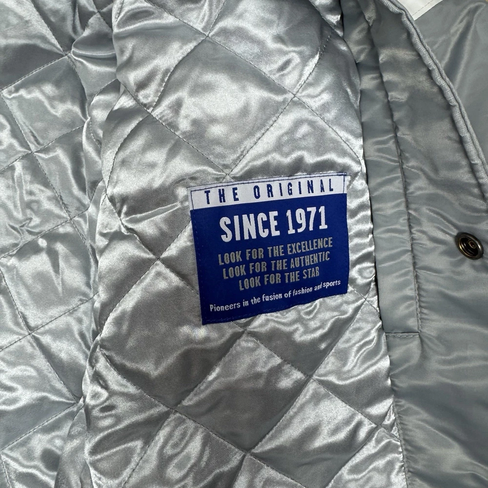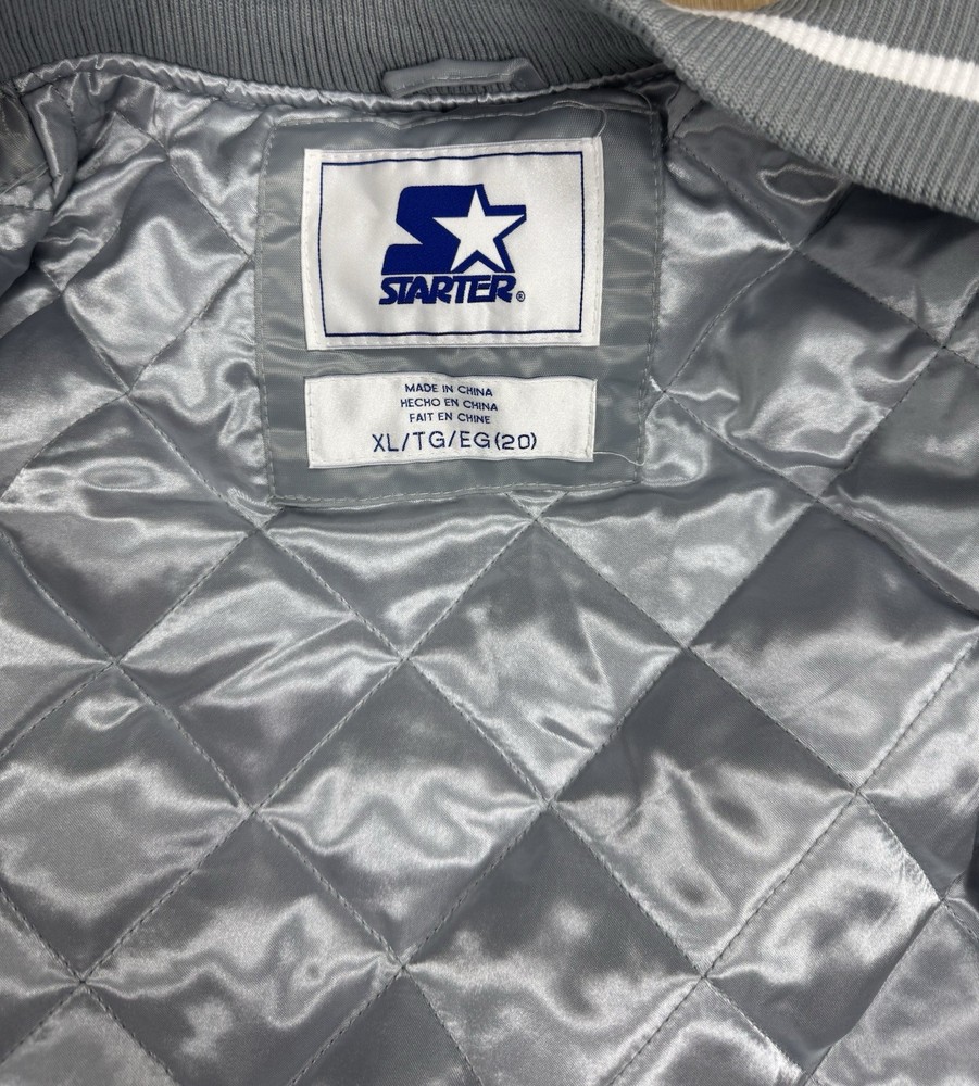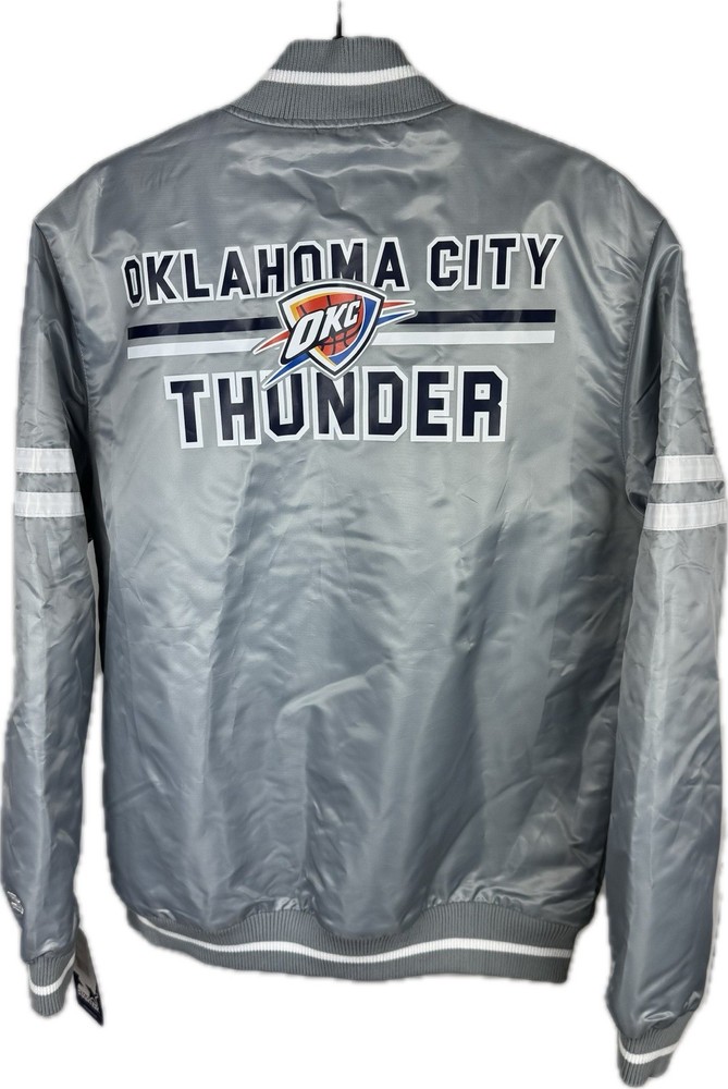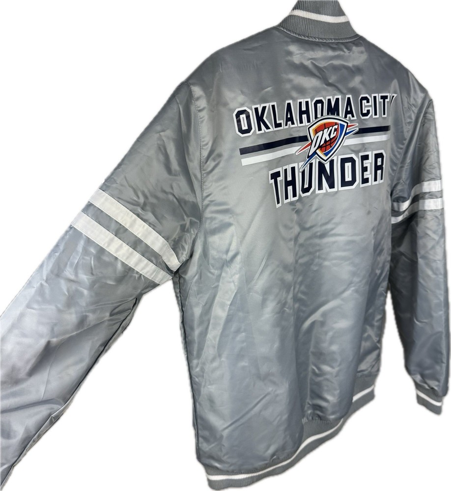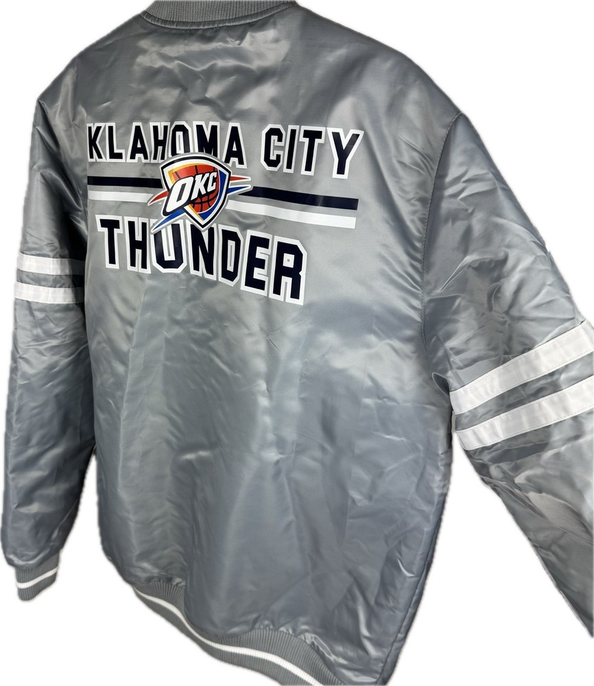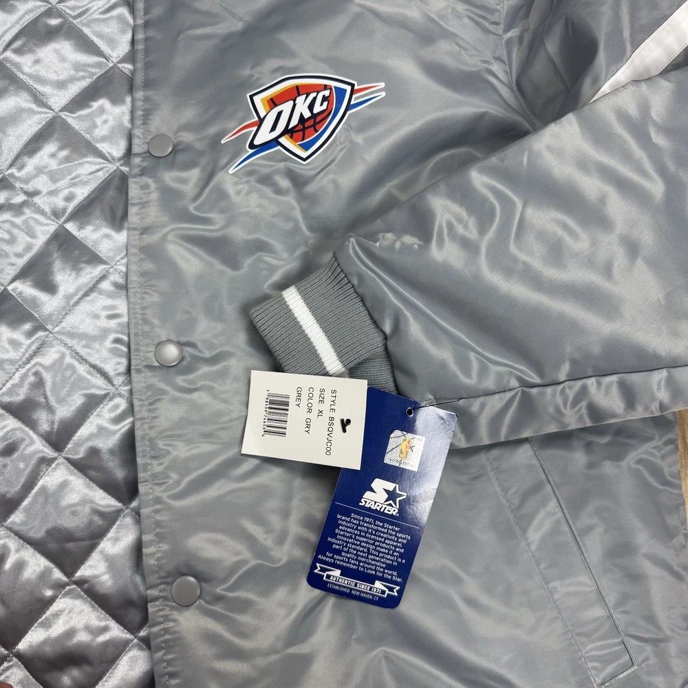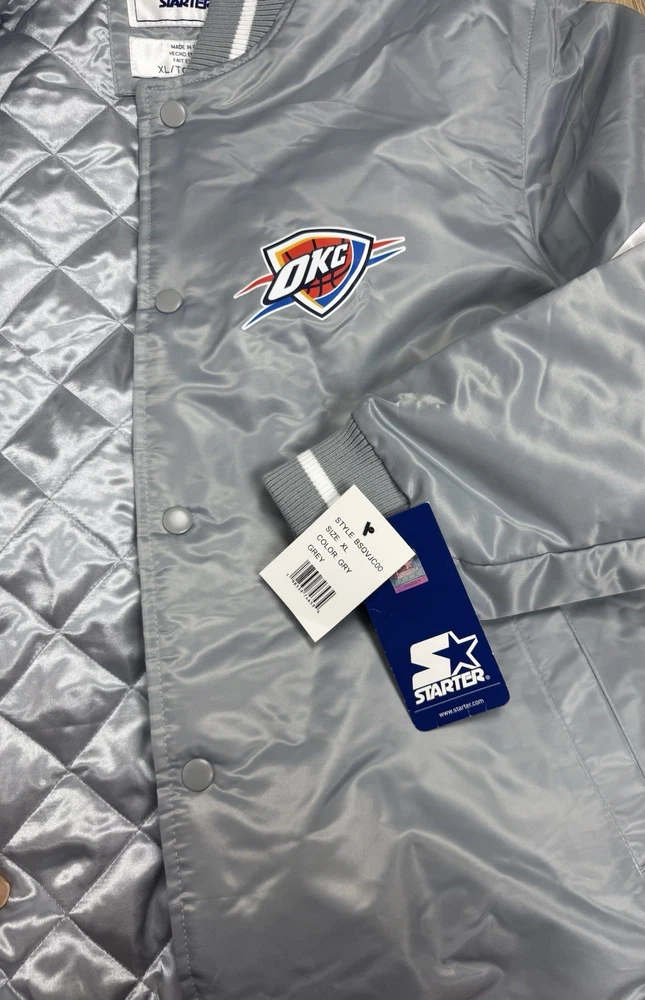 This NBA Finals OKC Satin Starter Jacket features the Oklahoma City Thunder team logo and colors, making it the perfect accessory for any basketball fan. Made by Starter, the jacket is designed with a satin finish and comes in a size XL, suitable for boys who want to show their team spirit during the NBA Finals. The gray color adds a touch of style, and the product is brand new with tags ensuring its authenticity and quality.