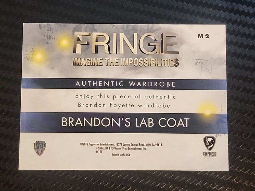Delve into the world of "Fringe" with this 2012 Fringe Lab Coat Wardrobe Trading Card, featuring the character Brandon Fayette. A must-have for fans and collectors alike, this card, numbered M2, showcases an authentic piece of the show's iconic costume design. Produced by Cryptozoic, this card captures the essence of the horror genre and is a unique slice of television memorabilia. The card is standard-sized and includes a striking image of the character, Ryan McDonald, amidst the mysterious atmosphere of the Fringe Labs. While it remains ungraded and unsigned, its authenticity is a testament to its genuine connection to the Warner Bros franchise. Add this piece to your collection and own a fragment of "Fringe" history.