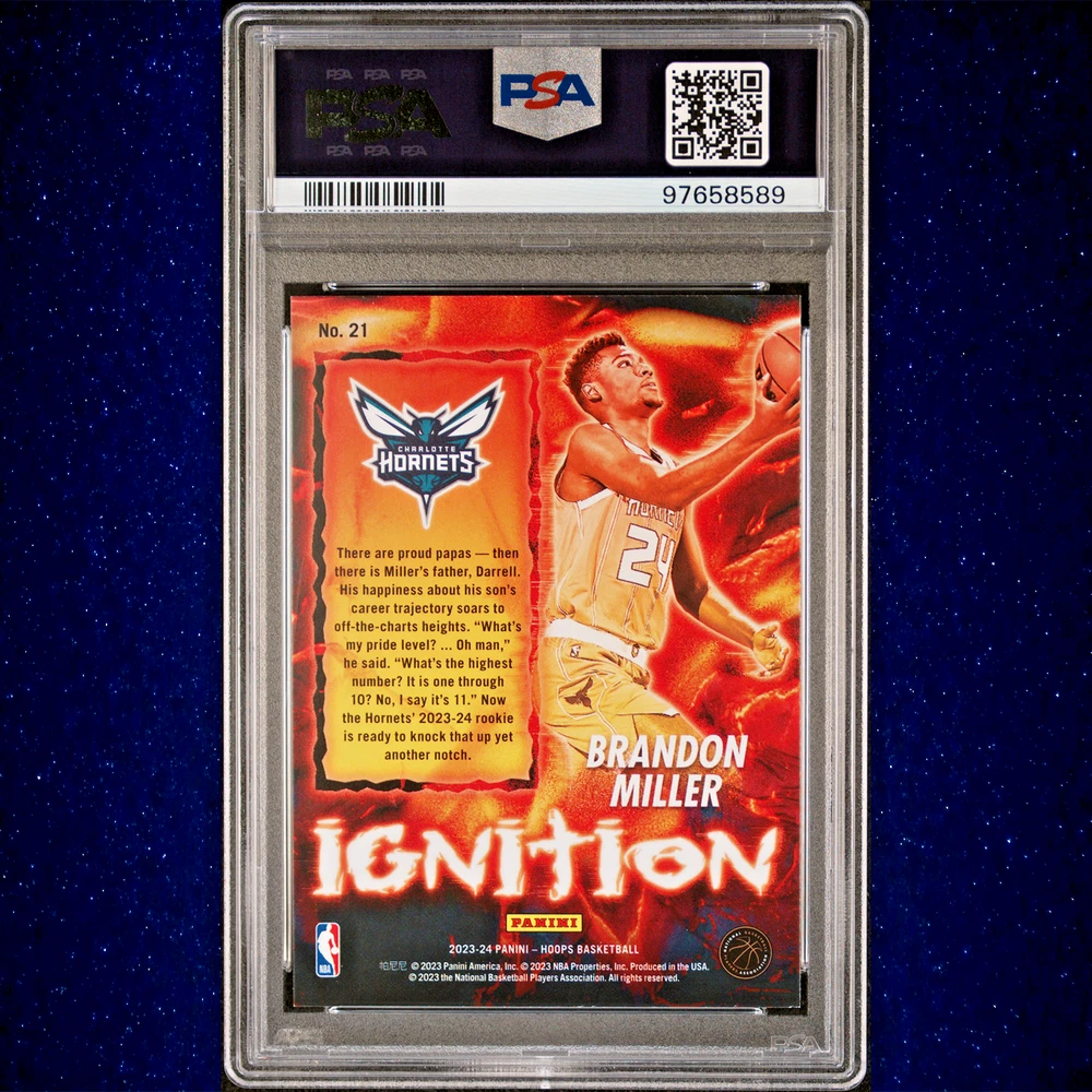 Original/Licensed Reprint: Original Set: 2023 Panini League: National Basketball Association (NBA) Card Thickness: 35 Pt. Professional Grader: Professional Sports Authenticator (PSA) Grade: 9 Type: Sports Trading Card Language: English Card Name: Brandon Millier Rookie Card Card Number: 21 Player/Athlete: Brandon Miller Autographed: No Season: 2023 Parallel/Variety: Ignition Insert Set: Ignition Material: Card Stock Event/Tournament: NBA Finals Card Size: Standard Certification Number: 97658589 Manufacturer: Panini Features: Rookie Year Manufactured: 2023 Team: Charlotte Hornets Country/Region of Manufacture: United States Vintage: No Sport: Basketball
