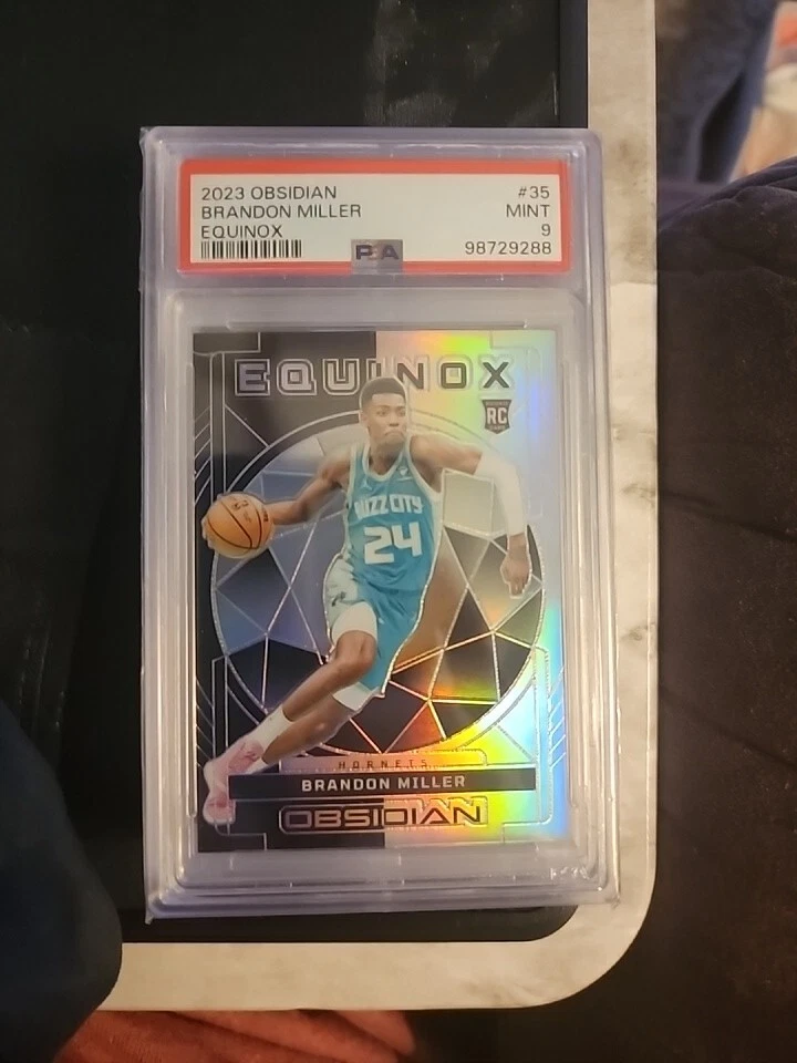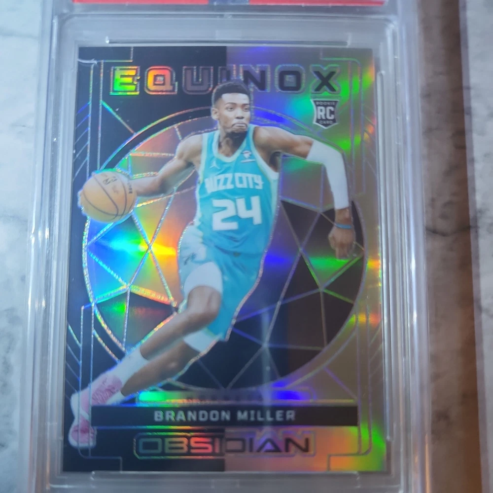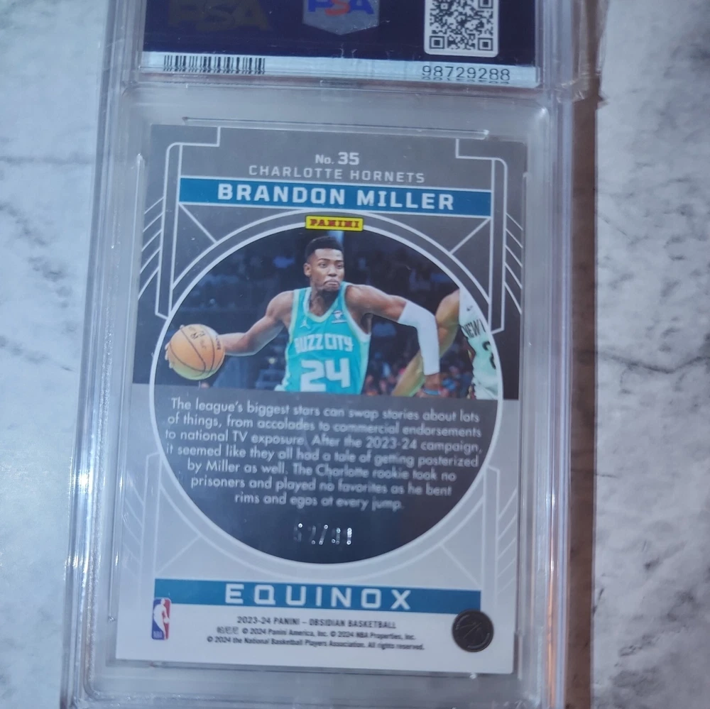 This rare and highly sought-after 2023 Panini Obsidian Equinox RC /99 trading card features the talented basketball player Brandon Miller, making it a must-have for any sports card collector. The card has been professionally graded by the distinguished Professional Sports Authenticator (PSA) and has received a Grade 9, ensuring its authenticity and quality. This sports trading card is an excellent addition to any collection, showcasing Miller's rookie status and his promising future in the sport. The card's features include a beautiful design, excellent quality, and a unique serial number, making it a valuable and rare find. Don't miss out on the opportunity to own this exceptional trading card!