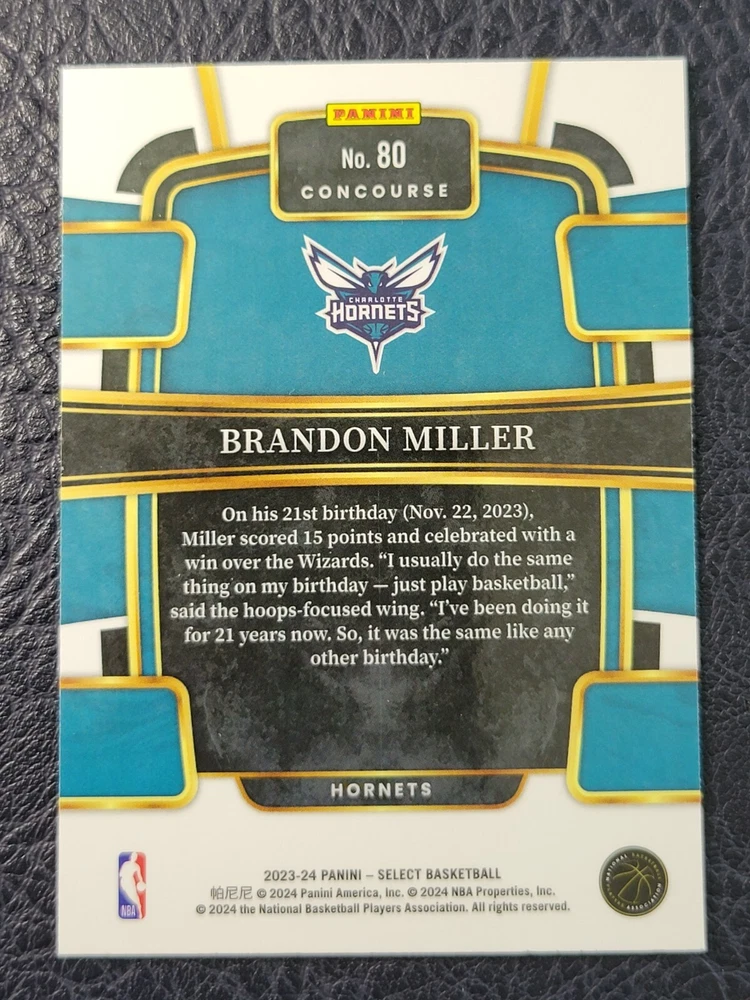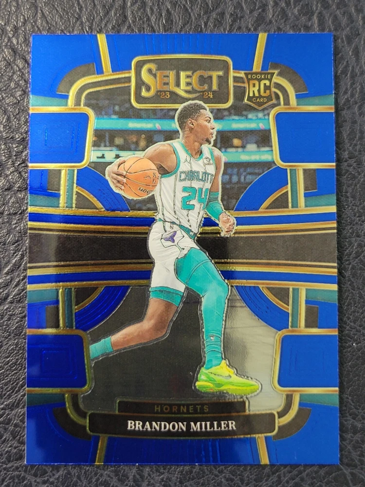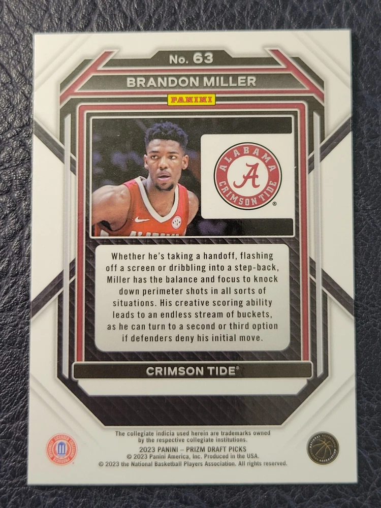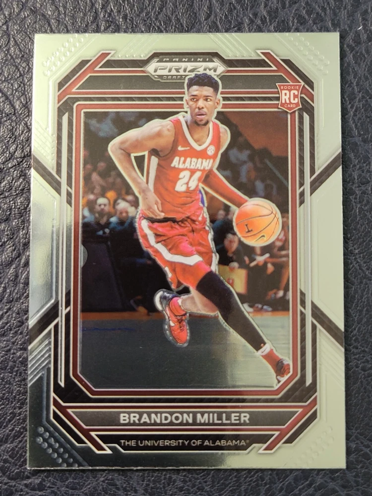 This sports trading card pair (2) features Brandon Miller, a rookie player from the Alabama Crimson Tide and current member of the Charlotte Hornets. The cards are made from high-quality card stock and is part of the 2023-24 Panini Prizm Draft Picks and 2023-24 Panini Select sets. It has a standard size and is in English language. The card is not autographed and depicts Miller during the NBA Finals event/tournament. It is a great addition to any basketball fan's collection and is manufactured in the United States by Panini. The card comes in a set of two and is perfect for lovers of sports trading cards.