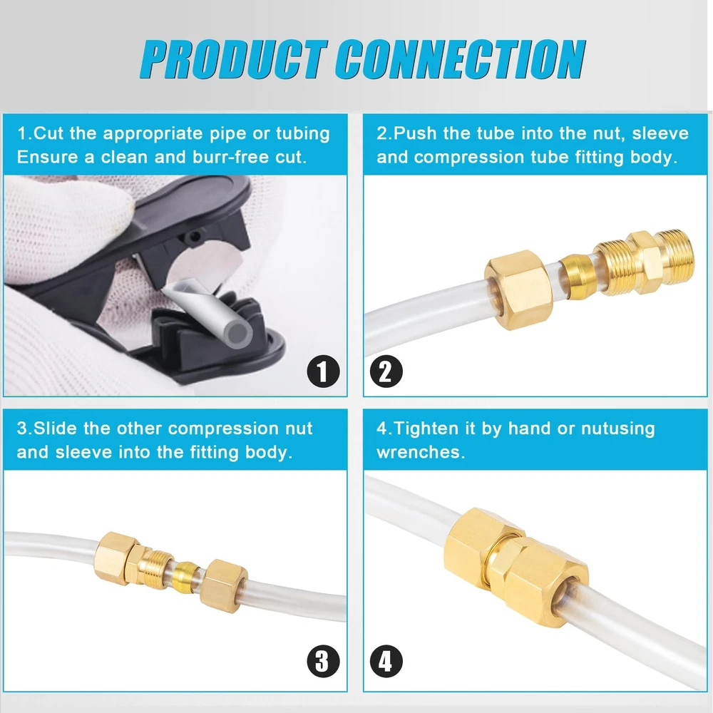 Brass Compression Fitting,1/4 3/16 1/8 5/16 3/8 1/2 -Inch OD Compression Union,Brass Compression Tube Fitting High quality brass with corrosion resistance, high temperature ductility and low magnetic permeability. Tube Size: 1/8", 3/16", 1/4", 5/16", 3/8" & 1/2" OD Kit contains 6sizes: 1/8"(2 pcs), 3/16"(10 pcs), 1/4"(4 pcs), 5/16"(2 pcs), 3/8"(2 pcs) and 1/2" (2 pcs)compression coupling,Brass Compression Sleeves Ferrules ,teflon tape,Comes with 1 year . Meets specifications and standards of ASA, ASME asn SAE.Compression unions for joining copper, plastic tubing,brass, or aluminum tubing. Each category contains a specific collection of fast-moving accessories that can be carried to increase your efficiency when using your car's hydraulic braking system.Compression Fittings do not require any flaring, soldering or other type of tubing preparation.