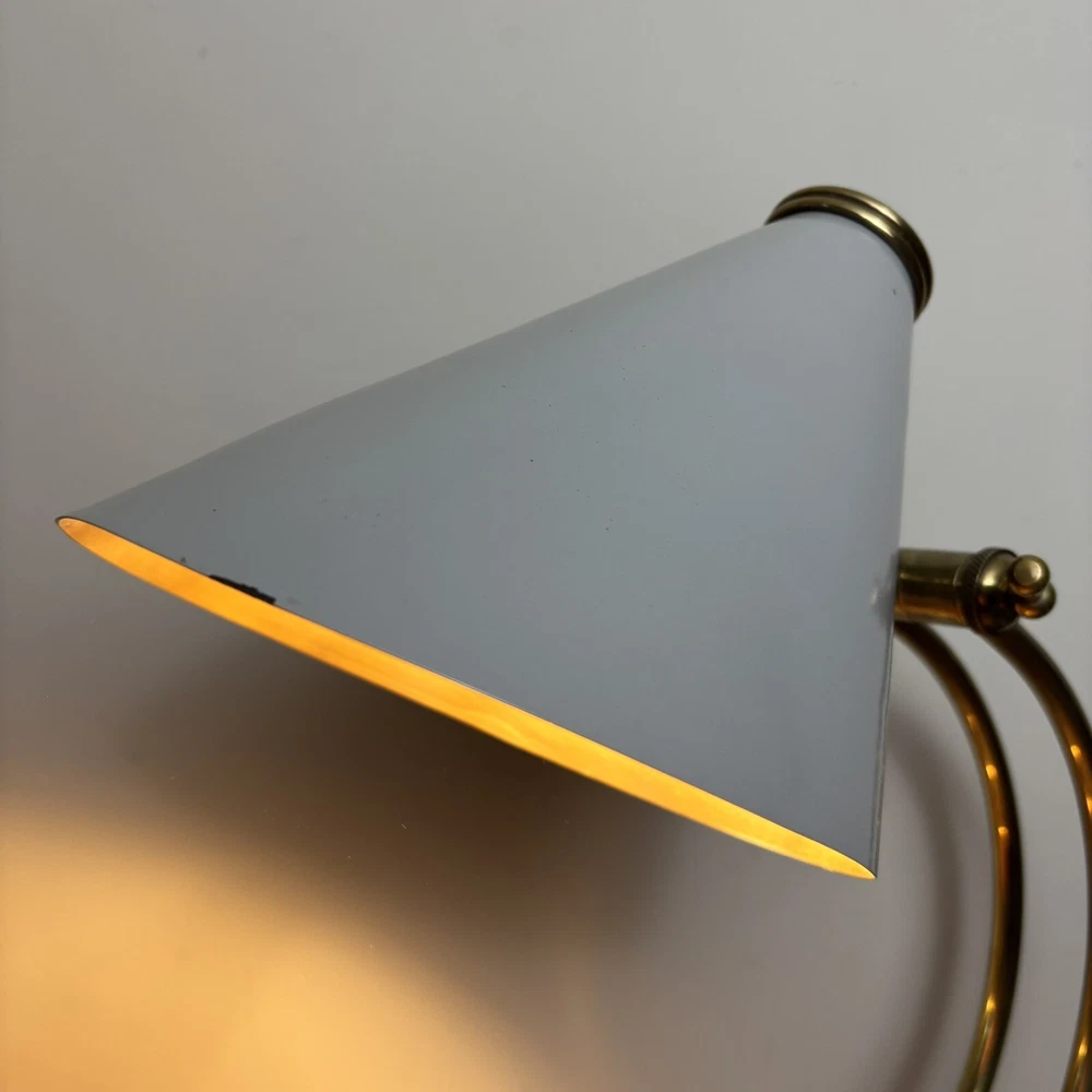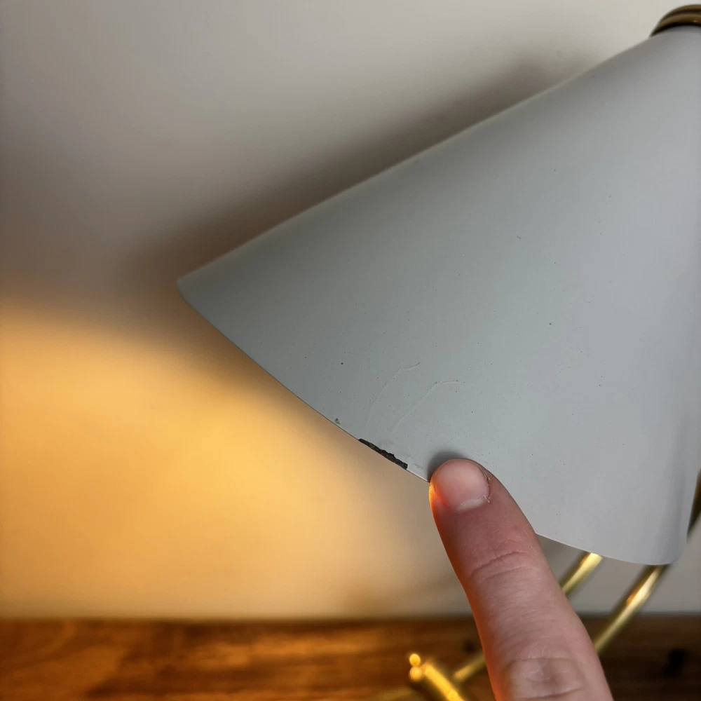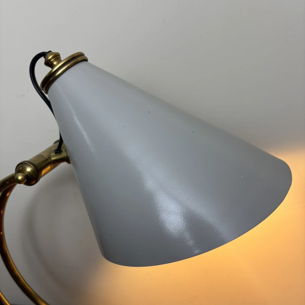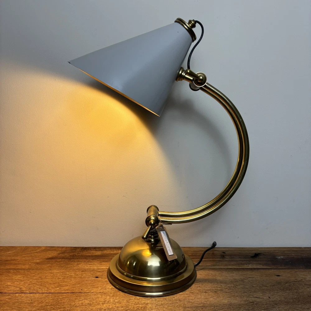 Brass Desk Lamp An incredibly aesthetic desk lamp that blends an antique brass look with a contemporary shade. The main body has a traditional and somewhat vintage look that is contasted with the more modern style shade. This contrast creates a lamp that feels homely and unique. There are two levers to adjust the lamp. One adjusts the angle of the arm and the other adjusts the angle of the shade. These are super tactile and a great feature to adjust the lamp to any space. These come complete with LED bulb and built in, in-line switch. *Please note that this lamp is ex-display. This does have a small imperfection where the paintwork on the shade is chipped. This is therefore offered at a heavily discounted rate. So if you can live with this imperfection, you’ll be grabbing a bargain!* Measurements: Height: 50cm Base Diameter: 18cm Shade Diameter: 20cm Free U.K. delivery via Royal Mail. Please enquire for more details.