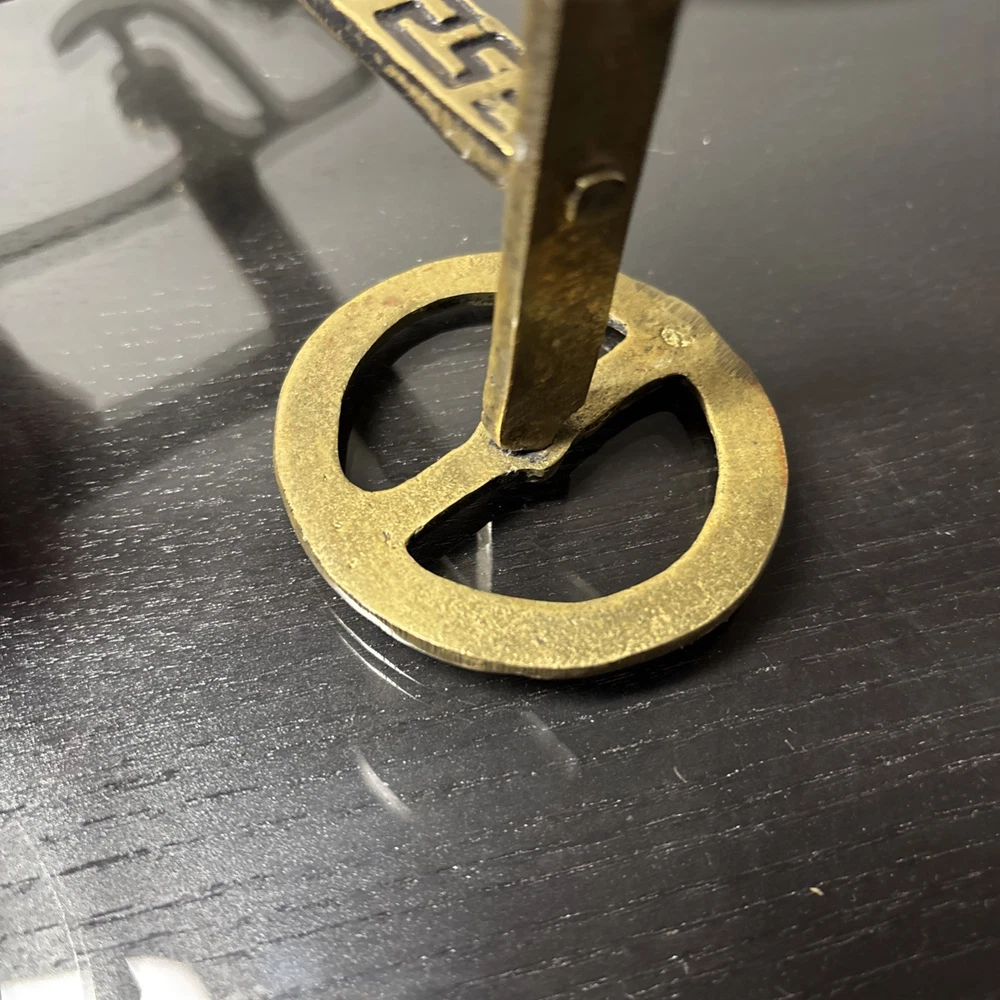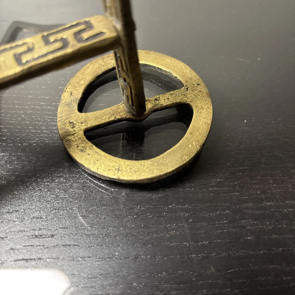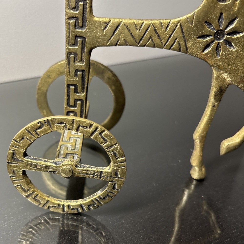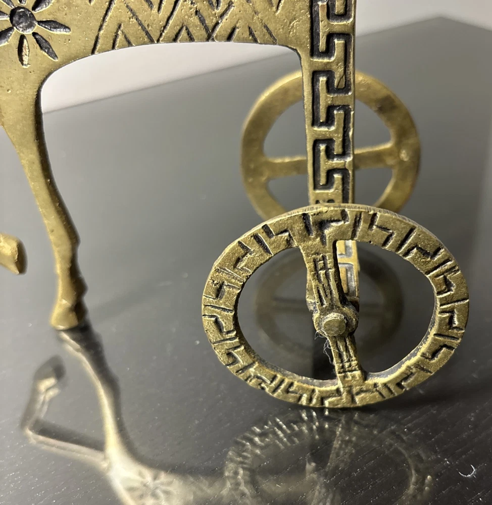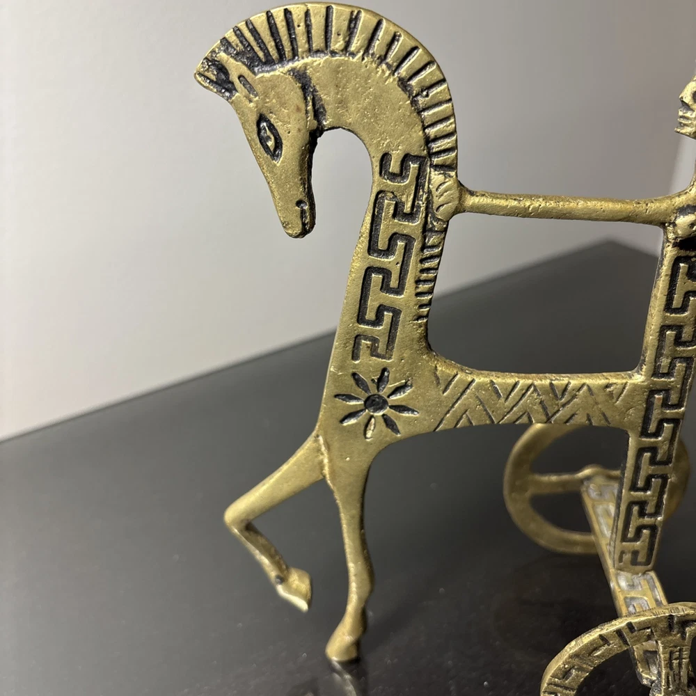 The product is a 7.5" tall Etruscan horse chariot sculpture, appears to be brass adorned with intricate details depicting a Greek warrior riding on the back of a horse holding an owl. In the style of F Weinberg The sculpture is a representation of ancient artistry and craftsmanship, showcasing a blend of realism and stylization typical of Etruscan and Greek sculptures. , this sculpture captures the essence of the Classical period with its depiction of the horse and warrior figure, making it a unique and visually striking piece for any art collection.