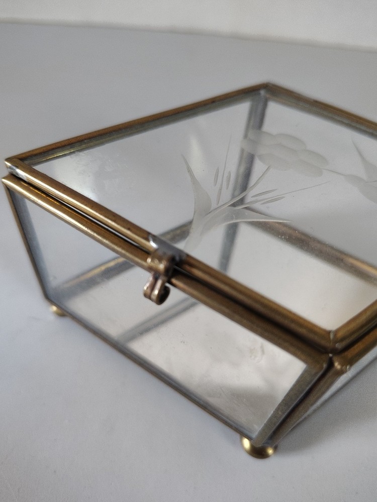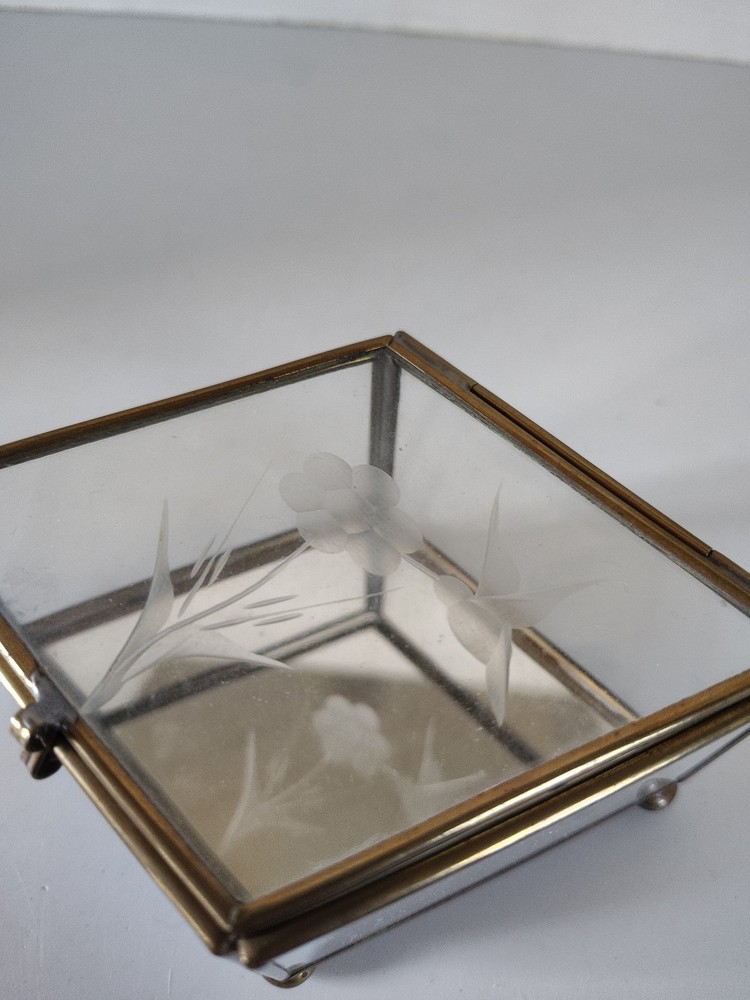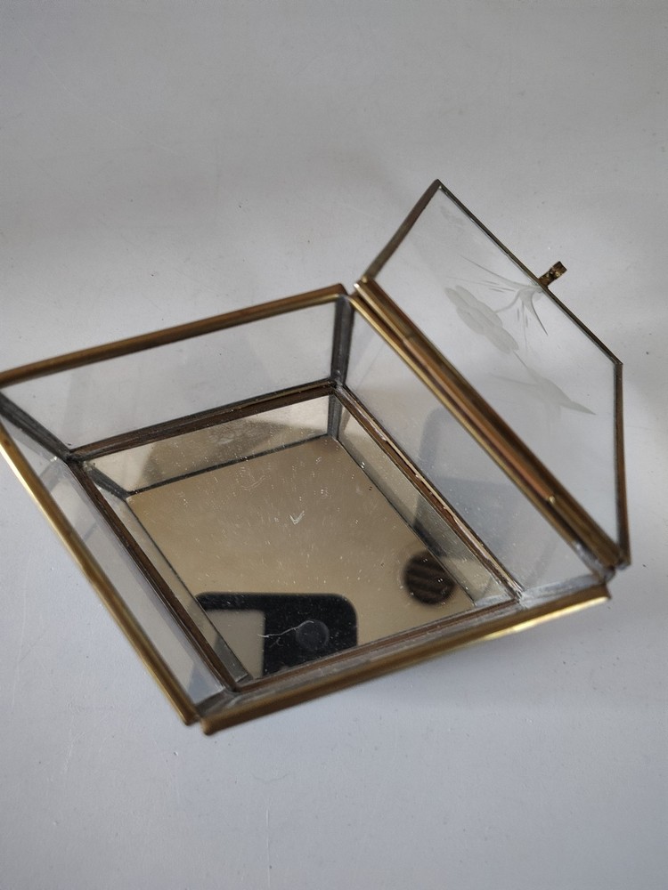 Brass and Glass Trinket Box with Mirrored Bottom Featuring Etched Hummingbird and Flower Design