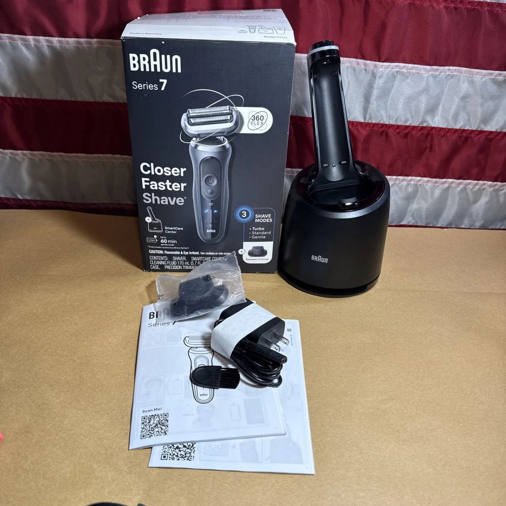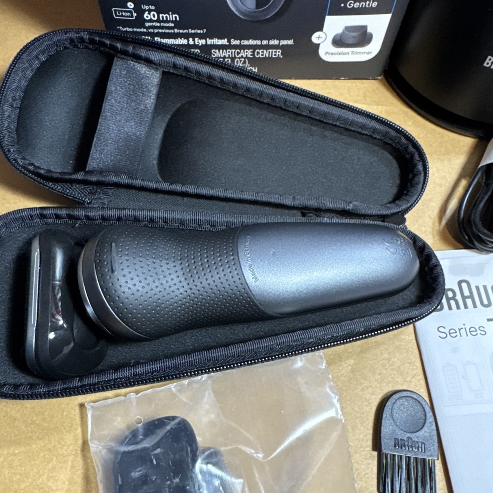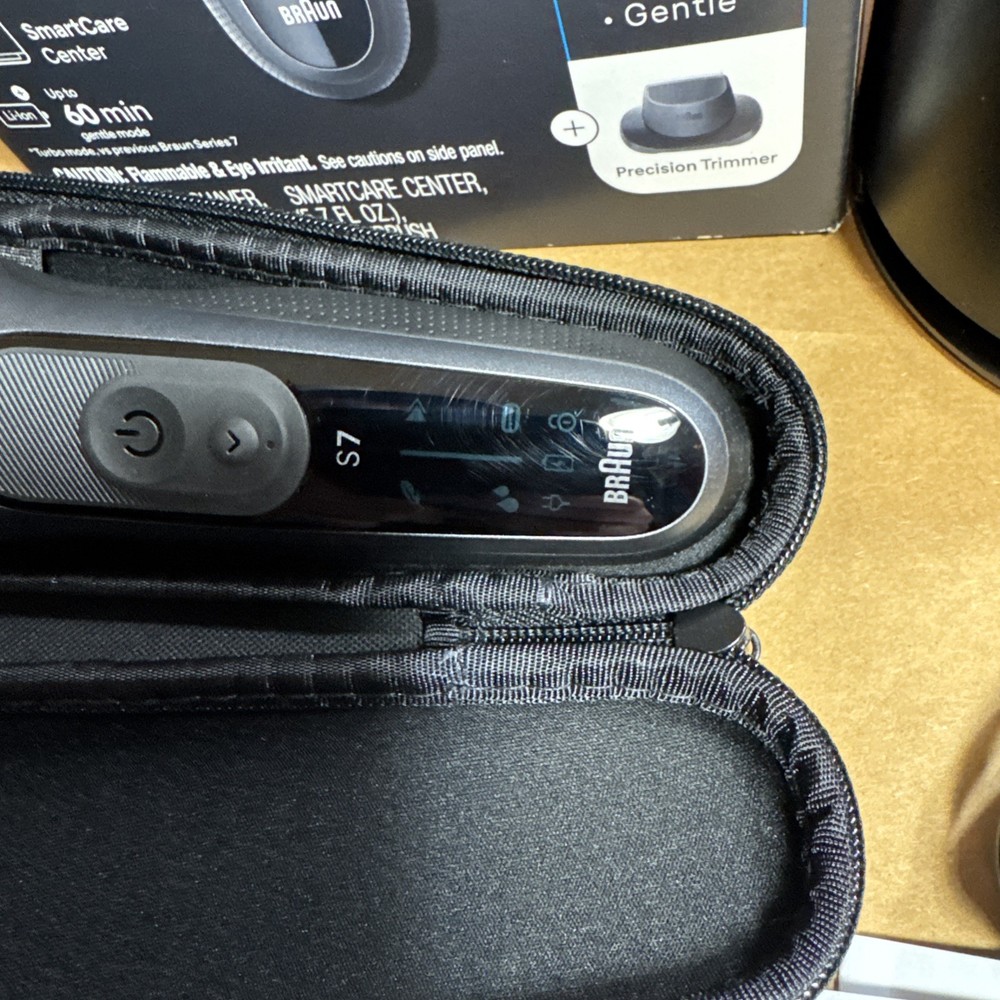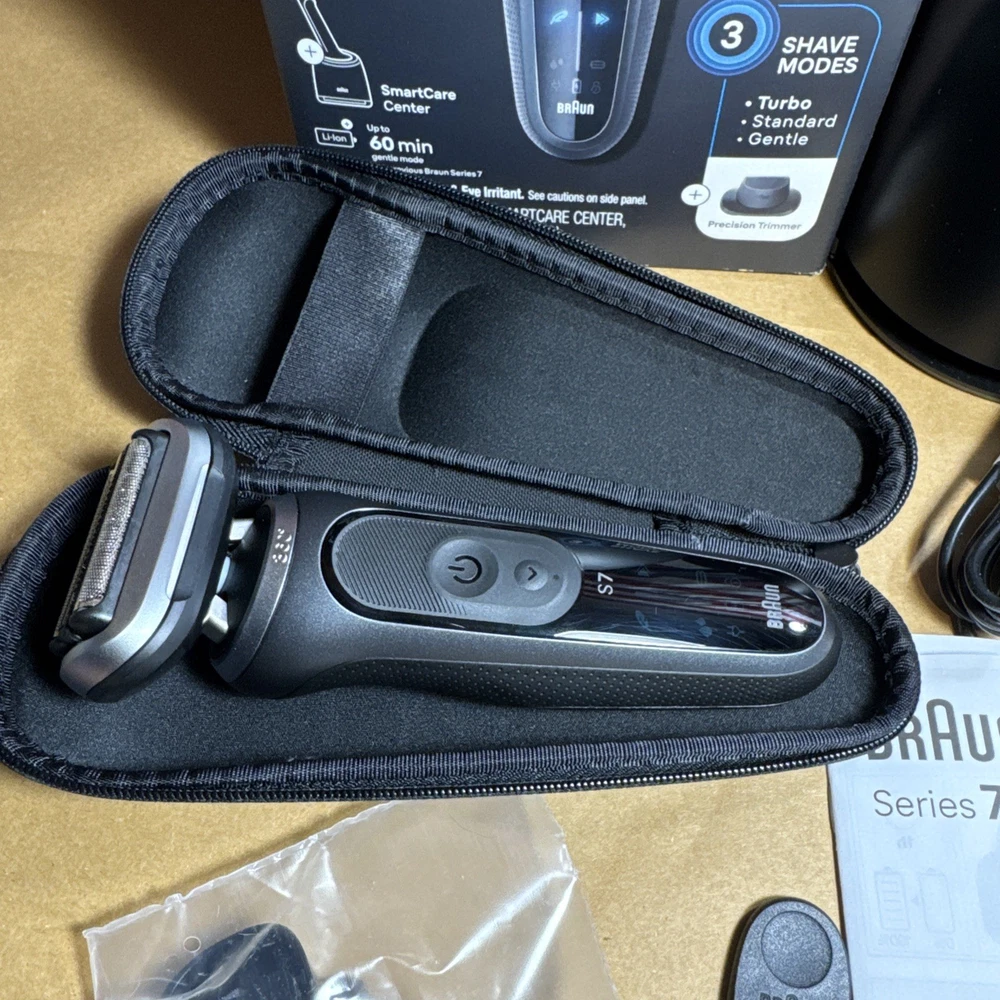 Braun Series 7 7171cc Electric Shaver Includes: • Shaver (Model 7171cc) • Charging cord • Travel case • Original paperwork Condition: • Open box condition • Shaving head appears unused (no hair or residue present) • Charging cord appears unused • Light cosmetic surface scratches on glossy display panel from handling/storage • Scratches are cosmetic only and do not affect performance Unit powers on and functions properly. Please review photos carefully for exact cosmetic condition.