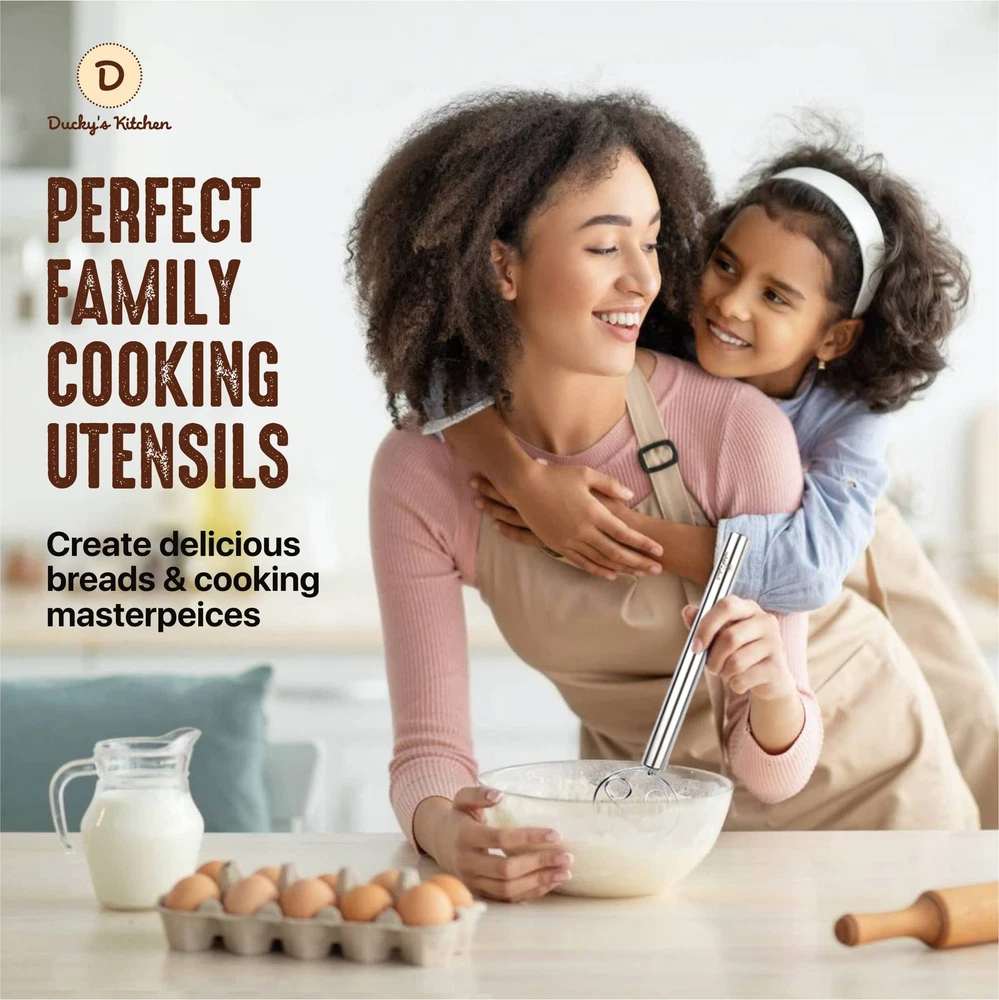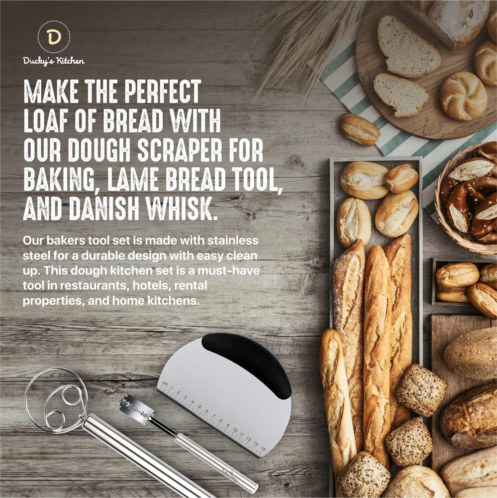 Bread Baking Supplies: Make the perfect loaf of bread with our dough scraper for baking, lame bread tool, and Danish whisk. Our bakers tool set is made with stainless steel for a durable design with easy clean up. This dough kitchen set is a must-have tool in restaurants, hotels, rental properties, and home kitchens. What’s Included: Our bread scoring set includes a bread lame dough scoring tool with 5 replaceable lame blades, bread dough scraper with an ergonomic rubber grip, and a Dutch whisk. The bread whisk is 330 cm, dough scraper is 19 cm, and bread scoring tool measures 160x120 mm/168 grams. Premium Quality: These bread making tools are made of high-grade stainless steel that is rust-resistant. Our bread scraper, bread razor lame, and Dutch dough whisk are easy to clean, safe, and durable. Your Bread, Your Style: Our scoring knife holds the sharp blade at a curved angle allowing you to create deep, smooth, and detailed cuts. This bread lame dough tool makes your bread uniquely yours. Perfect Gift for Bakers: This bread scorer and baking set is a unique gift for anyone who likes to bake! Our bread baker tools set is a perfect gift for holidays, weddings, birthdays and anniversaries.
