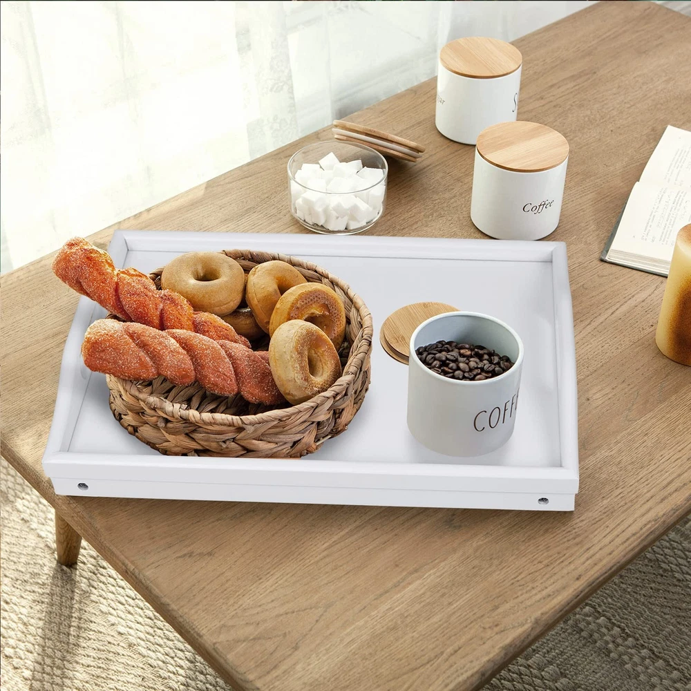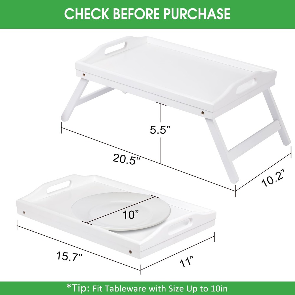 This small size breakfast tray is made of bamboo,which is sturdy and durable. The bed tray surface is finely polished without burrs, the bed tray with folding legs extended fully and they can lock in place perfectly without shake.This folding legs with handles bed tray can be widely used by kids,couples in kitchen,bedroom,bed,sofa hospital etc. Sleek & Durable:The tray surface is finely polished without burrs. Save Space:Multi- Fuctional Legs can folded so it can be used as laptop desk.It can also be used as serving tray.It includes handles for easy mobility;legs fold for easy storage; Ideal for an elegant decoration display.Clean&Maintain:Easy to Clean Hand wash with warm water and wipe with damp cloth.use bamboo oil occasionally Specifications:Material: MDF Bamboo Color: WhiteDimensions when open (L x D x H): 20.5*10.2*5.5 inch ; when closed (L x D x H):15.7*11*2.36 inch SMALL KIDS BREAKFAST TRAY:This small bamboo breakfast tray nice gift for your children as drawing table,reading books,surfing with tablet etc.This folding legs with handles bed tray can be widely used by kids,couples in kitchen,bedroom,bed,sofa hospital etc. PORTABLE SIZE & STURDY CONSTRUCTION BED TRAY:The bed tray table made of bamboo material,very sturdy and nice color,open breakfast tray with legs. SAVE SPACE&BREAKFAST TRAY LIPS DESIGN: Foldable legs can save the space and storage;Surrounding tray lips stop the food from falling over and liquid spill out. EASY TO CARRY EVERYWHERE:The wooden breakfast tray with double handles,can transporting food indoor&outdoor easily.Dimensions when open (L x D x H): 20.5*10.2*5.5 inch ; when closed (L x D x H):15.7*11*2.36 inch BREAKFAST TRAY MAINTAIN: easy clean with water Dry thoroughly, for extended life of tray use bamboo oil occasionally.