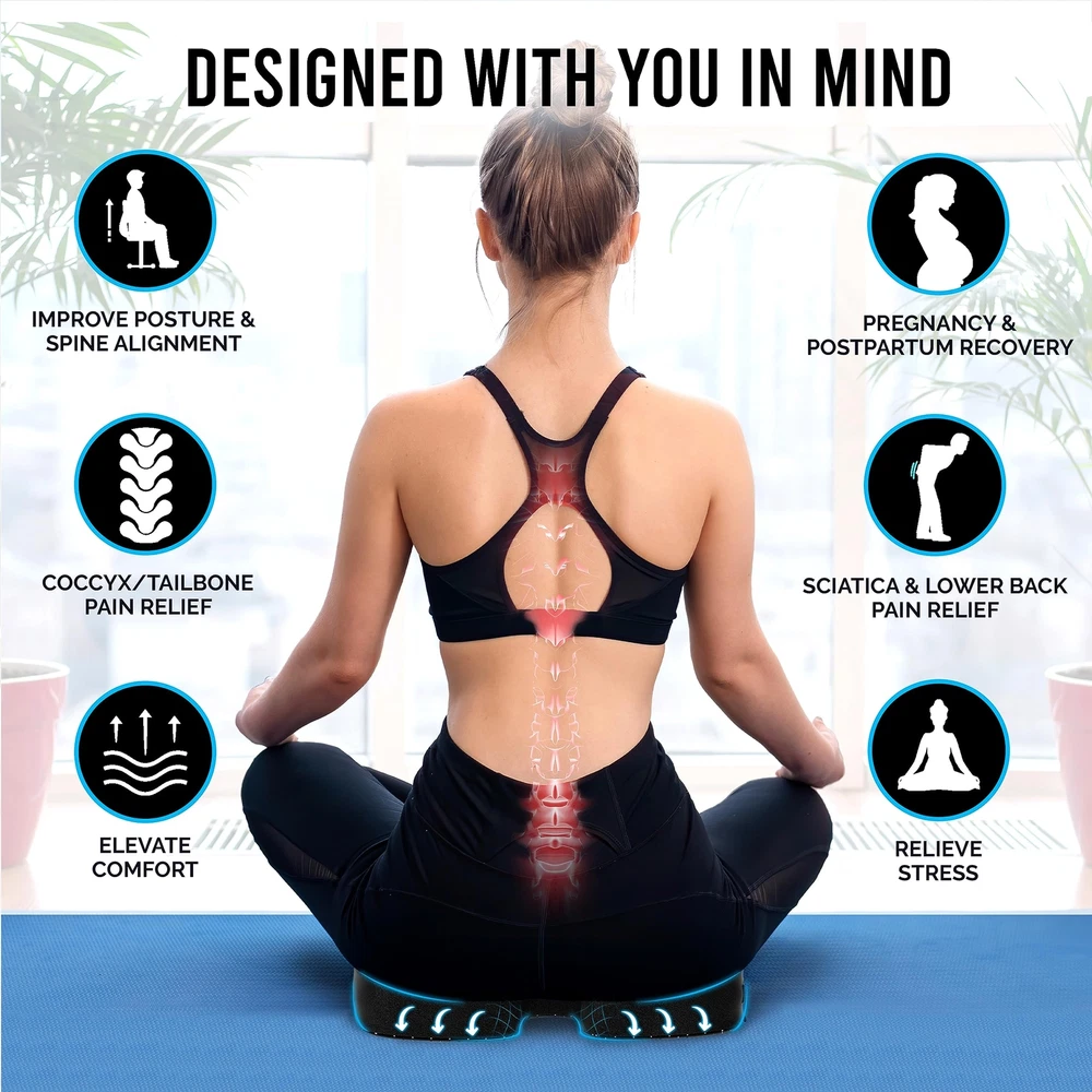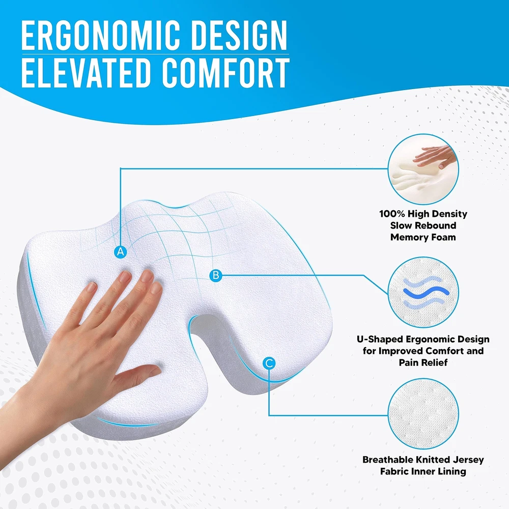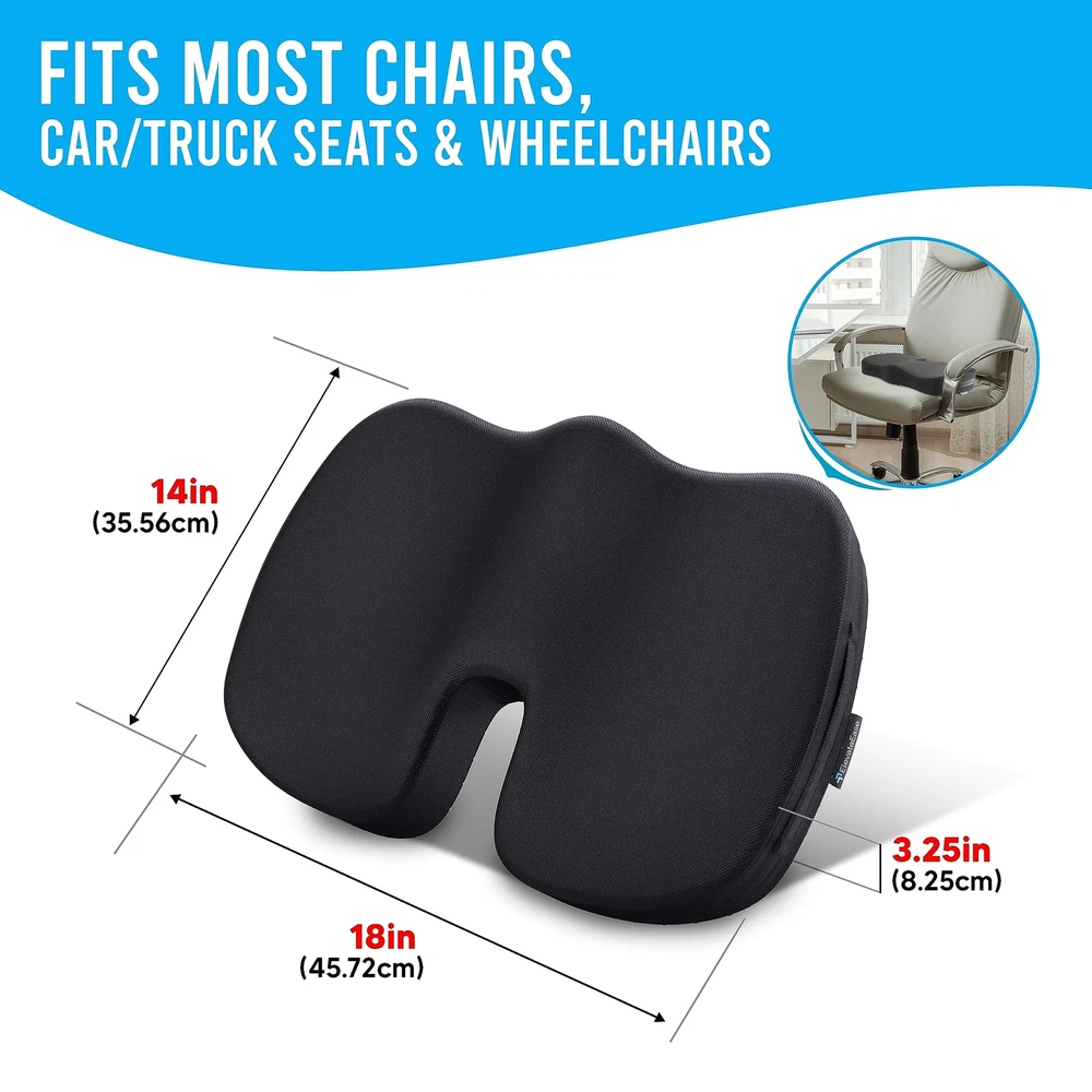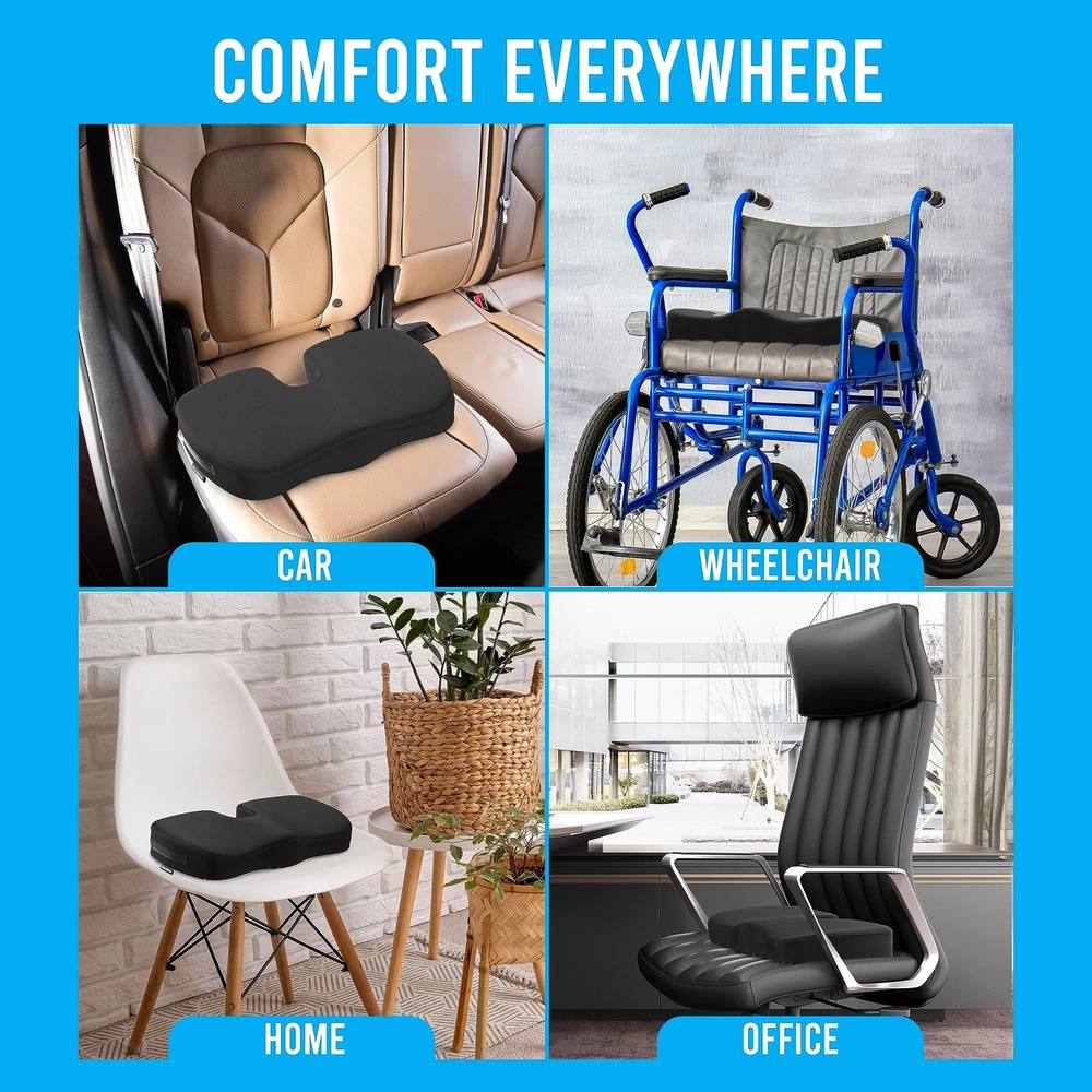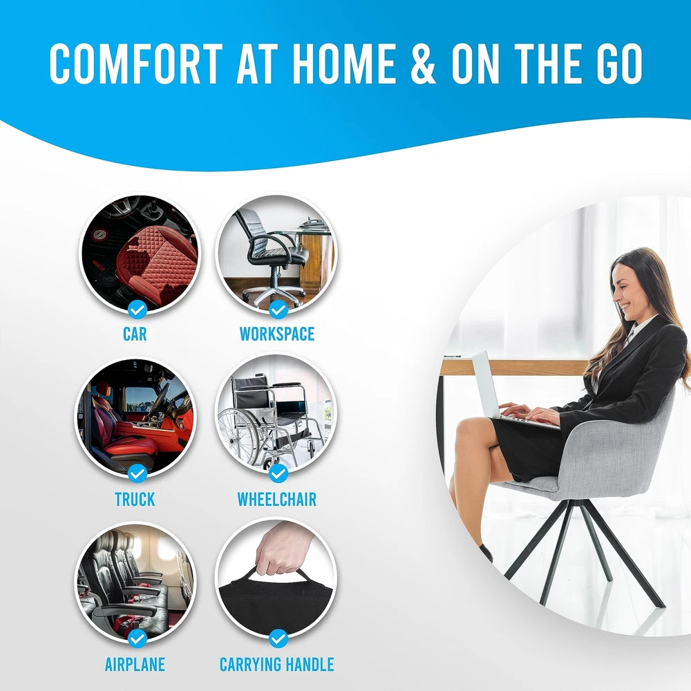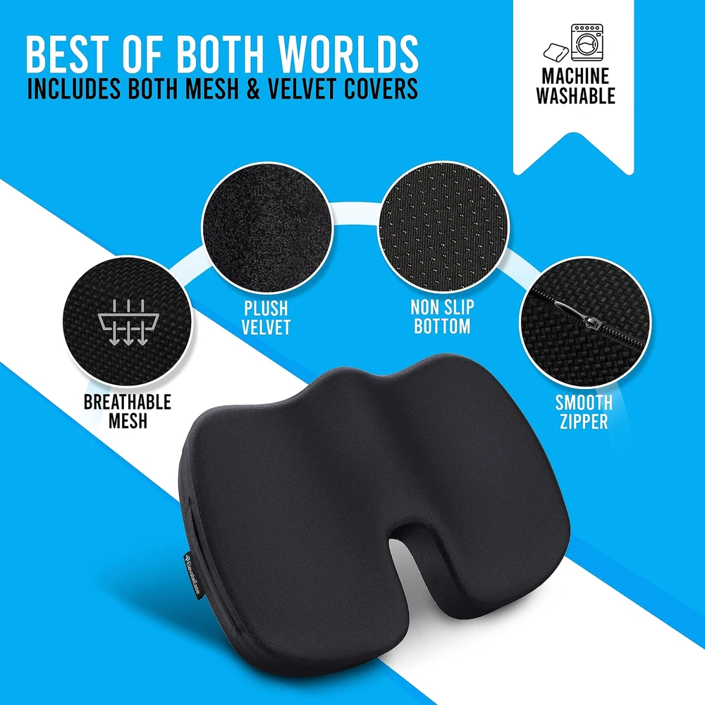 SUPPORTIVE SEATING SOLUTION –– Experience daily spinal support with the pressure relief seat cushion. Crafted from high-density memory foam cushion material, it seamlessly molds to your body shape, relieving lower back, tailbone, and sciatica discomfort. The innovative U-shaped design of our ergonomic seat cushion makes enduring sitting durations significantly more comfortable. AIRFLOW & COZINESS WITH UNIQUE COVERS –– Our memory foam seat pad is outfitted with two easy-to-remove, machine washable covers. The breathable mesh cover promises optimal airflow for a desk chair cushion that stays cool. Simultaneously, the plush velvet cover adds an extra level of coziness and a luxury feel to your office seat cushion. ENCOURAGES HEALTHIER POSTURE –– Employ our memory foam seat cushion for chair for added pelvic support, enabling a slight forward tilt to prevent slouching. This office chair pad combines firmness and responsiveness for a stable seating surface. Mitigate muscle tension and fatigue with the supportive benefits of our tailbone cushion. TRAVEL-FRIENDLY BACK SUPPORT –– Bring this versatile cushion for office chair to long commutes, overnight flights, office meetings, or even for at-home relaxation. The integrated handle on our computer chair cushion ensures portability, while the non-slip bottom keeps your coccyx cushion secure on any seating surface. LIFETIME WARRANTY FOR ENDURING SUPPORT –– Improve your comfort with our tailbone pillows for sitting during extended periods. Whether it's during pregnancy, recovery from surgery, long-distance journeys, daily work, or simply reading or watching a movie, our tailbone cushions for pressure relief provide consistent comfort. We back the lasting quality of our products with a Lifetime Warranty, making your purchase worry-free.