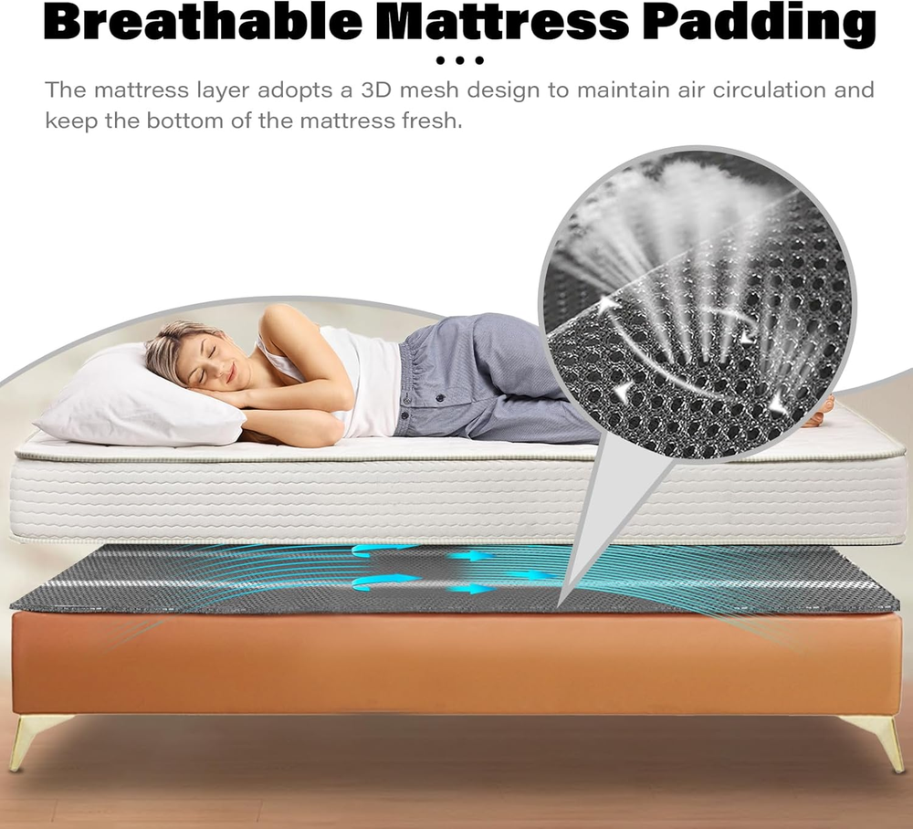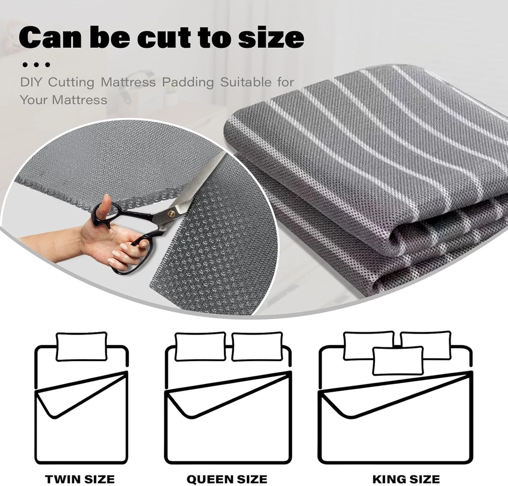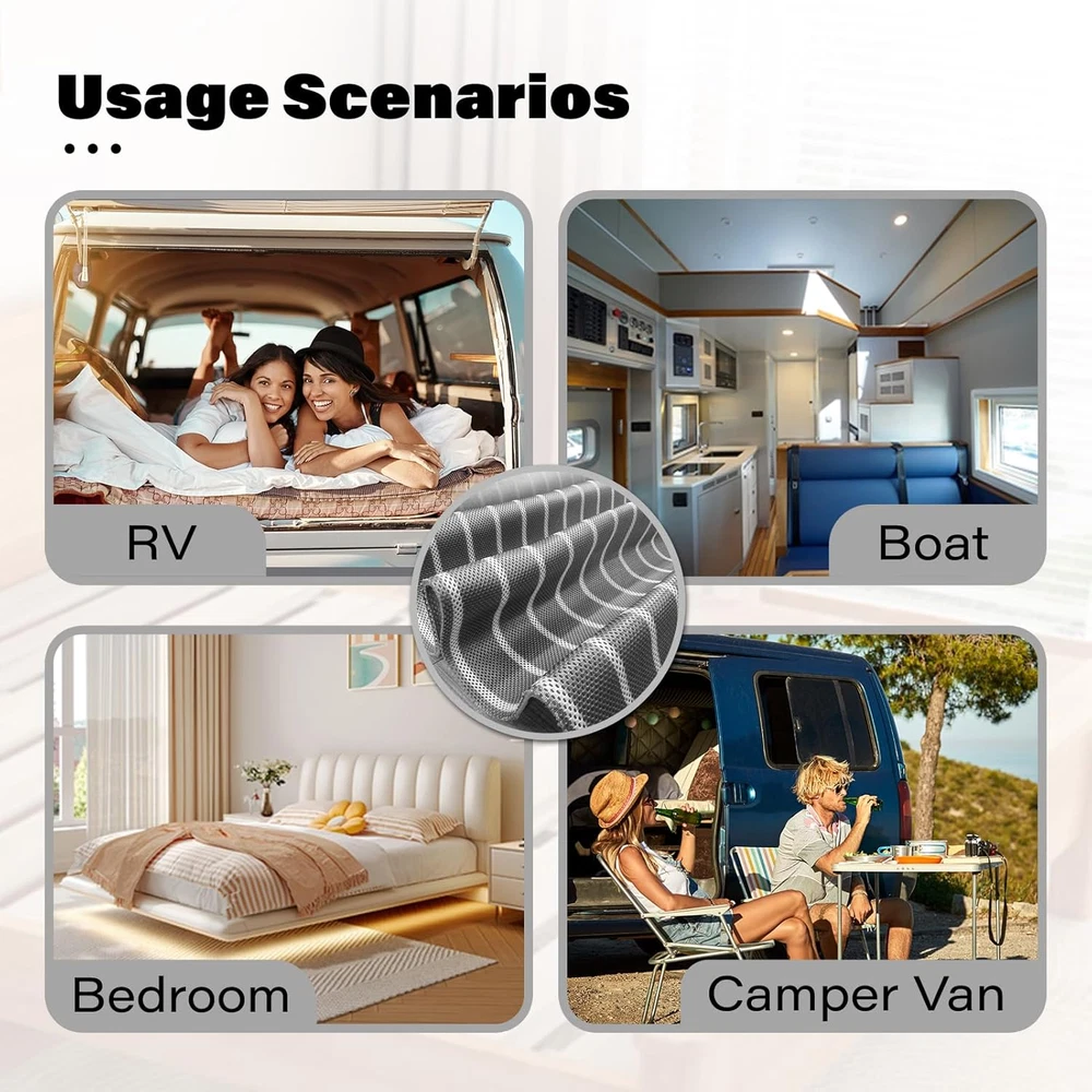 DOUBLE LAYER BREATHABILITY DESIGN: The mattress underlay is designed with double-layer breathable holes, the surface is large honeycomb breathable holes, and the bottom is 3D mesh breathable holes, air circulation keeps your mattress dry. POLYPROPYLENE MATERIAL: The Under mattress pad is made of polypropylene material, three layers of fiber fabric, can support more than 3,000 pounds of weight, strong resilience, not easy to deform. Breathable and can be reused many times. LARGE SIZE AND CUTTABLE: The size of our RV under mattress ventilation is 118.1in L*39.3 in W*0.3 in H, the large size can meet your daily needs. The size of the RV liner can be DIY cut to fit Queen, King and Twin mattresses. MULTIPLE USES: Our hypervent aire-flow mattress underlay can be widely used in bedrooms, RVs, boats, and campers to keep away from moisture and keep your mattress dry. Can be used in all kinds of weather, keep your underbed airflow and stay clean. LIGHTWEIGHT AND EASY TO INSTALL: Our mattress underlay is very lightweight, foldable and portable, easy to install, just lay it on the bottom of the mattress and use it, bring you a comfortable sleeping experience. Product Description
