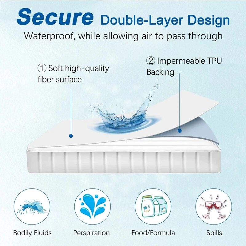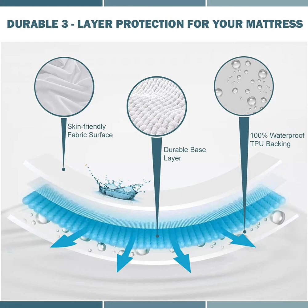 In order that the product you purchase is suitable for your furniture, please check the size before placing an order. Size guide: Please check you mattress size widthlength thickness 80x200x30 cm = 31.49x78.74x11.8 inch = 2.62x6.56x0.98 ft 90x200x30 cm = 35.43x78.74x11.8 inch = 2.95x6.56x0.98 ft 100x200x30 cm = 39.37x78.74x11.8 inch = 3.28x6.56x0.98 ft 120x200x30 cm = 47.24x78.74x11.8 inch = 3.94x6.56x0.98 ft 140x200x30 cm =55.11x78.74x11.8 inch = 4.6x6.56x0.98 ft 150x200x30 cm = 59.06x78.74x11.8 inch = 4.92x6.56x0.98 ft 160x200x30 cm=63.00x78.74x11.8 inch= 5.25x6.56x0.98 ft 180x200x30 cm = 70.87x78.74x11.8 inch = 5.9x6.56x0.98 ft 200x200x30 cm = 78.74x78.74x11.9 inch = 6.56x6.56x0.98 ft 200x220x30 cm = 78.74x86.61x11.8 inch = 6.56x7.22x0.98 ft 152x203x46 cm = 59.84x79.92x18.11 inch = 4.99x6.66x1.51 ft 193x203x46 cm = 75.98x79.92x18.11 inch = 6.33x6.66x1.51 ft If you have any questions about the size of the product, please feel free to contact customer service. There may be slight errors in manual measurement, which is normal. Note:This product does not include pillow cases. If you need pillow cases, please contact customer service personnel. Product Description: Ordinary mattresses cannot stop the hair, dander and body fluids that accumulate in the mattress from coming into contact with your body. This waterproof mattress surface using spring yarn fabric, it feel soft and smooth, fine and flat, no heavy feeling. The bottom layer of TPU waterproof membrane, blocking hair, and protect your health. At the same time, no worry about children and pets wet your mattress. Enjoy deep sleep. Machine washable, convenient and easy to take care of. Washing instructions: Do not use the iron directly, do not dry clean and bleach. Can be machine washed and hand washed normally, water temperature should be below 30 degrees. When machine washing, it is recommended to put the product in a laundry mesh bag, do not wash it together with zippers and other hard objects to avoid damage. Moisture-absorbing, waterproof, anti-bacterial and anti-mite, guarding the health of you and your family. Multiple colors, Multiple choice.