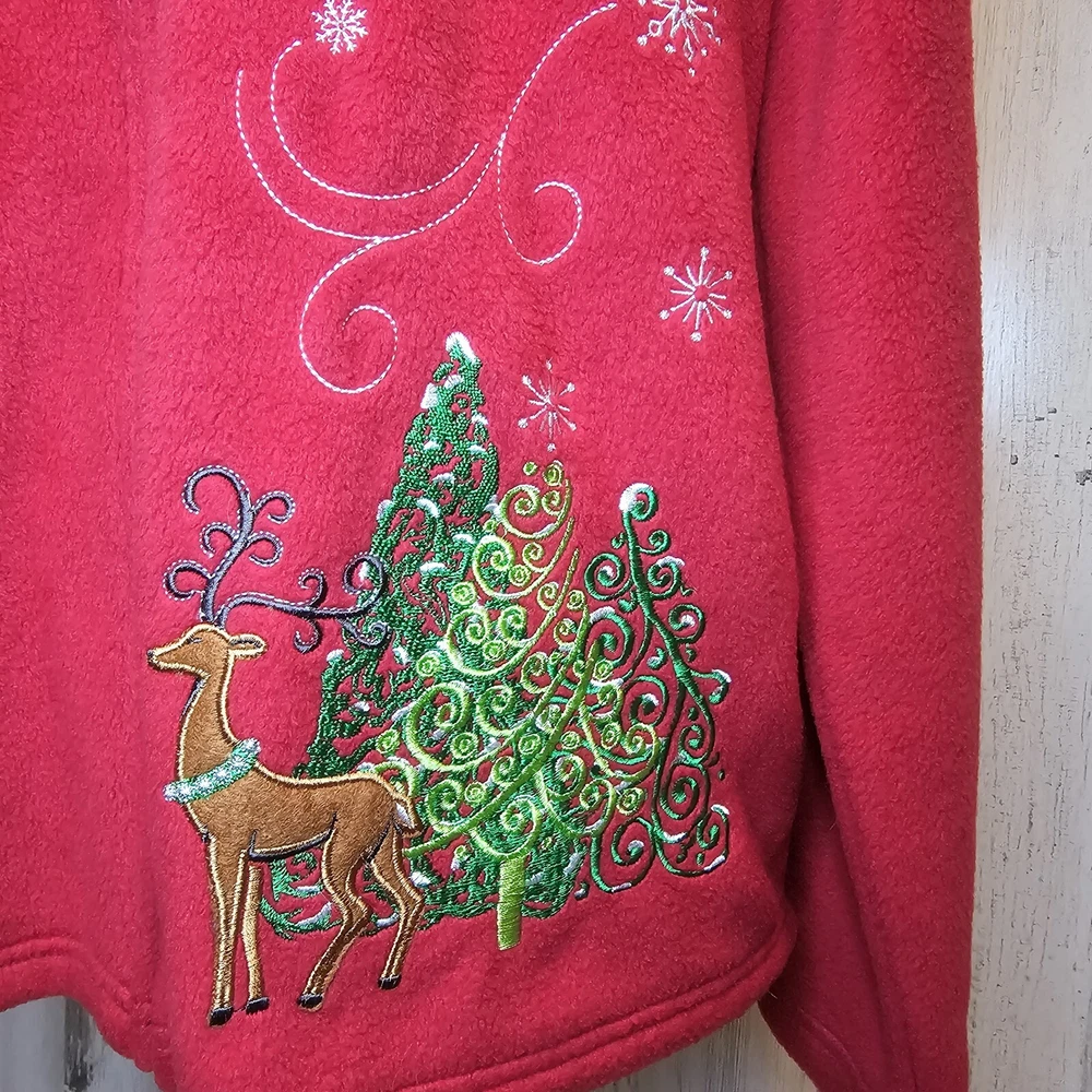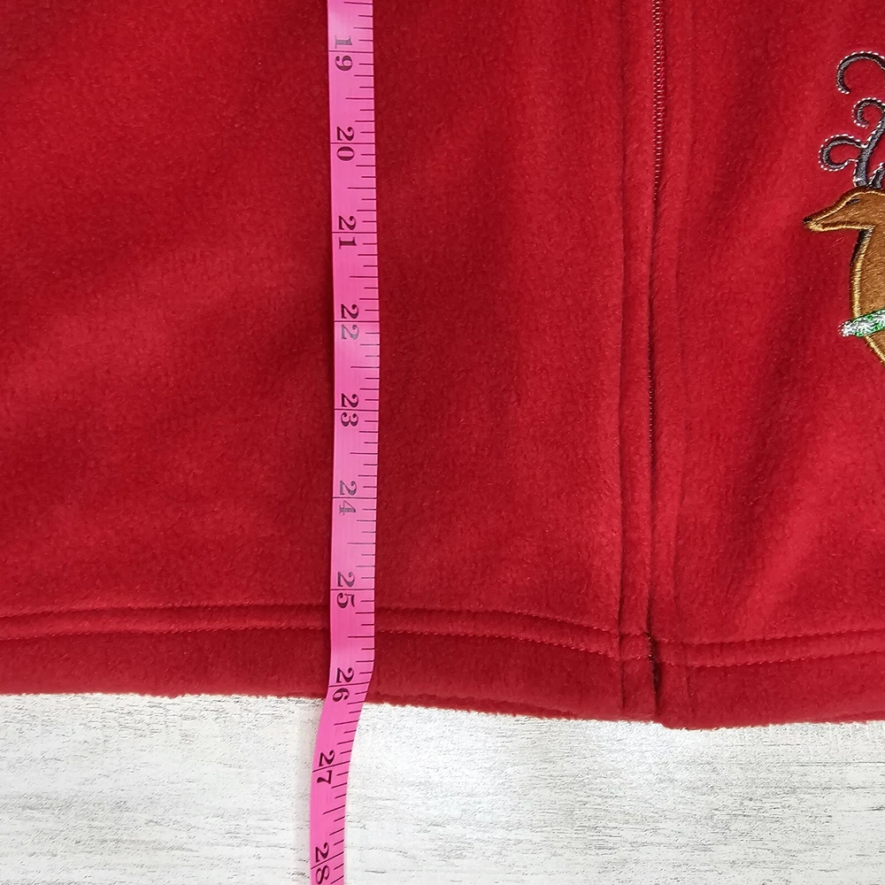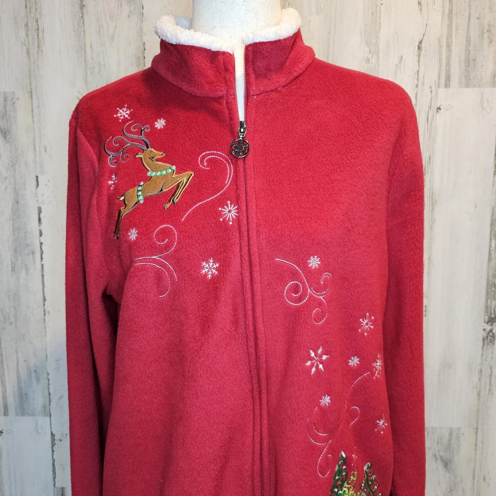 Celebrate the holiday season in style with this festive Breckenridge red fleece jacket. Designed for warmth and charm, it features a cozy sherpa-lined collar and intricate embroidered details, including a prancing reindeer, Christmas trees, and snowflakes. Perfect for holiday gatherings or casual winter outings. Brand: Breckenridge Size: Large (Women's) Material: 100% Polyester Color: Red Features: Sherpa-lined collar for added warmth Full-zip front with decorative pull charm Embroidered reindeer, Christmas trees, and swirling snowflakes Side pockets Measurements: Bust (pit to pit): Approx. 21 inches Length (shoulder to hem): Approx. 26 inches Condition: Pre-owned, gently worn, in excellent condition with no noticeable flaws. #BreckenridgeJacket #ChristmasJacket #RedFleeceJacket #SherpaCollar #HolidayFashion #ReindeerEmbroideredJacket #ChristmasGiftIdea #WinterWardrobe #WomenLarge