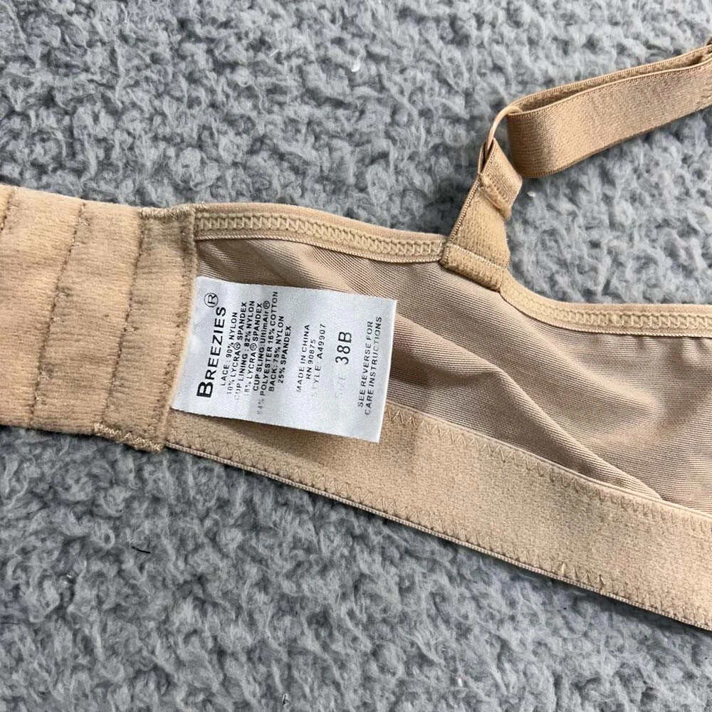 Style: Full Coverage Size: 38B Department: Women Brand: Breezies Closure: Hook & Eye Vintage: NO Fabric Type: Woven Season: Spring, Summer, Fall, Winter Cup Size: B Color: Beige Opacity: Opaque Underwire Type: Wireless Pattern: Solid Garment Care: Hand Wash Only Strap Type: Bra Strap Type: Bra Band Size: 38 Material: Nylon Blend Product Line: 49907