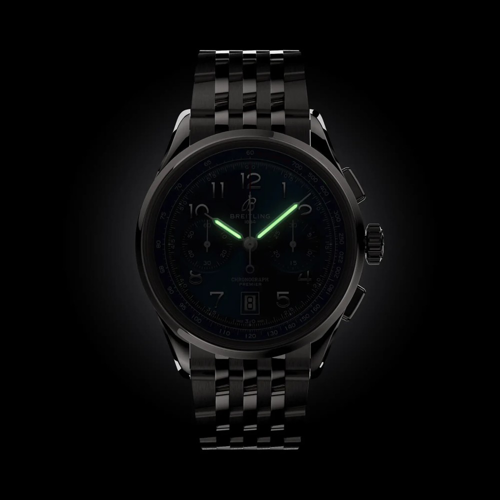 This BRAND NEW Premier 42mm Premier B01 Chronograph wristwatch by Breitling is a stylish timepiece with a green dial featuring Arabic numerals on a sunburst pattern. This unisex watch has a stainless steel case and bracelet, with a silver bezel and a water resistance of 100m. The chronograph feature, date indicator, and self-winding movement make it a practical and functional accessory for everyday wear. It comes with original box, papers, and a manual, making it a complete package for the sophisticated watch enthusiast.
