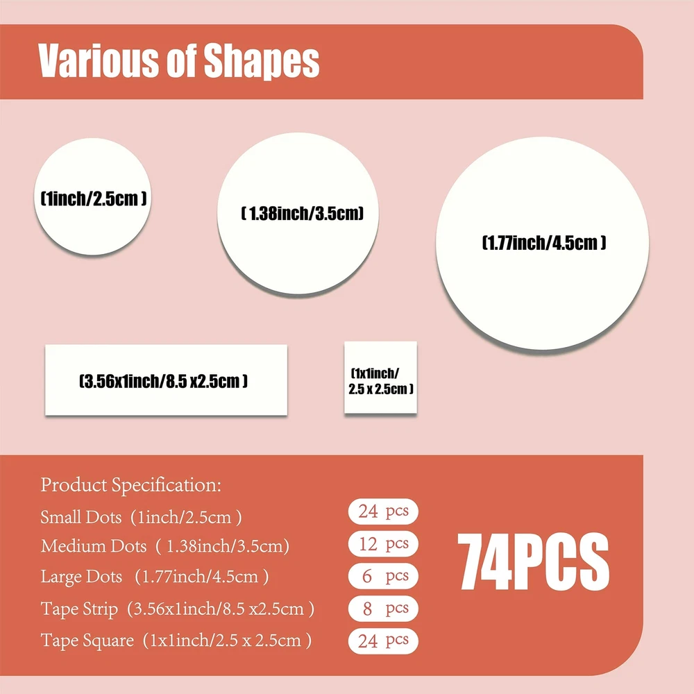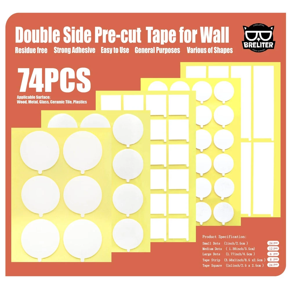 Breliter 74Pcs Pre-cut Double Sided Tape for Wall Strong adhesive Easy to use Various of shape Residue Free Product Specification: Small Dots ( 1inch/2.5cm ) Medium Dots ( 1.38inch/3.5cm ) Large Dots ( 1.77inch/4.5cm ) Tape Strip ( 3.56 x 1inch/8.5 x 2.5cm ) Tape Square ( 1 x 1inch/2.5 x 2.5cm ) Attention: Please note that these double sided tape can't apply on flaky dry wall, it may cause damage to the paint since the strong grip adhesive, careful consideration should be given before using it on painted wall. No More Painful Backing Paper - Feel frustrated when peeling release paper? Try our double sided tape with easy remove tabs, easy to peel and use! No more spending forever time trying to peel the paper off, save your time and effort effectively. Strong Adhesive Acrylic Material - Made of soft acrylics, transparent, flexible, durable and with great adhesion, suitable for hanging and pasting small and medium-sized objects. Come with various double-sided sticky dots, rectangles and squares shapes, meet your daily different needs. Residue Free - Our removable transparent double-sided tape have strong oneness performance, not easy to fall off after pasting. Compatible with glass, plastic, metal, wood, ceramic tile and other smooth surface. Able to be removed or repositioned without leaving nasty stains or sticky residue. Wide Application - Our multipurpose adhesive tape can be used to fix pictures, posters, photos, paintings, balloons, hooks, carpets, sockets, crafts, decorations, etc. Suitable for home, office, school, party and other occasions. You will get 74pcs pre-cut double sided tape including 42 circles in 3 sizes, 8 strips, and 24 squares. SATISFACTION GUARANTEED : Breliter stand behind our products 100% and if for any reason you are not completely satisfied, simply contact us and we'll make it right.