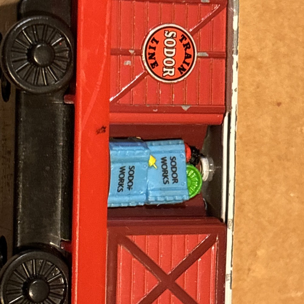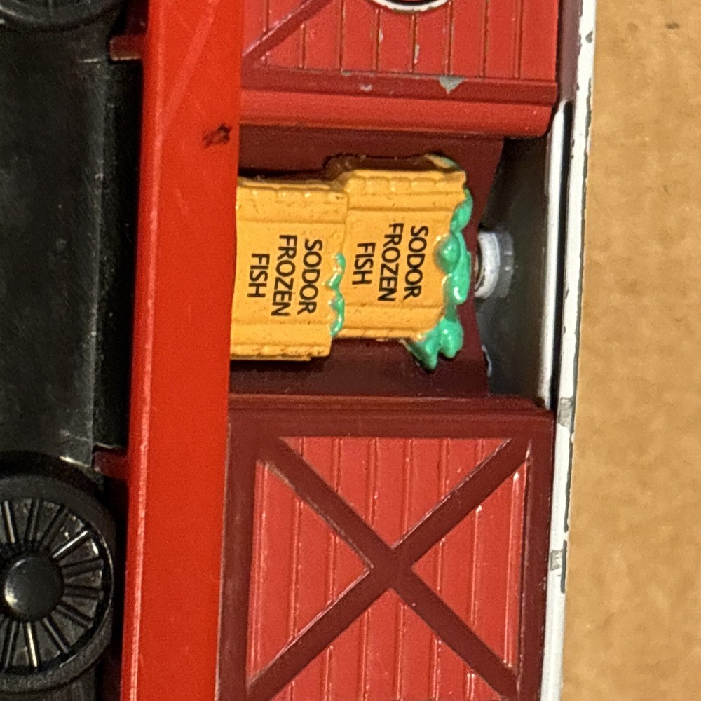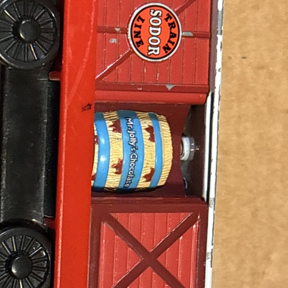 Sodor Train Line Brendam Shipping Cargo Carg with door that open and closes, and each time rotates a different of three cargos looks - Sodor works, sodor frozen fish, & Mr Jolly’s chocolate. Diecast Thomas & Friends Train Tank Engine Metal see photos. One big paint scratch on top. Ships usps ground advantage.