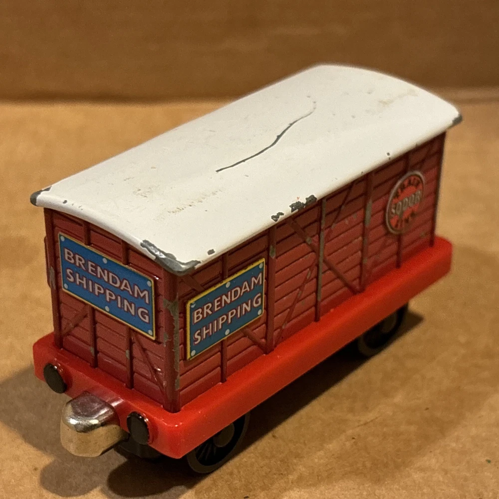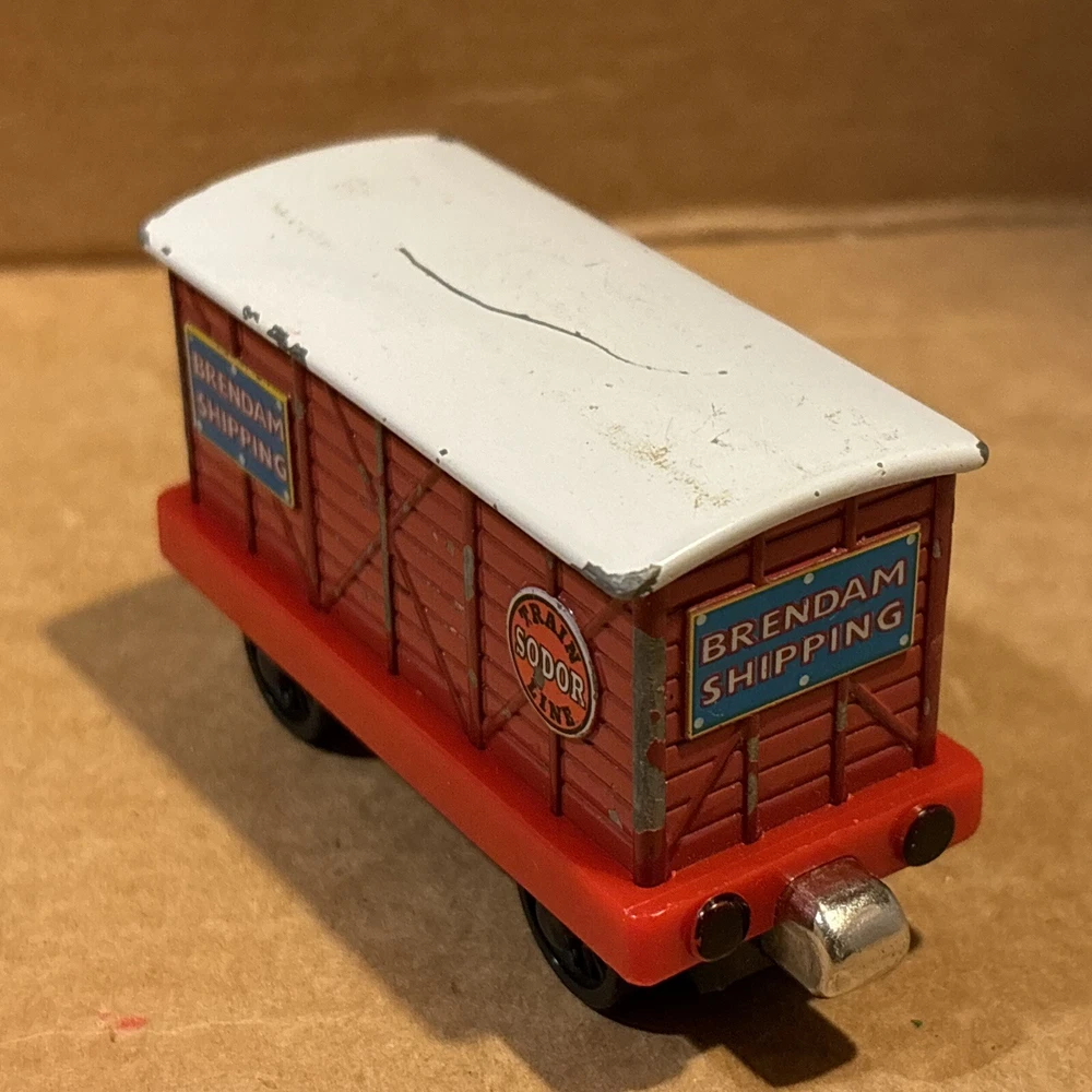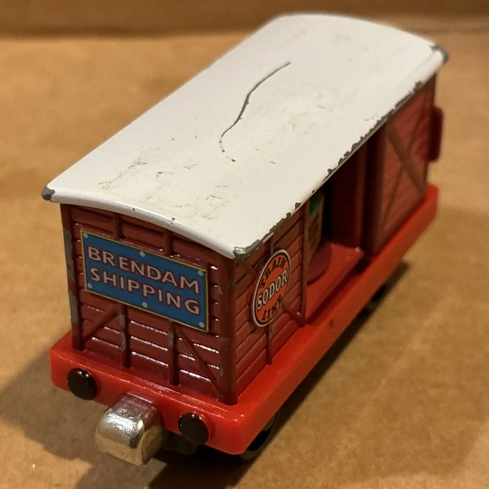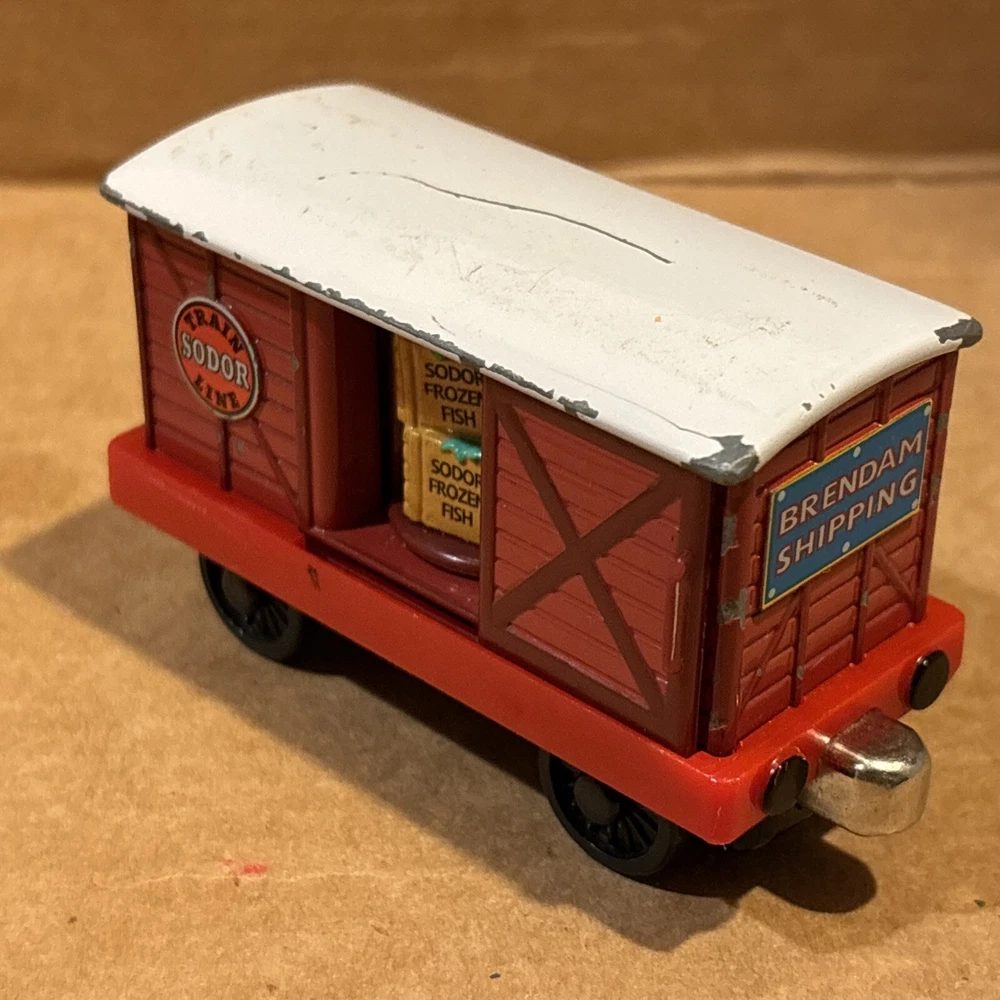 Sodor Train Line Brendam Shipping Cargo Carg with door that open and closes, and each time rotates a different of three cargos looks - Sodor works, sodor frozen fish, & Mr Jolly’s chocolate. Diecast Thomas & Friends Train Tank Engine Metal see photos. One big paint scratch on top. Ships usps ground advantage.