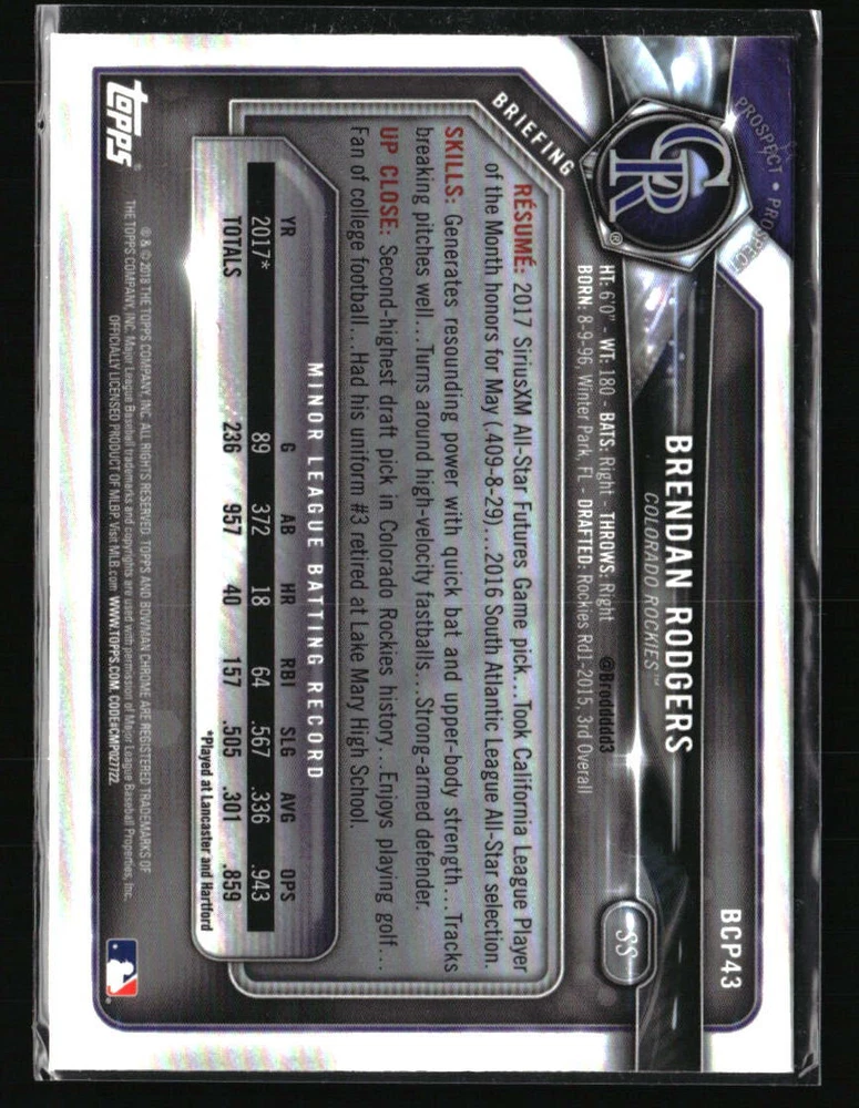 Graded: No Set: Bowman Card Number: BP43 Type: Sports Trading Card Autographed: No League: MLB Sport: Baseball Player/Athlete: Brendan Rodgers Team: Colorado Rockies Manufacturer: Bowman Season: 2018 Year Manufactured: 2018 Parallel/Variety: Prospects