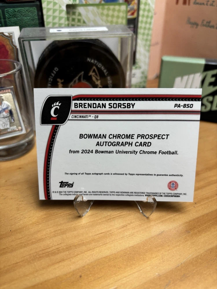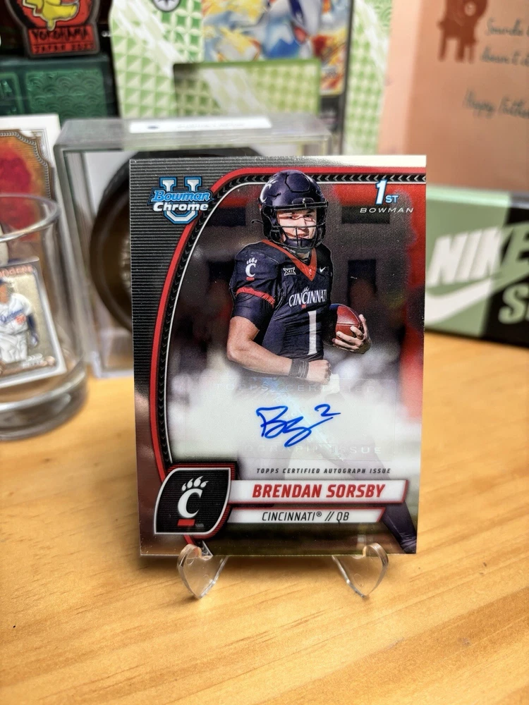 This autographed sports trading card features Brendan Sorsby of the Cincinnati Bearcats football team. The card is a Bowman University Autograph Chrome variation and is in excellent shape, near mint or better. It is a great addition to any sports memorabilia collection, especially for fans of the National Collegiate Athletic Association (NCAA). The card is perfect for those who appreciate the athleticism and skill of Brendan Sorsby, as well as for collectors of sports trading cards. The autograph adds value to the card and the chrome variation makes it a unique piece. Don't miss the opportunity to own this exceptional item.