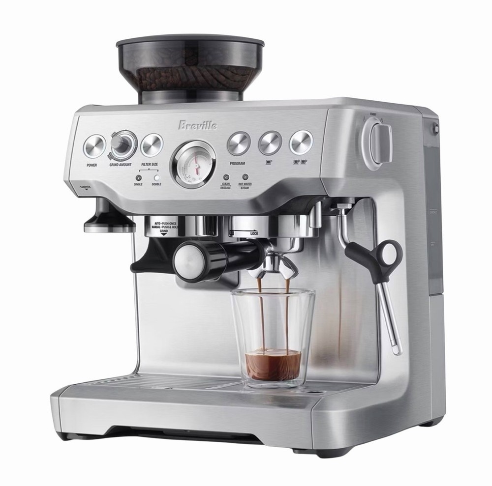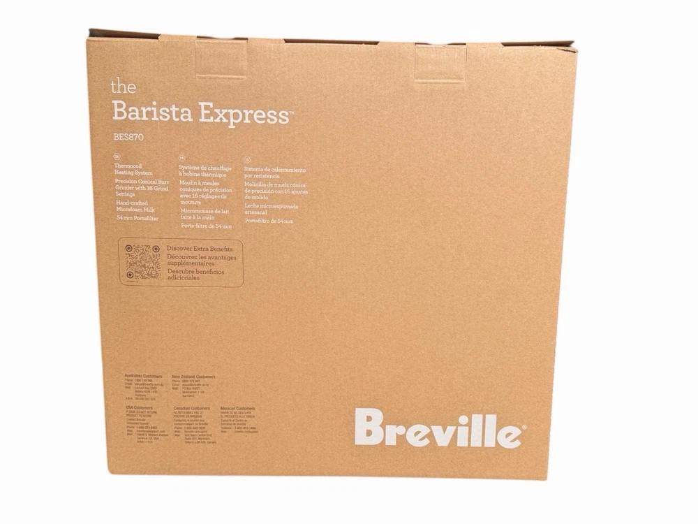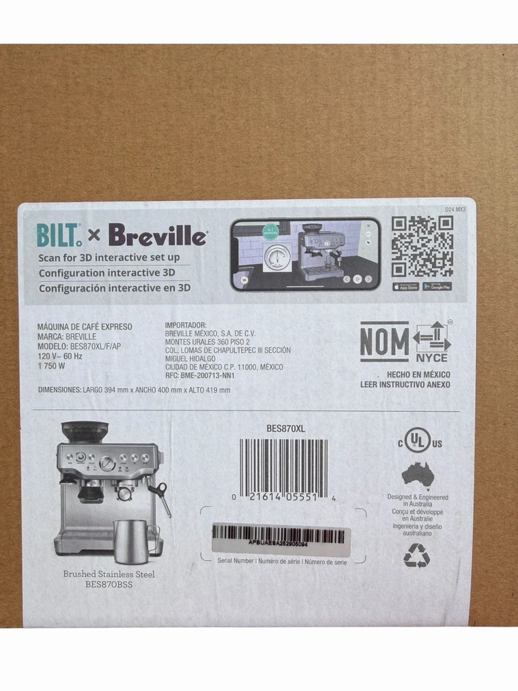 Brand New – in original shipping and retail cartons DESCRIPTION: Breville Barista Express espresso machine Model: BES870XL / Brushed Stainless Steel BES870BSS Built-in conical burr grinder with 16 grind settings Thermocoil heating system 54mm portafilter Hands-free grinding cradle Made in Mexico Designed and engineered in Australia WHAT’S INCLUDED (per retail box contents): – BES870XL espresso machine – Portafilter – Filter baskets – Water tank with filter – Tamper – Milk jug – Manuals also included in box UPC: 021614055514 Power: 120V / 60Hz / 1750W