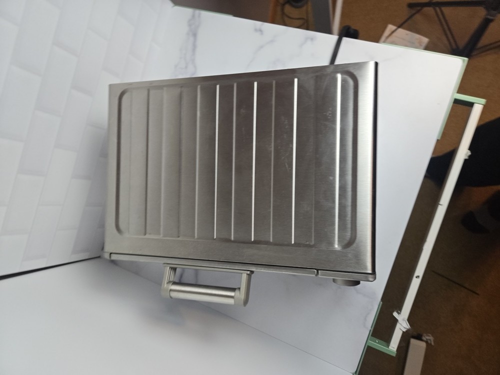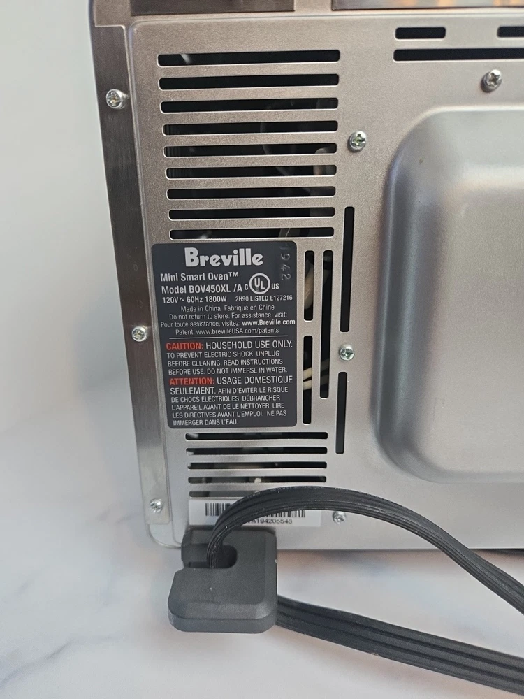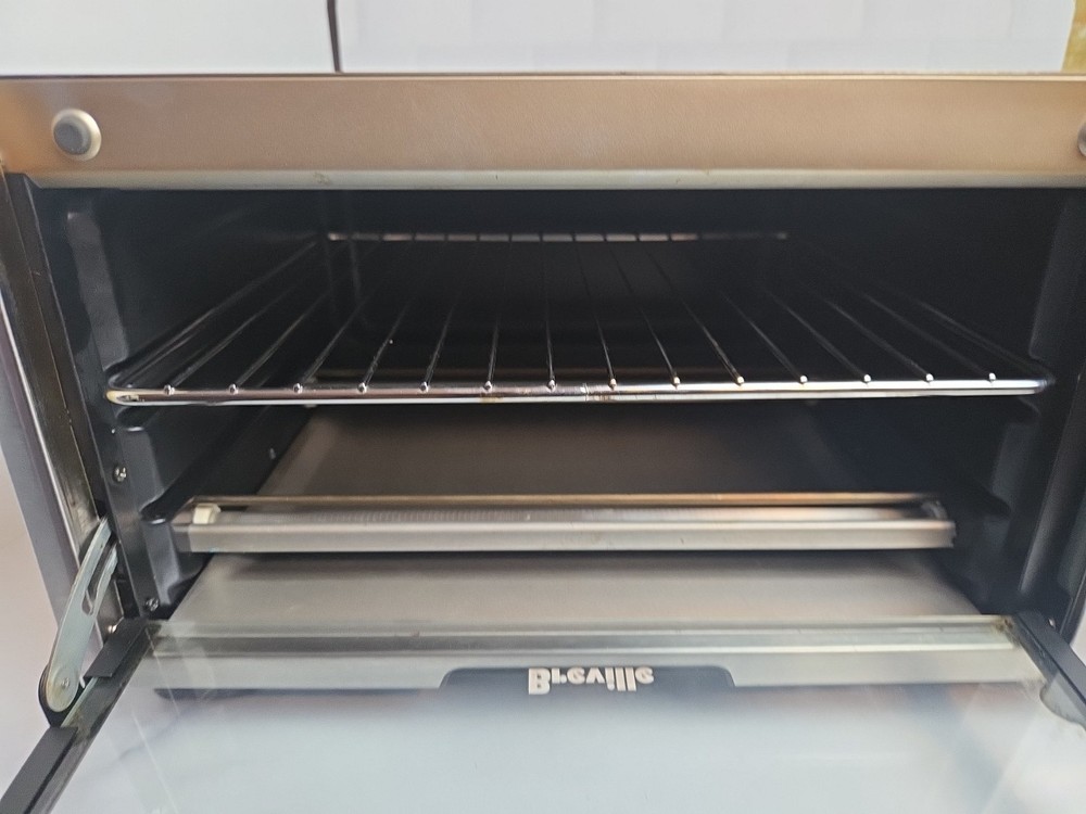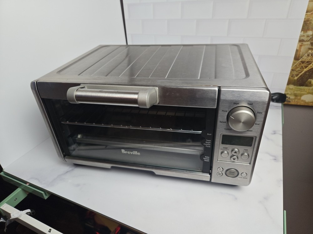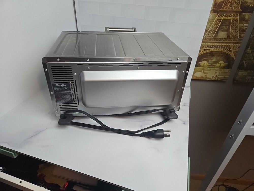This Breville BOV450XL Mini Smart Oven is a compact toaster oven made of stainless steel in a silver brushed finish. It has a maximum timer setting of 220 minutes and operates on 120 volts of power. With a power of 1800 watts, this toaster oven can toast, broil, and bake various foods. It features a pizza bake function, portable design, removable drip tray, auto shut-off, adjustable racks, and a non-stick interior.