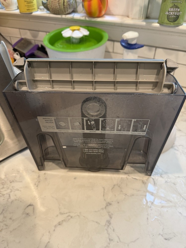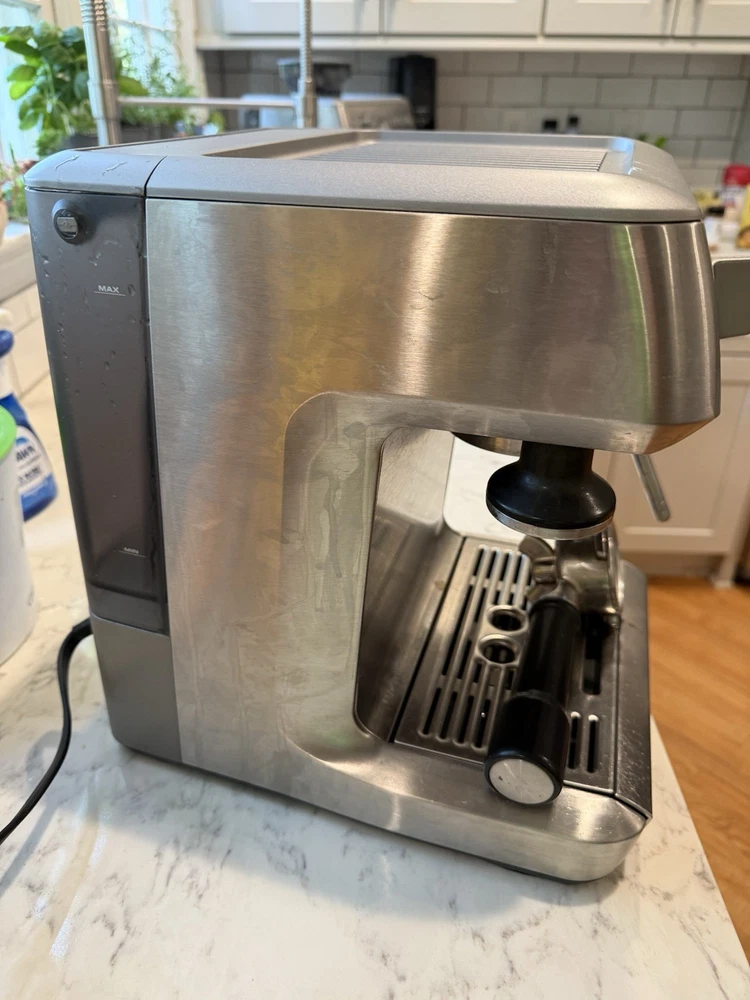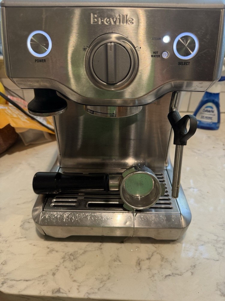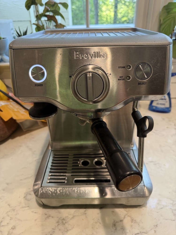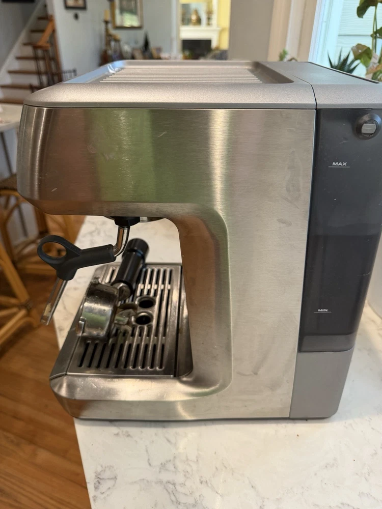 Color:SilverControl Panel:AnalogBrand:BrevilleFinish:MatteCompatible Water Filtration:AquacleanComponents Included:Drip TrayMaterial:Stainless SteelManufacturer Warranty:1 YearFeatures:Water TankType of Coffee Made:EspressoHeat up Time:20-25 secNumber of Cups:1Water Tank Capacity:2 qtModel:bes810bssType:Espresso MachinePower Source:Electrical
