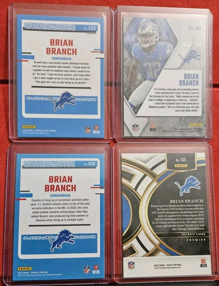 Brian Branch 4 card rookie Lot 1 donruss press proof blue 1 donruss optic green velocity 1 phoenix fire burst 2/340 1 select premier level base