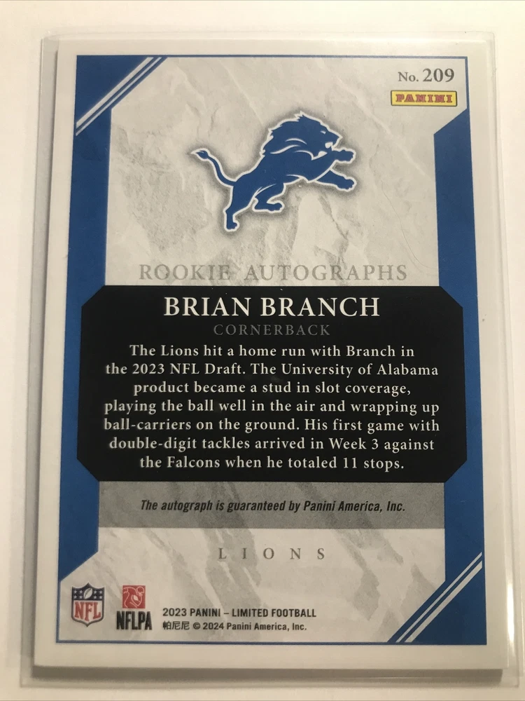 Brian Branch 2023 Panini Limited ROOKIE RC AUTO SP DETROIT LIONS AUTOGRAPHS /199. Condition is Ungraded. Shipped with USPS Ground Advantage.