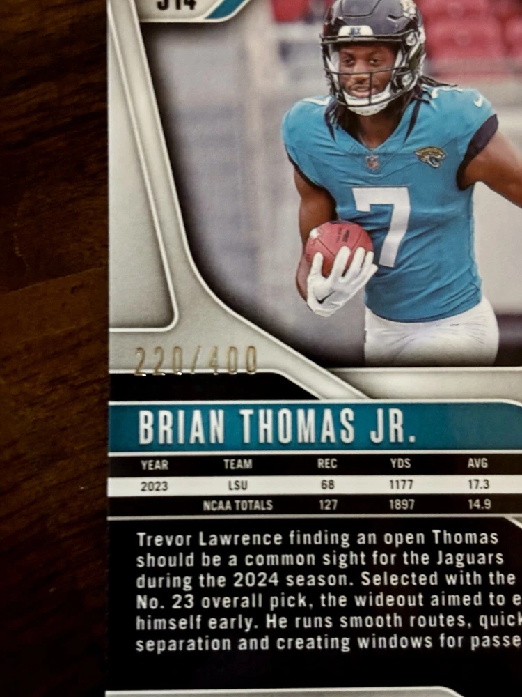 Sport:FootballTeam:Jacksonville JaguarsParallel/Variety:Pandora PrizmFeatures:Exclusive, Parallel/Variety, Rookie, Serial Numbered, Short PrintSet:2024 Panini PrizmSeason:2024Type:Sports Trading CardPrint Run:400Manufacturer:PaniniPlayer/Athlete:Brian Thomas Jr.Card Number:314League:National Football League (NFL)