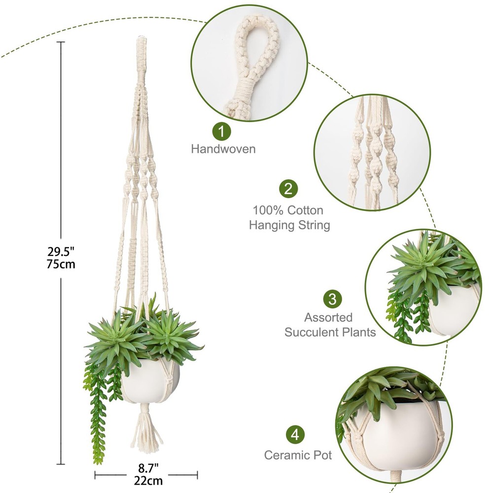 Realistic-looking Faux Hanging Succulents ---The potted succulents picks combine 2 assorted succulents (3 draping strings of pearls, 3 large lotus succulents). The potted succulents are crafted with attention to detail, featuring lifelike foliage that closely resembles natural succulent plants, adding a touch of greenery to your space. Boho-Inspired Hanging Design --- Our faux succulent plant hanging string is about 75cm/ 29.5 inches long and is made of natural cotton rope. Elevate your decor with the Boho style Cotton Hanging String, providing a trendy and unique way to display these faux plants. The macrame planter adds a chic and contemporary touch, making it a perfect fit for various decor themes. Perfect Size & Durable Material --- The succulents are nestled in a stylish ceramic pot ( 8.7" in diameter and 3.7" in height), adding an element of sophistication to the overall design. Crafted from high-quality plastic material, these hanging succulents boast durability and resilience. No Maintenance Required --- The fake succulents require no maintenance or care and can maintain a fresh appearance throughout all seasons. Making these plants perfect for workaholics, and safe around children and pets. Briful hanging succulents are a great choice of gift for family and friends who love succulent plants or keep them in your own home for a touch of clean, modern, boho style in your living space. Versatile Wall-Hanging Decor --- The hanging succulents are a great way to add a modern decorative touch and natural greenery to your living space. Ideal for hanging in offices, bathrooms, bedrooms, living rooms, balconies, or any other darker areas of the home or office and places that don't have the benefit of natural daylight.