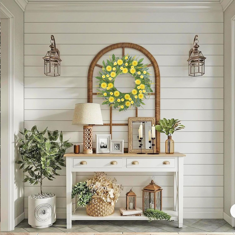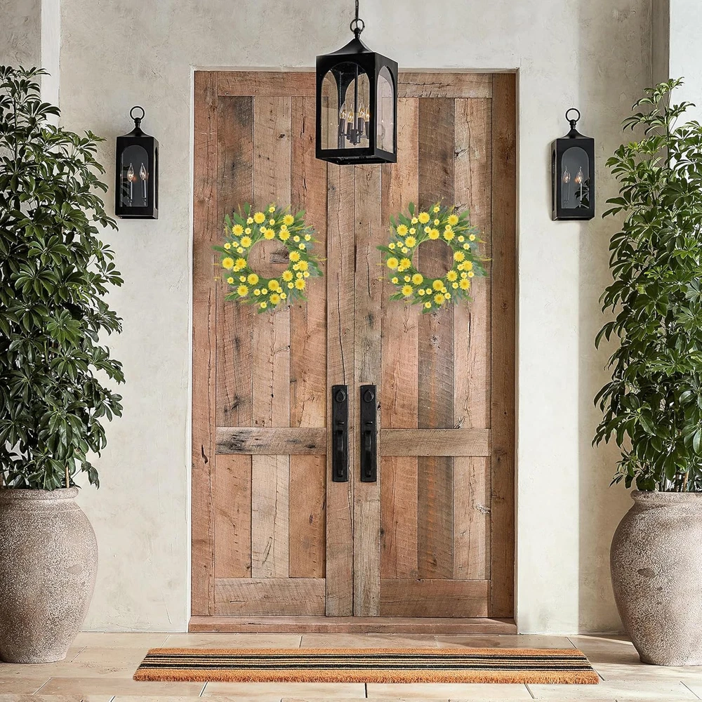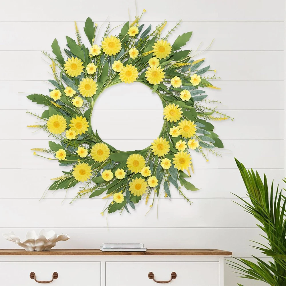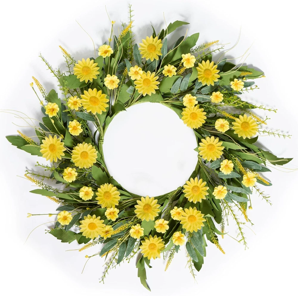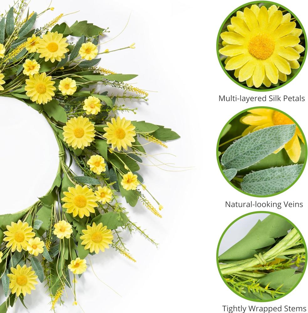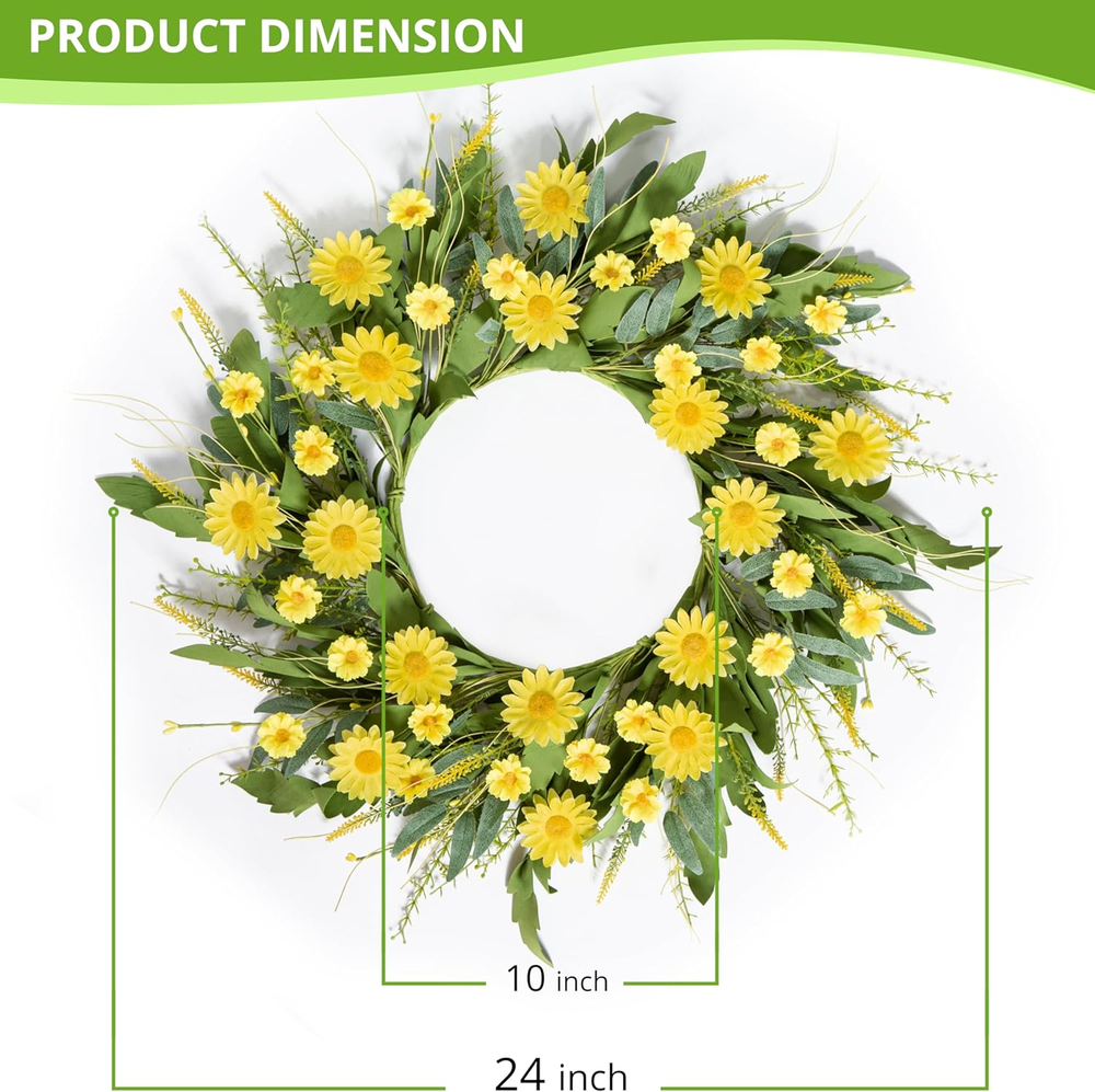 Vibrant Seasonal Design: Featuring bright yellow daisies of various sizes and lush green leaves, this handmade flower wreath perfectly captures the essence of spring and summer, bringing warmth and cheer to any space. Customizable & Versatile: The decorative door wreath measures 22-24 inches when fully unfolded and can be adjusted to your preferred shape, making it suitable for doors, walls, windows, or table centerpieces for home and event decor. High-Quality Materials: Made from durable and fade-resistant materials, wildflower wreath maintains its fresh and realistic appearance over time, ensuring long-lasting beauty for both indoor and outdoor use. Perfect for Various Occasions: Whether you're decorating for a wedding, a spring/summer party, or simply brightening up your living space, this floral wreath provides a versatile and elegant solution,add a sense of ambiance to your daily life. Customer Satisfaction Guaranteed: We stand behind our products. If you encounter any issues with your wreath, our dedicated after-sales service team is here to provide prompt assistance and ensure your complete satisfaction. Product Description The video showcases the product in use. The video guides you through product setup. The video compares multiple products. The video shows the product being unpacked. Free Stretch This wire frame provides excellent structural support and ensures that the wreath retains its shape over time. Perfect Gifting Choise The spring daisies wreath is meticulously handcrafted using a sturdy wire frame as its base. Its a good choice for gift giving 24 inch Spring/Summer Wreath What is the size of the wreath? What is the size of the wreath? The Inner circle of wreath is 10 inches, spread out leaves are 22-24 inches. Its suitable for front door /window /home porch/ farmhouse/ patio / garden and so on. How can I be sure it will last through the spring/summer season and beyond? We take quality seriously. Our Daisies Flowers wreaths are using durable materials to withstand the elements. If you encounter any issues with the wreath's quality, please let us know, and we'll be happy to assist you I like the wreath design, but can I customize it with different colors or elements? We appreciate your interest in personalizing your wreath! You can create a one-of-a-kind wreath to suit your style and preferences. More Style For Choose SIZE 20IN SIZE 24IN SIZE 20IN SEASON Spring/Summer SEASON Spring/Summer SEASON Spring/Summer