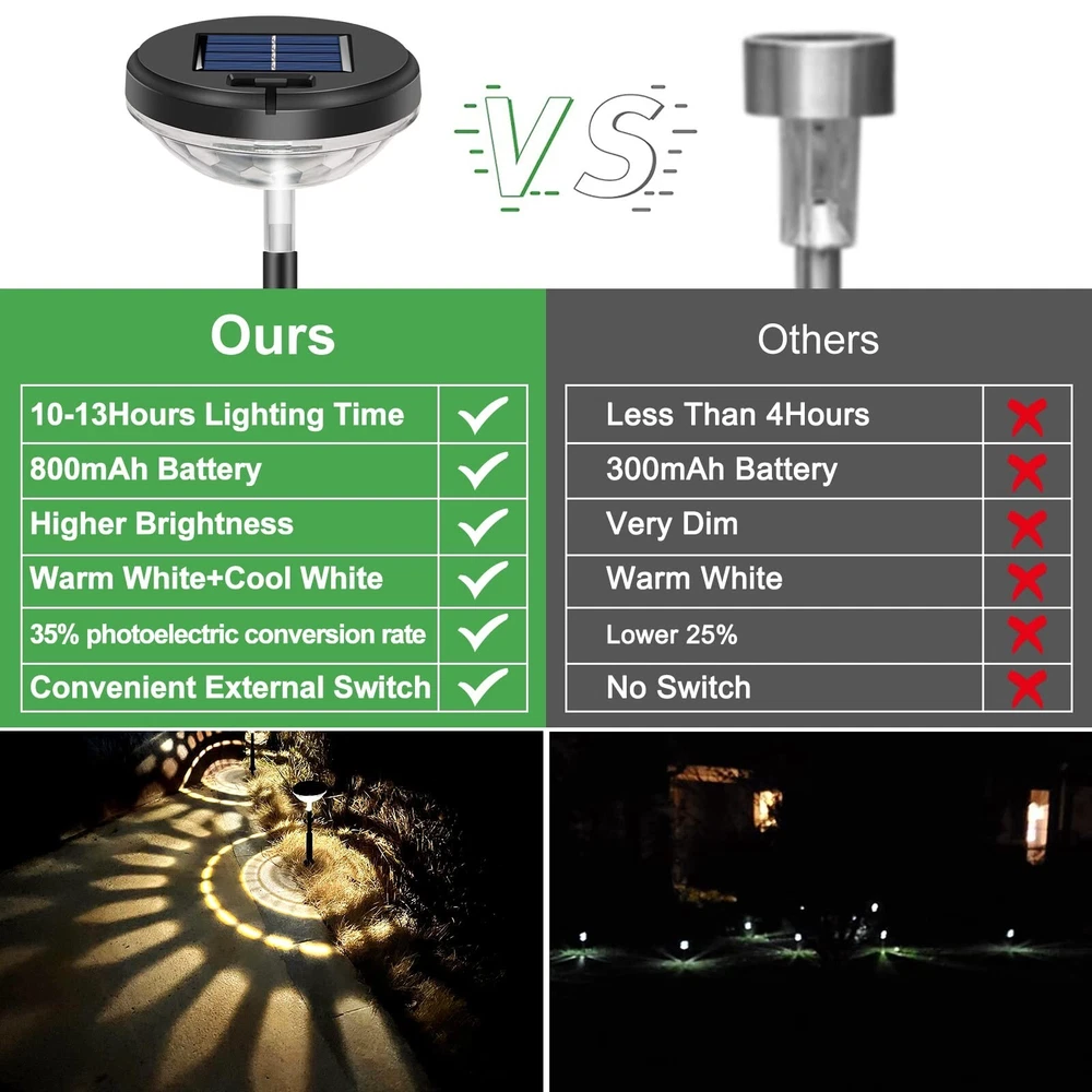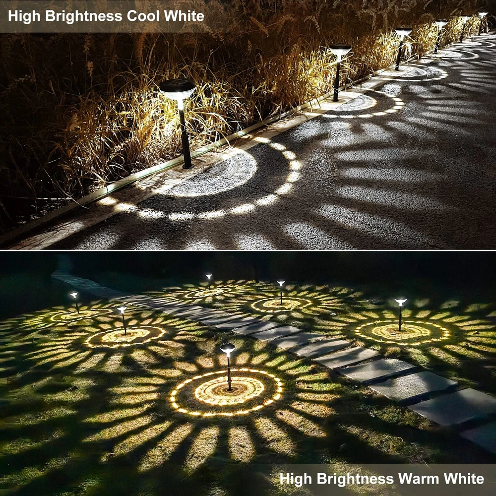 Bright Solar Pathway Lights 8 Pack, Warm White + Cool White LED Outdoor IP67 Waterproof Solar Powered Garden Lights for Walkway Yard Backyard Lawn Landscape Lighting Decor Product Details Size: 8 Pack Brand: Nupostai UPC: 619317420526 EAN: 0619317420526 MPN: Does not apply Finish Type: Black Painted" or "Black Powder Coated Base Material: Acrylonitrile Butadiene Styrene Product Dimensions: 16.42"D x 16.42"W x 16.42"H Item Weight: 3.42 Pounds Lamp Type: LED Product Dimensions : 16.42 x 16.42 x 16.42 inches; 3.42 Pounds Batteries : 8 AA batteries required. (included) Date First Available : January 31, 2022 Manufacturer : Nupostai Customer Reviews: 4.5 4.5 out of 5 stars 1,048 ratings Finish Type: Black Painted" or "Black Powder Coated Base Material: Acrylonitrile Butadiene Styrene Product Dimensions: 16.42"D x 16.42"W x 16.42"H Item Weight: 3.42 Pounds Lamp Type: LED Shade Color: User Selectable(Warm White/ Off /Cool White) Shade Material: High Intesity LEDs,High Capacity Battaries,High-impact ABS,High Efficiency Solar Panel Switch Type: Push Button Style: Solar Pathway Lights for Outdoor Lighting and Garden Decoration Brand: Nupostai Color: Cool white+Warm white Special Feature: Adjustable light pole for different Height, 2 Lighting Mode(Mode 2 and Mode 1 ), Warm White for Lighting, Project a charming and sunflower pattern with larger size, Illuminate and decorate the garden or path Light Source Type: LED Material: Acrylonitrile Butadiene Styrene Room Type: Outdoor Pathway Garden Patio Walkway Driveway Lawn Backyard Flowerbed Fence Porch Wall Pool Balcony Recommended Uses For Product: Decoration Power Source: Solar Powered Shape: Solar Stake Lights with 360° Super Bright Lighting Number of Light Sources: 8 Connectivity Technology: USB Included Components: 8 x built-in Rechargeable Batteries, 8 x Ground Stakes, 8 x Pathway Lights, 1 x Manual Is Waterproof: True Bulb Shape Size: A19 Mounting Type: Ground Mount Number of Items: 8 Lighting Method: 360° Downward Round Pattern Control Method: Remote Indoor/Outdoor Usage: Outdoor Specific Uses For Product: Outdoor Solar Garden Lights decorate and illuminate the Terrance,Yard,Patio,Lawn,Driveway,Pool, Pathway,Balcony,Camping,Steps,Fence,Sidewalk,Flower Bed,Pond, Landscape,Walkway,Path,Backyard,Stairs Water Resistance Level: Waterproof Installation Type: Insert Into Ground or Fixed on Deck Number of Pieces: 8 Efficiency: [INF] High Voltage: 12 Volts (DC) Brightness: 80 Lumen Is Cordless?: Yes UPC: 619317420526 Size: 8 Pack Manufacturer: Nupostai Item Weight: 3.42 pounds Batteries: 8 AA batteries required. (included) Finish types: Black Painted" or "Black Powder Coated Special Features: Adjustable light pole for different Height, 2 Lighting Mode(Mode 2 and Mode 1 ), Warm White for Lighting, Project a charming and sunflower pattern with larger size, Illuminate and decorate the garden or path Plug Format: A- US style Batteries Included?: Yes Batteries Required?: Yes Bulb Features: Sliding Selectable Switch(Mode 2/ Off /Mode 1) Date First Available: January 31, 2022 High Quality&Longer LightingNupostai's solar lights outdoor waterproof use high-quality ABS material are more durable and no rust than cheap solar garden lights.Premium solar panel and build-in 800mAh higher capacity battery which means our solar outdoor lights can collect and store more solar energy,continuous lighting for 9-13hrs after charging for 4-6hours in sun,no need worry about brightness down or stopping work which greatly meets your needs for brightness effect and lighting duration. 2 Lighting Mode&High-BrightnessNupostai's outdoor walkway lights solar powered are designed with 2 light modes(Warm White&Cold White),which use high-power LED lamp beads and high transmittance lampshade make our lights more brighter than ordinary solar path lights,which can be more perfect to cast gorgeous sunflower pattern and decorate your garden,lawn,walkway, flowerbed,making them more beautiful and colorful. 2 Install Ways&Solar Powered&Maintenance-freeNupostai's maintenance-free solar powered outdoor lights is easy to assemble,just turn on the external switch and insert the stakes into ground as a solar ground lights or put it on flat table.solar backyard lights are 100% solar energy,auto absorbs sunlight during the day and auto light up at night,solar lawn lights is specially designed for you and fully practical which saving the workforce and expensive electricity bill. Creative Design&Attractive patternOutdoor solar pathway lights are designed well with adjustable height and convenient external switch,excellent lighting design greatly meets your different lighting and decoration needs,such as halloween and christmas.Solar yard lights with the black exquisite appearance and crystal transparent cover looks more advanced and textured,which casts charming patterm raise your yard grade and house's value,also allow you to enjoy the light shows every night. IP67 Waterproof Use It AnywhereThe new upgrade solar driveway lights use IP67-more advanced sealing and waterproof tech,no need worry about bad rain,snow weather,every solar sidewalk lights has been strictly inspected to ensure long-term use,It's specially designed to illuminate outdoor and walkway far from exterior outlets.Installing solar patio lights means you can spend more outdoor time with your family,garden solar lights is a integral part of landscaping design.