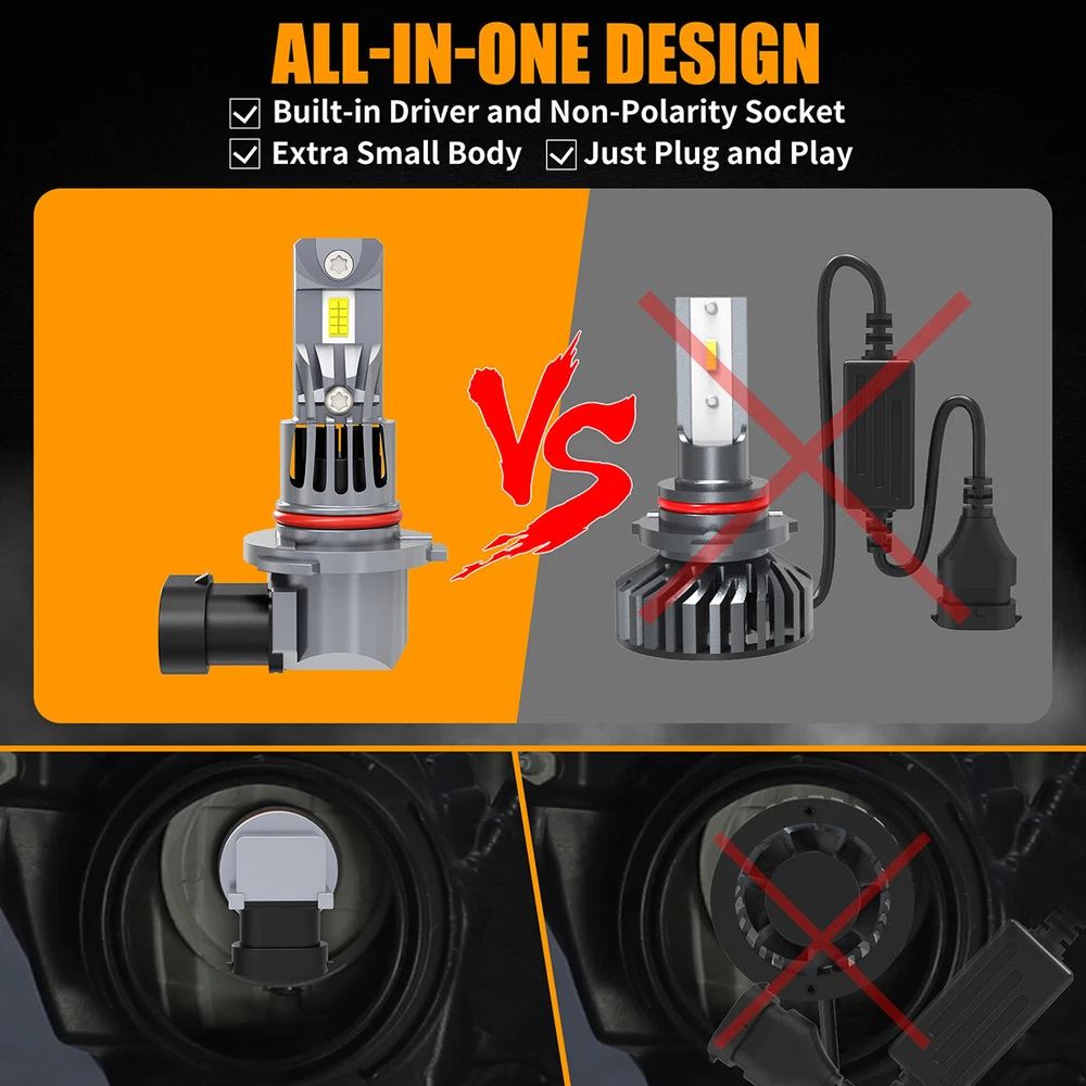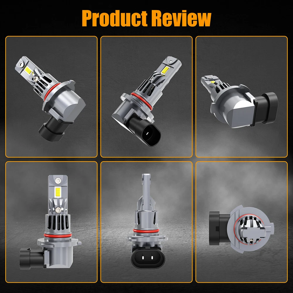 About this item: 【 Better Driving Experience 】The 9005 9006 LED bulbs increase 300% brightness and 100% view, focus beam pattern illuminates reveal road signs, without blinding other drivers 【 450 Feet High Visibility 】 The 9005 9006 bulbs centralized full beams, allowing you clearly see deer off to the side, avoid repair work and accident, take it easy through rural areas, deserted highways 【 5 Years Lifespan 】With heatproof glass coating chips, the bulbs can perform well even you drive 12 hours every night, it lasts 3 times longer than halogen, not dim within 5 years 【 10 Minutes Installation 】0.5-inch ultra-thin heat sink, fit for 99% of cars, even with a dust cover. Replace old broken bulbs by yourself can saving your precious time to repair 【 6500K Eye-Protection Color 】6500K Cool White, the vision is crisp clearer than 3500K Halogen, the color is more comfortable than 6500K Bluish light, reduce eyestrain in nighttime driving Product Details: Model: 9005 9006 Voltage: DC12~30V Power: 40W Lumen: 4000LM Color Temperature: 6500K White LED Chips: AUIMSOCO customized CSP LED chips Material: aluminum Lifespan: 30,000 hours Waterproof Rate: IP67 Operating Temperature: -45℃~+150℃ Color: White(As the picture shows) Placement on Vehicle: Front, Left, Right Heat Dissipation Principle: Heat Pipe Technology + Aluminum Radiator + Fan cooling Packing Including: 4x 9005 9006 LED Headlight Bulbs Install Caution: 1. As a safety precaution, make sure that the car has had time to cool down properly before starting the installation process. 2. Put the vehicle into park or make sure it is securely in gear. 3. Make sure to have the ignition turned off and the keys removed. 4. Be careful to avoid burns, especially when turning on or off the vehicles lighting. 5. Be careful to avoid crushing or cutting the bulbs. Also make sure to not touch the bulbs with your fingers, as this will cause blotting. 6. Fully examine the connection of the contact points, ports and the wires as faulty connections can cause lighting problems. 7. Make certain that the end of the bulb does not come in contact with the interior light shield of the headlight when adjusting the bulb.
